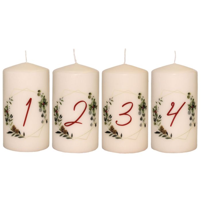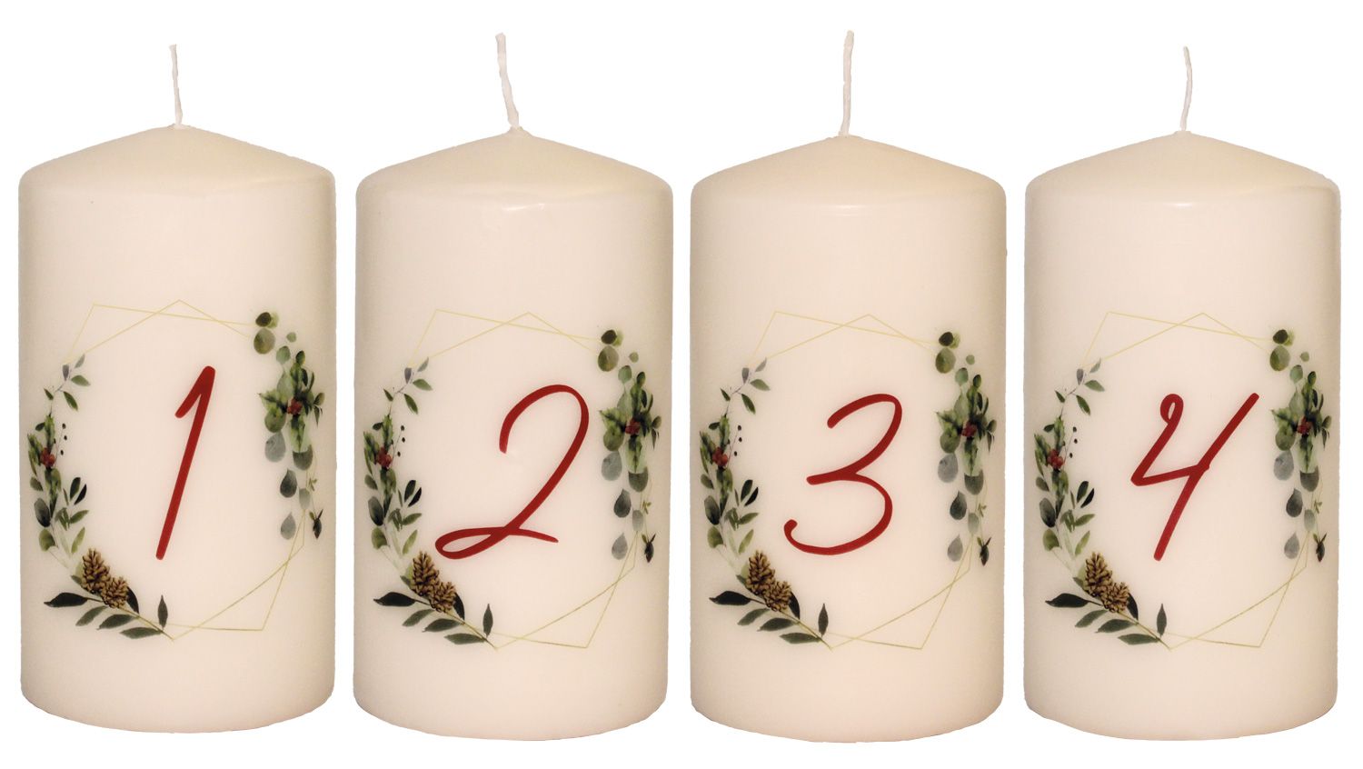 Adventní svíce CHRISTOPHORUS s fototiskem čísel, 4 kusy, krémová barva, 13cm, Ø6,8cm, 52h - vyrobeno v Německu