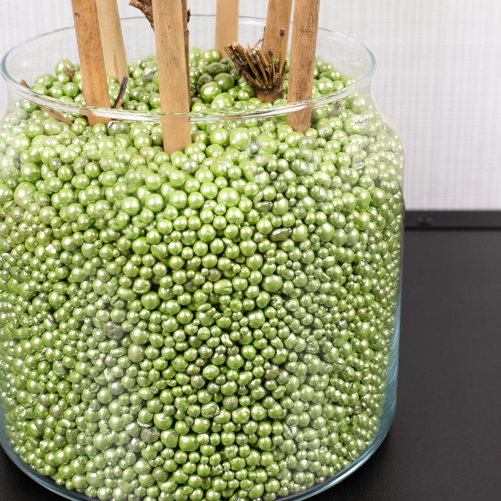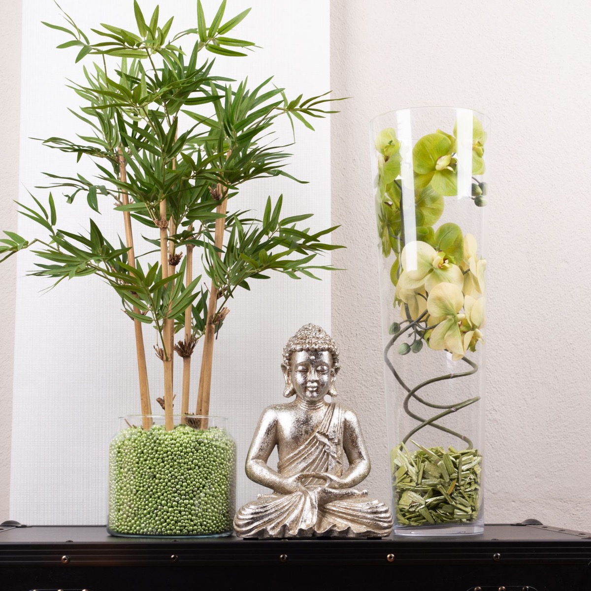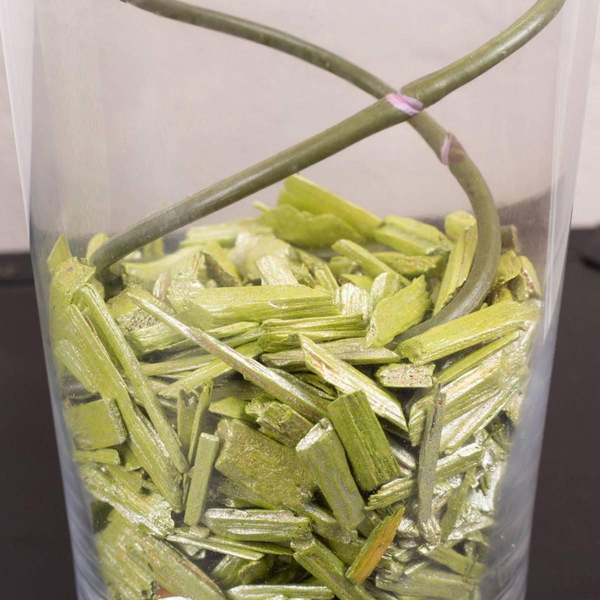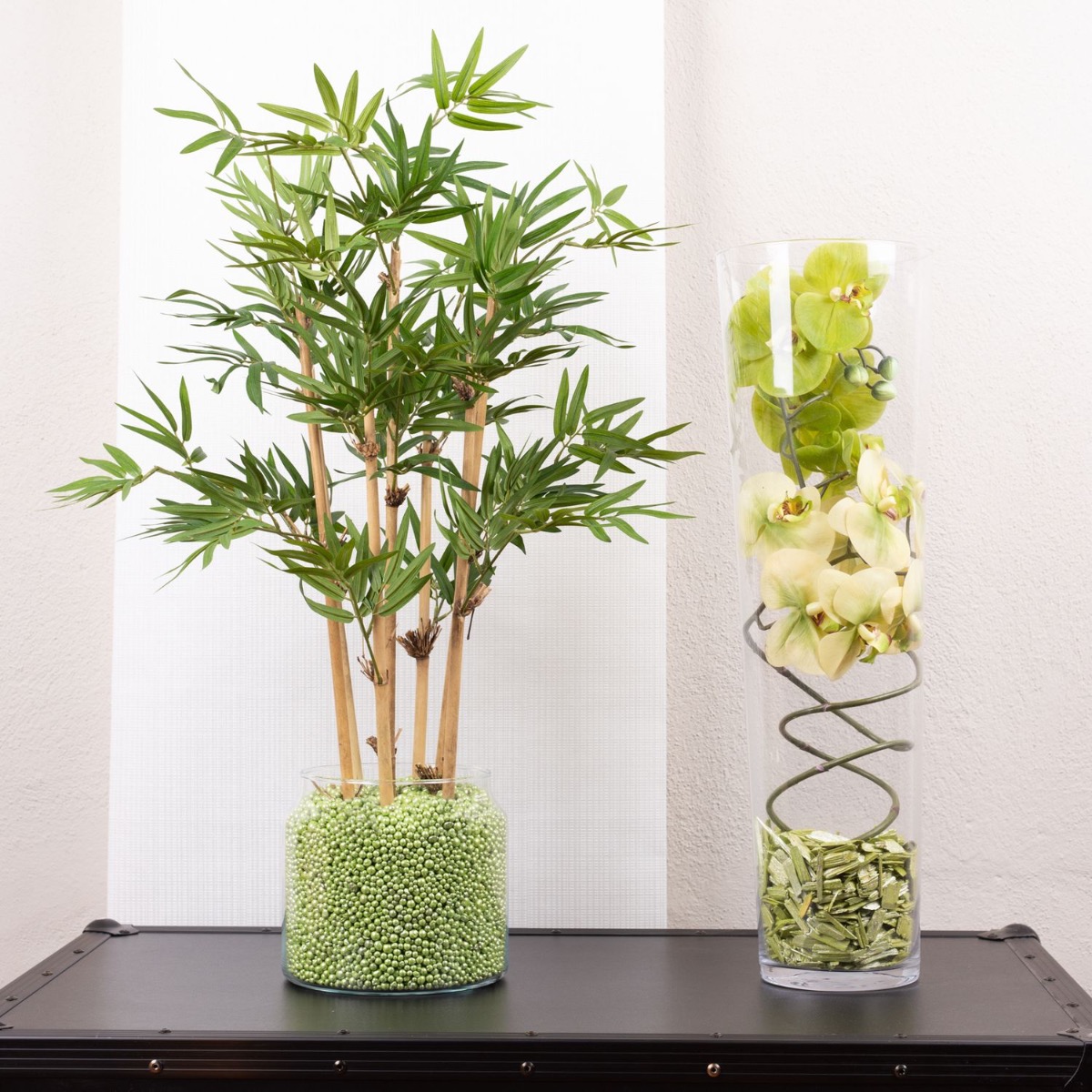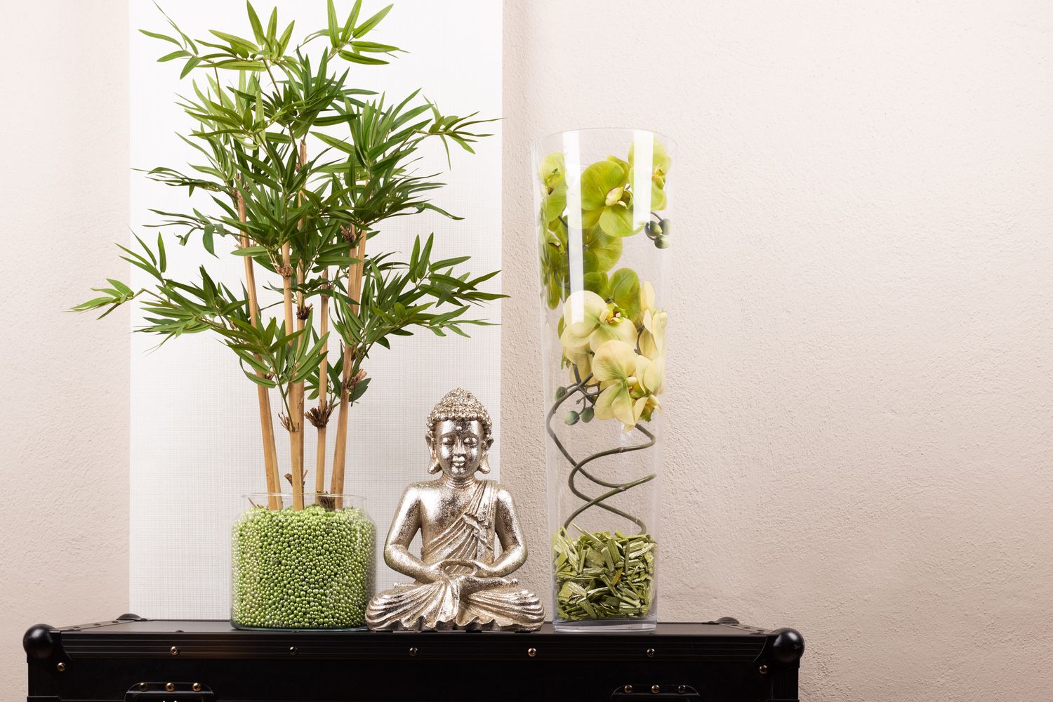 Designový tip: Do květináče umístěte bambusovou rostlinu a naplňte ji barevnými ozdobnými korálky. Orchideje roztočte do spirály a nasaďte je na velkou vázu. Konce větviček orchidejí zakryjte barevnou mulčovací kůrou.