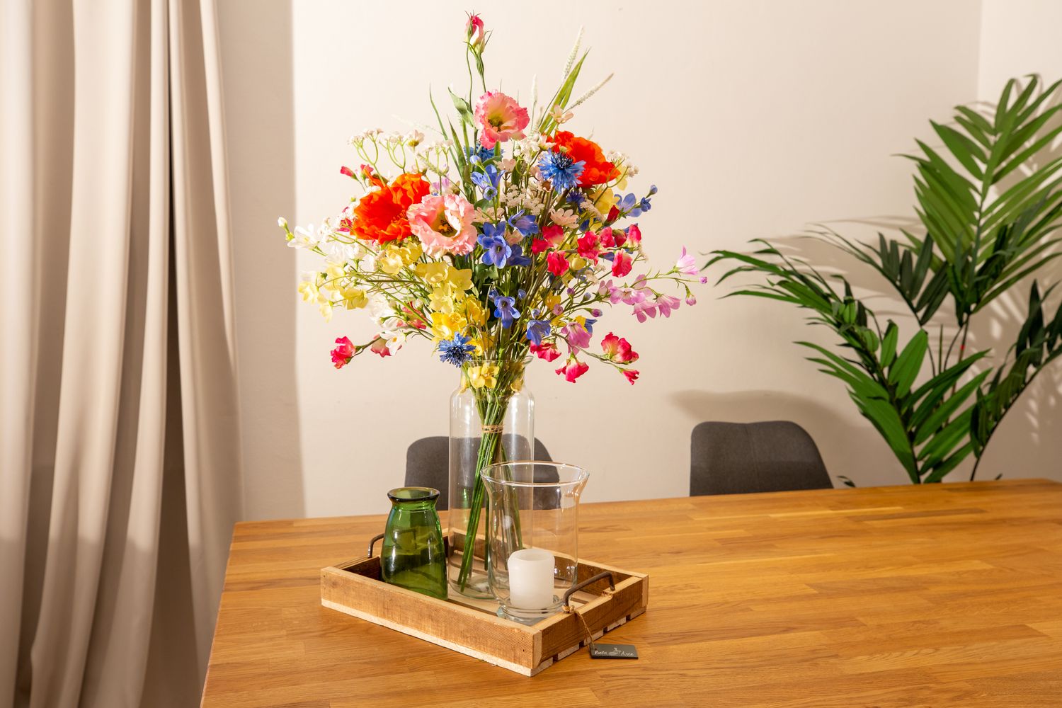 Barvy vám navodí dobrou náladu! A to se daří zejména této kytici, která je naším bestsellerem a již potěšila několik obývacích pokojů našich zákazníků. O důvod víc, proč si s ní vykouzlit vzhled. Malý dřevěný podnos je ideální jako základ pro dekoraci pokoje. Vybrali jsme k němu odpovídající lucernu se sloupovou svíčkou a přidali menší zelenou vázu jako ozdobu. Tak snadno vnesete do svého domova barvy. Nakupte si tento vzhled!