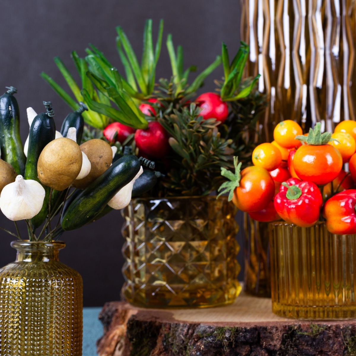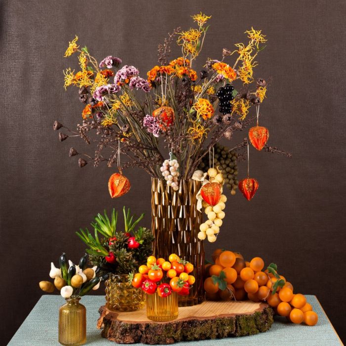 Barevný a krásný! To je podzim. Kromě nádherných barev, které podzim vytváří, je tu ještě jedna důležitá věc, která se na podzim děje. Je to sklizeň! Pokud bylo dobré léto, je podzimní sklizeň obzvlášť úspěšná. O to víc se můžete pochlubit plody své práce. Physalis, hrozny, rajčata, papriky, pomeranče, ředkvičky, okurky, brambory a dokonce i česnek poslouží jako dekorace stolu a ozdobí kytici pozdně letních květů. Různé žluté vázy se třpytí ve slunečním světle a lze je použít pro mnoho dekorativních nápadů. Nakupte si tento vzhled!