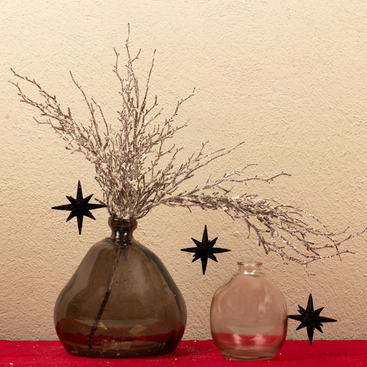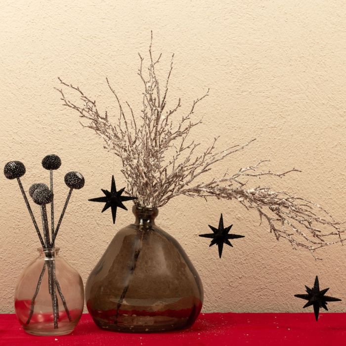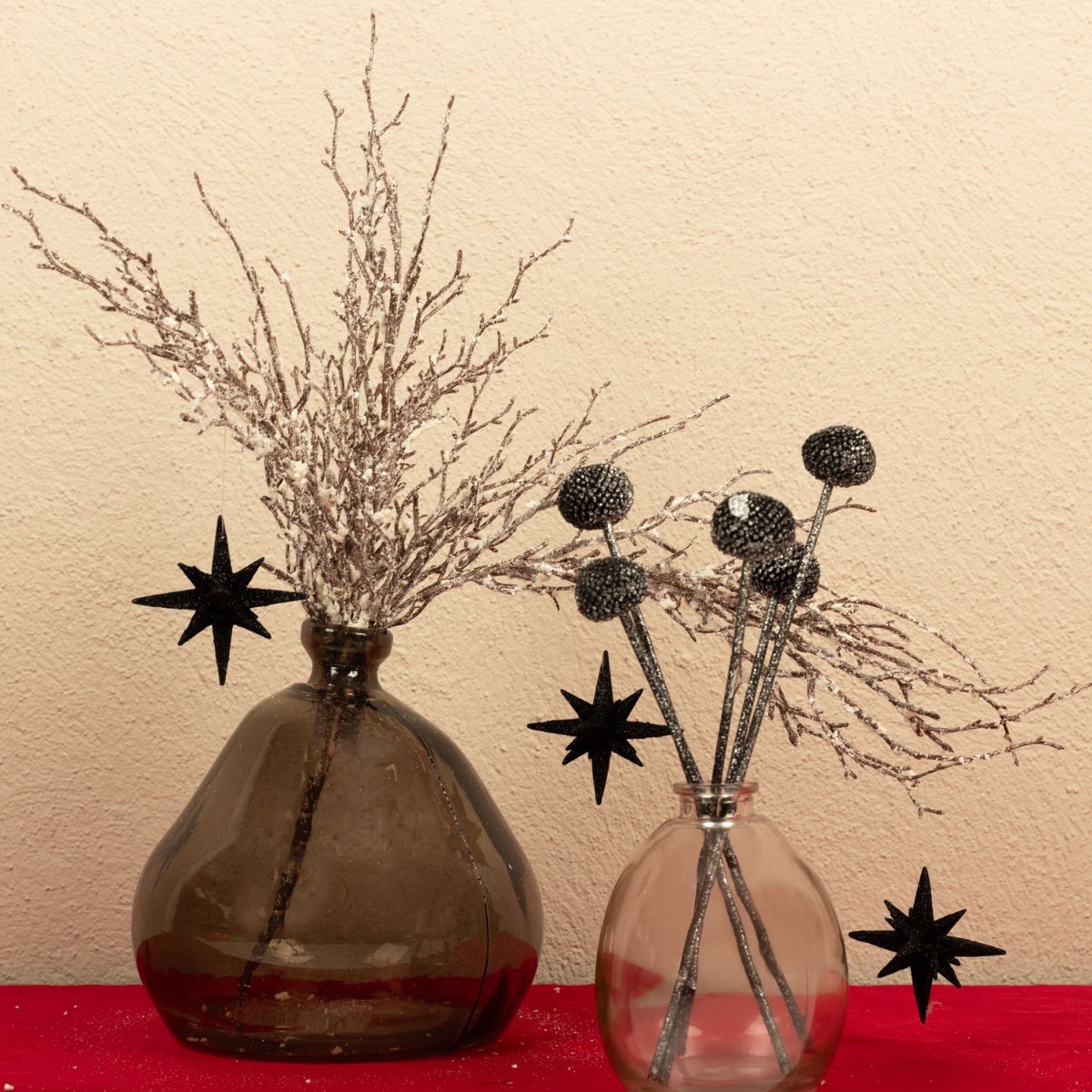 Stříbrná a černá! Tento elegantní vzhled předznamenává příchod sváteční sezóny. Pro všechny, kteří se na Vánoce těší už na podzim! Zasněžená, lesklá stříbrná vrbová větvička je umístěna v baňaté láhvi neobvyklého, nepravidelného tvaru. Zvláštním zpestřením jsou naše černé třpytivé přívěsky s hvězdičkami, které lze později zavěsit i na vánoční stromeček. Pásek z černého ozdobného póru podtrhuje extravagantní design tohoto vzhledu. Nakupujte tento vzhled!