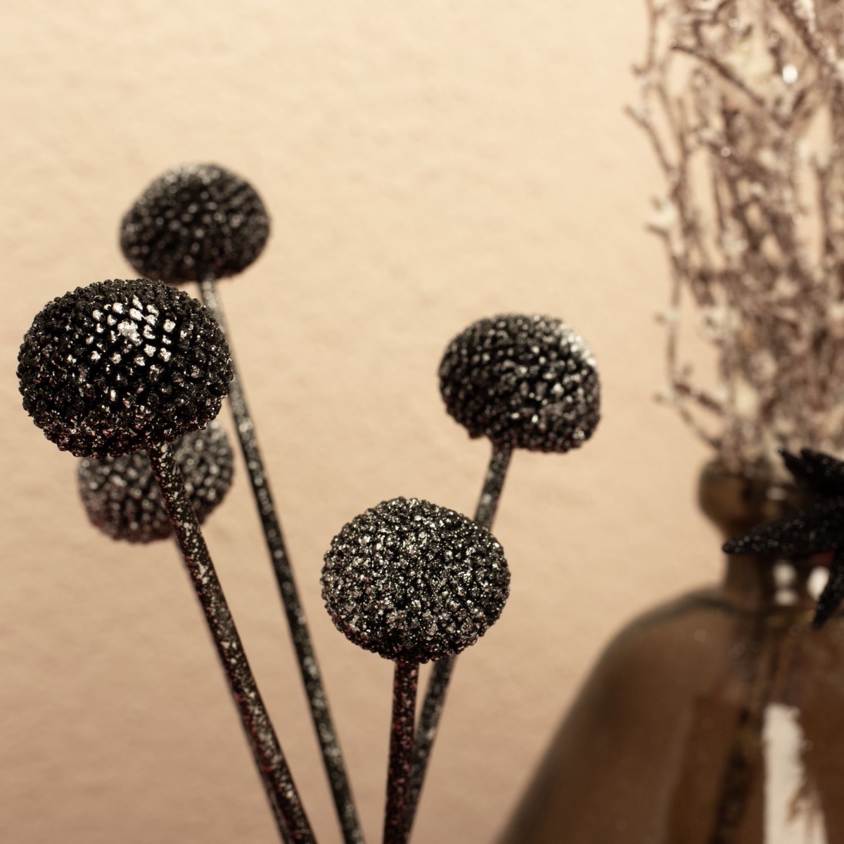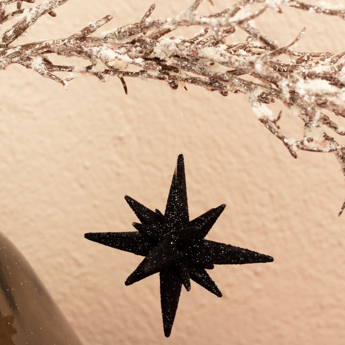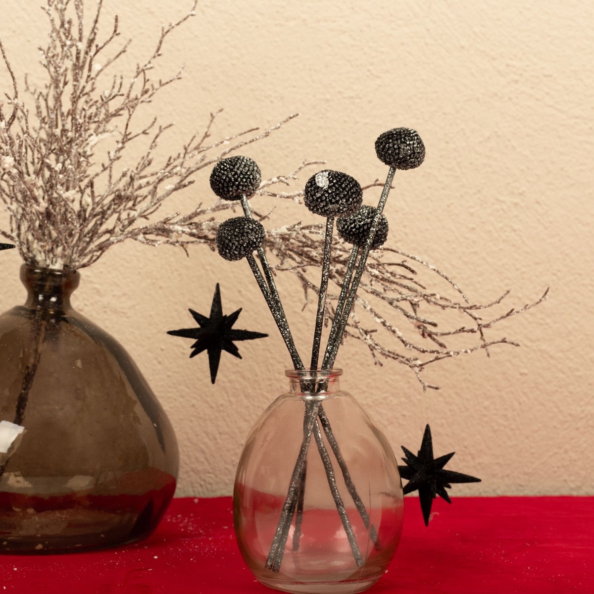 Stříbrná a černá! Tento elegantní vzhled předznamenává příchod sváteční sezóny. Pro všechny, kteří se na Vánoce těší už na podzim! Zasněžená, lesklá stříbrná vrbová větvička je umístěna v baňaté láhvi neobvyklého, nepravidelného tvaru. Zvláštním zpestřením jsou naše černé třpytivé přívěsky s hvězdičkami, které lze později zavěsit i na vánoční stromeček. Pásek z černého ozdobného póru podtrhuje extravagantní design tohoto vzhledu. Nakupujte tento vzhled!