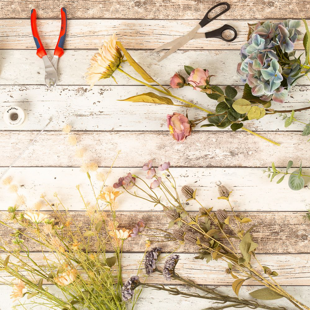- Květy a větve svázané dohromady sisalovou šňůrou lze po odstranění šňůry jednotlivě zkrátit nebo použít samostatně pro kreativní projekty