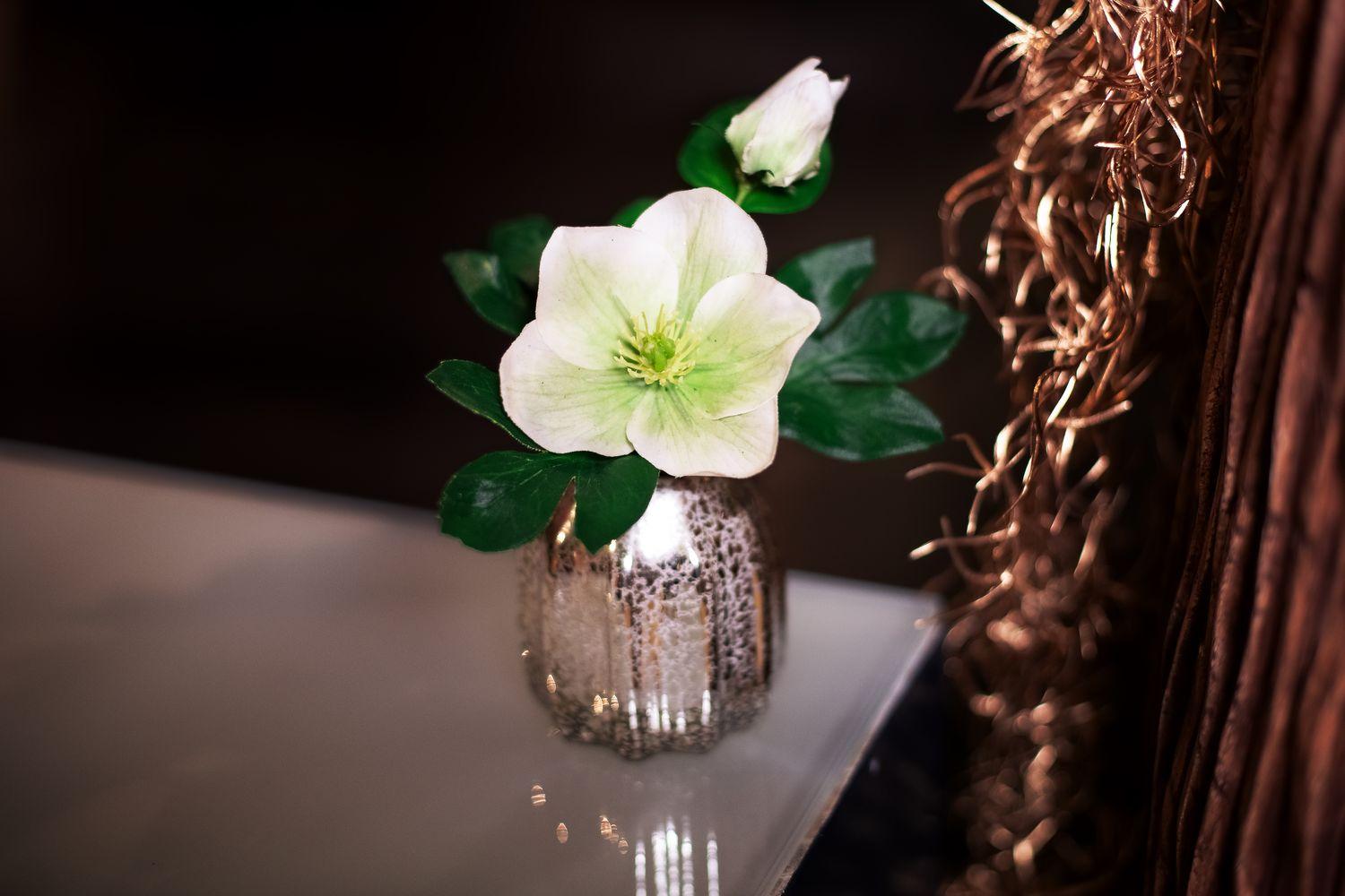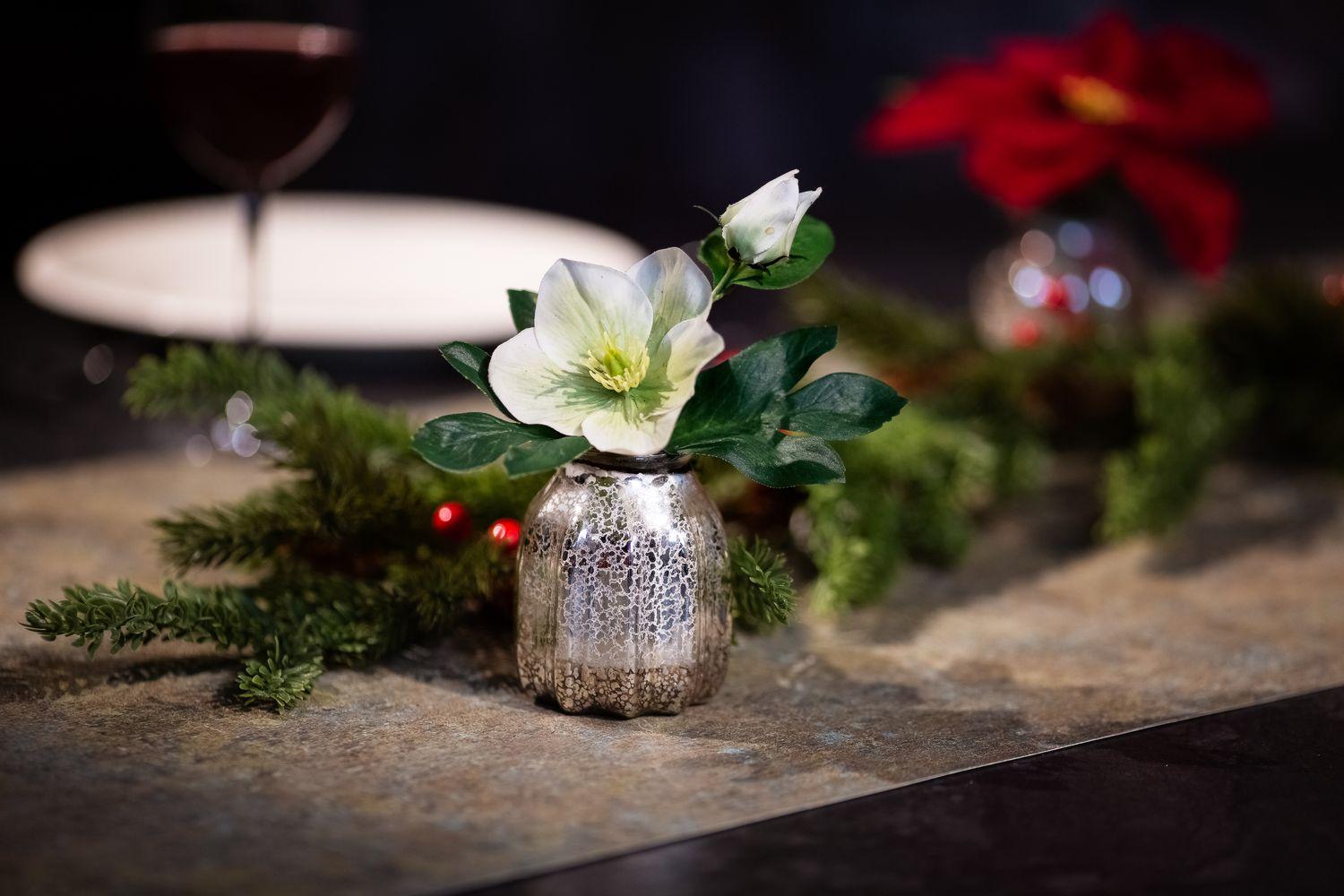 Dekorativní vánoční růže WINFRIEDA ve skleněné váze, krémově zelená, 20cm