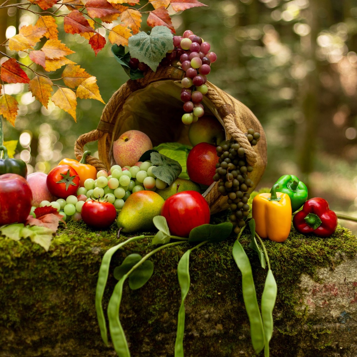 Designový tip: Jde především o rozmanitost! Ovoce a zeleninu vložte do obrácené nádoby na sklizeň a naaranžujte je, jako by právě vypadly. Použijte dva podzimní listy a věnec, který koš na úrodu orámuje.