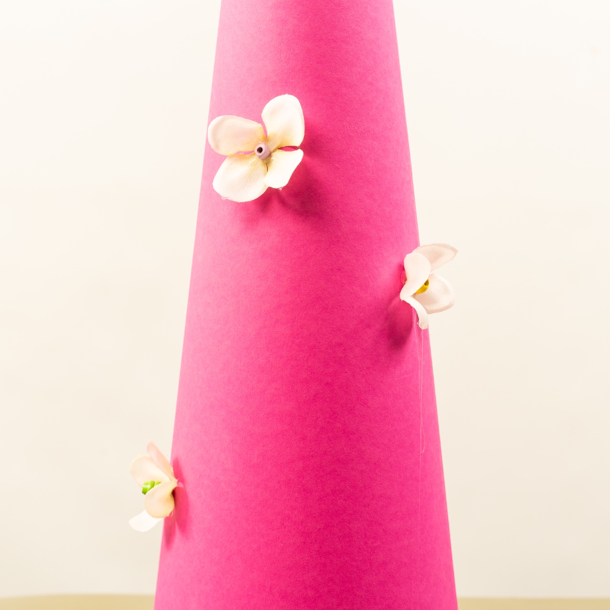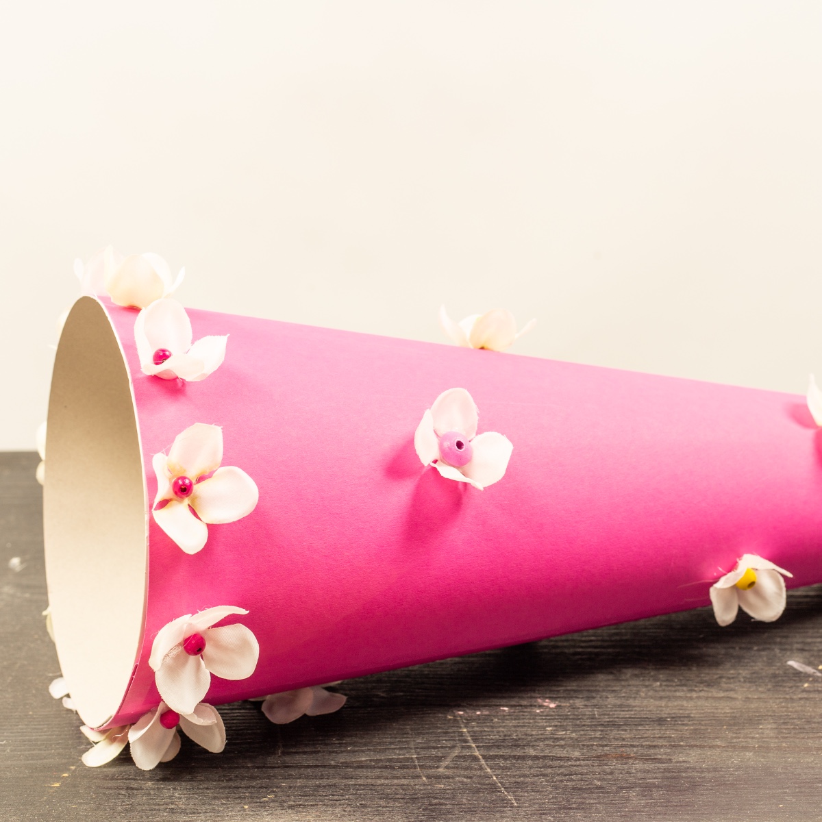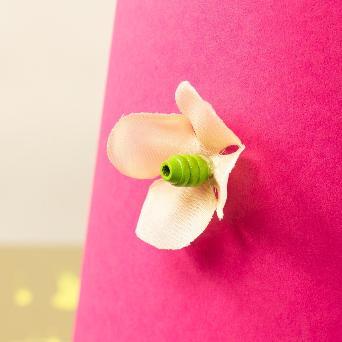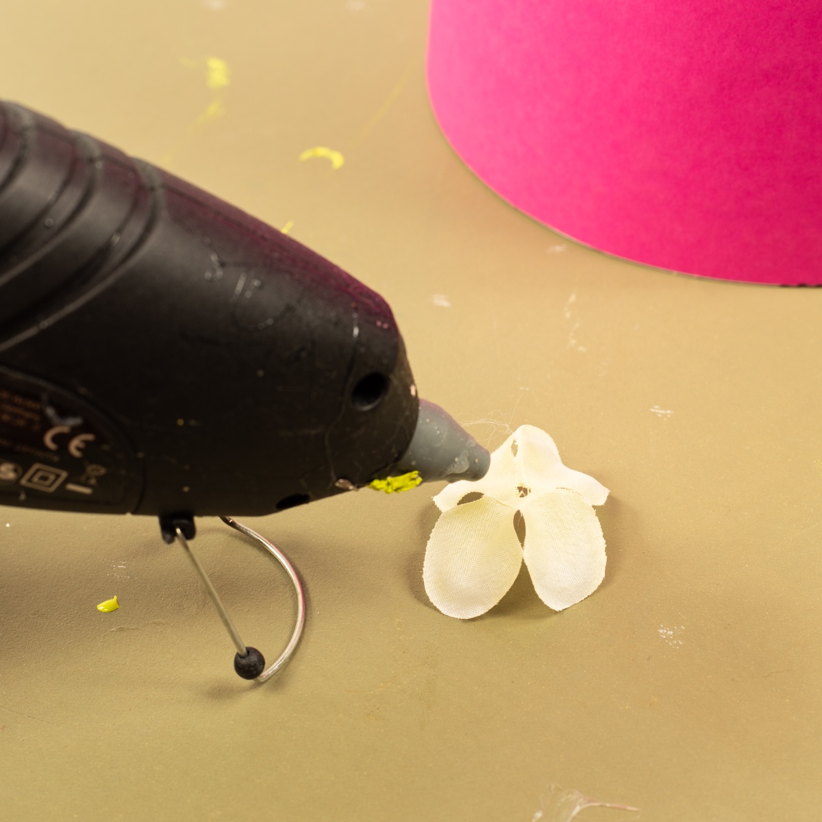 3. Květy přilepte na školní tašku pomocí horké lepicí pistole. K přitlačení jsme použili tužku, aby se nikdo nespálil o horké lepidlo. Poté přilepte do středu květu barevnou korálku, také pomocí horkého lepidla. Květy rovnoměrně rozložte po celé školní tašce. My jsme na okraji vytvořili kruh z květů.