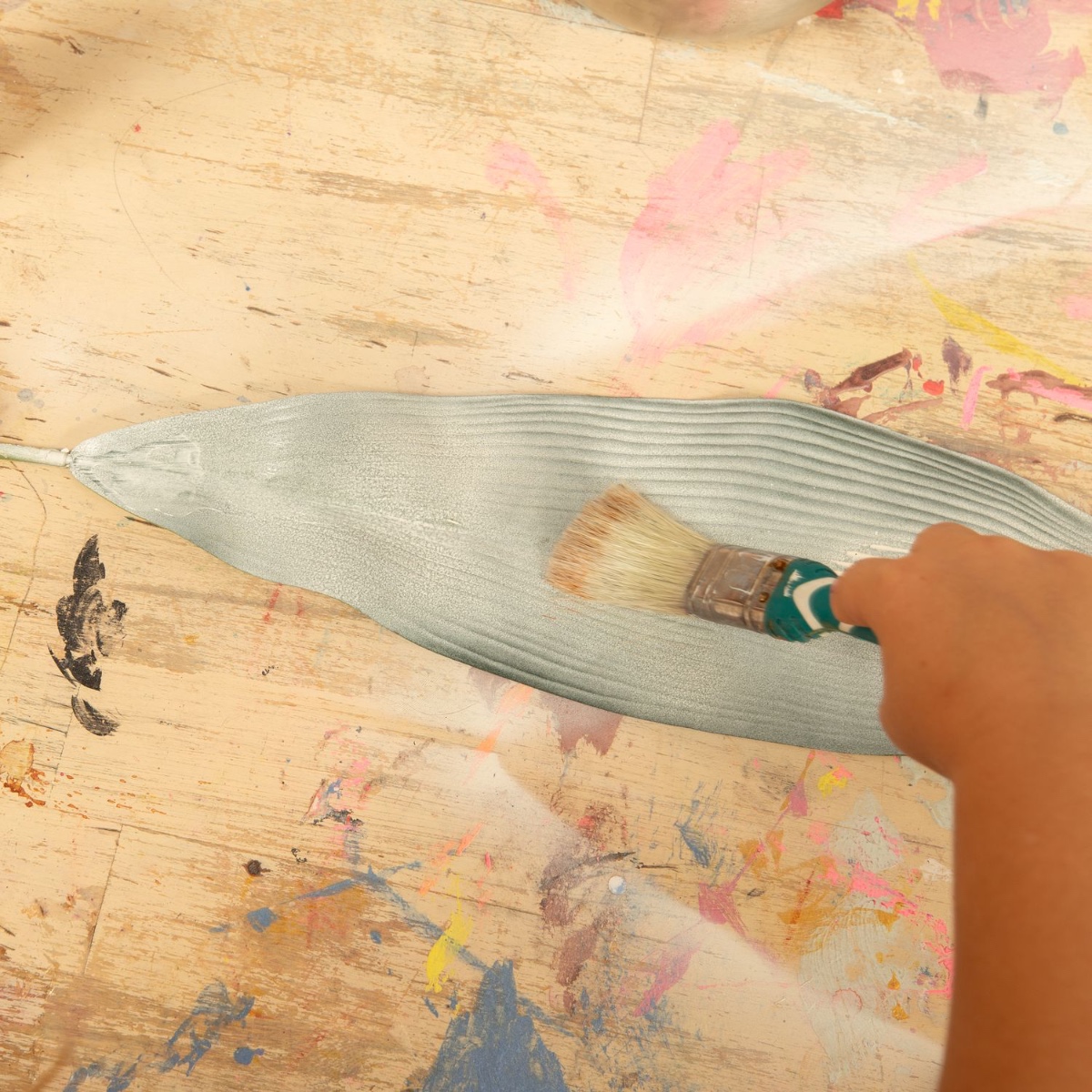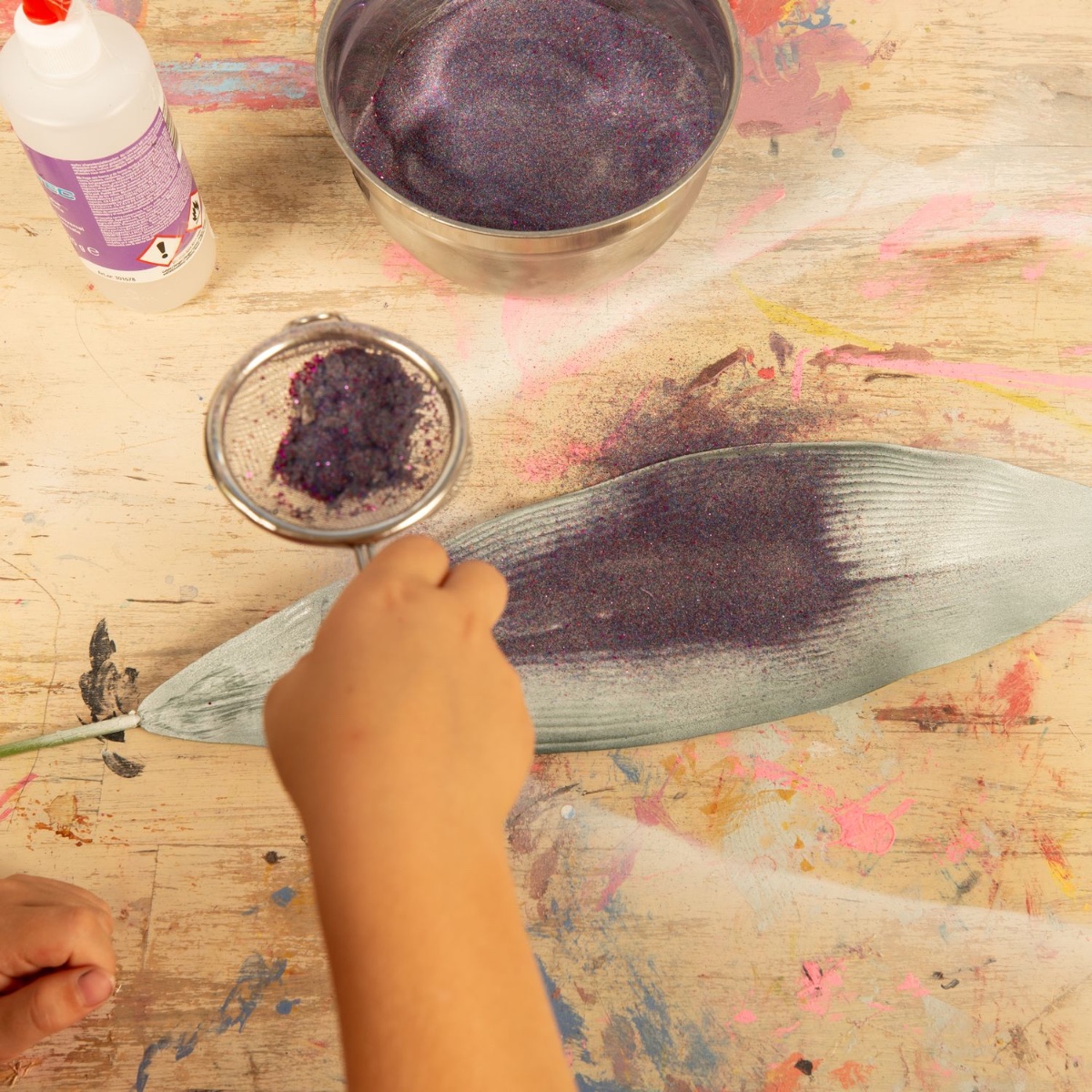 2. Na zaschlé velké listy naneste štětcem transparentní tekuté lepidlo a posypte je třpytkami. Totéž proveďte i na zadní straně.