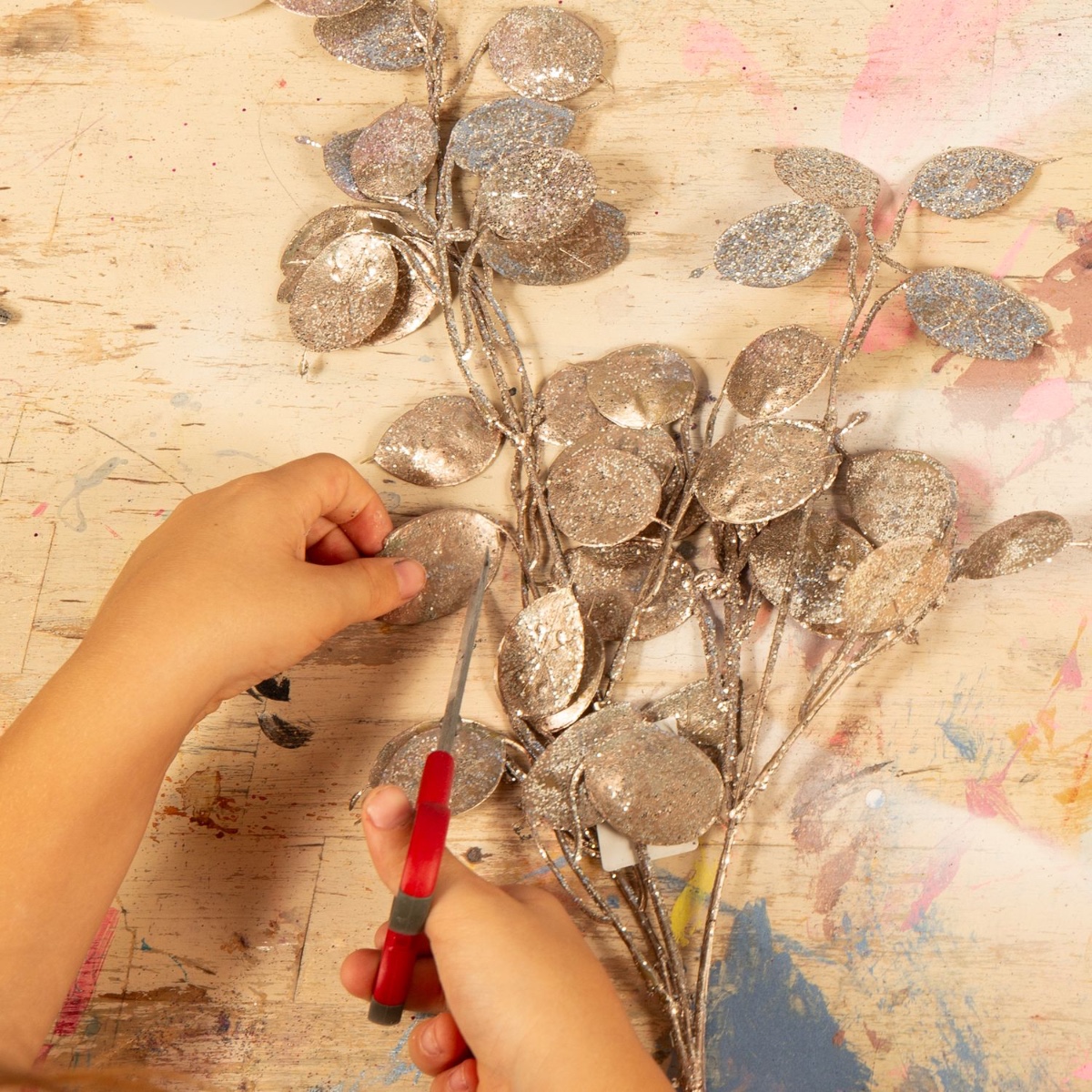 4. Oddělte stříbrné malé lístky z větviček a případně je trochu zaoblete nůžkami. Tyto lístky se použijí jako rybí šupiny.