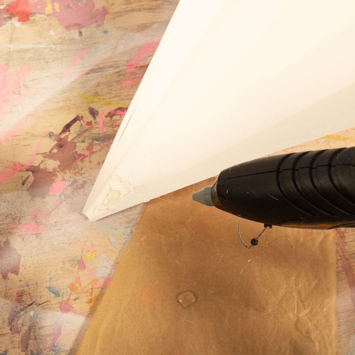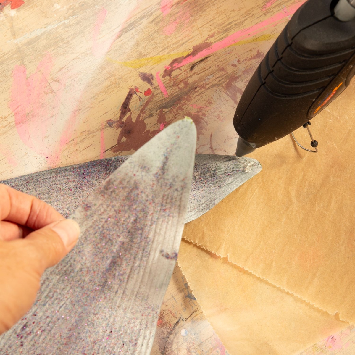 3. Oba listy slepte horkou lepicí pistolí tak, aby vznikl tvar ploutve. Poté přilepte ploutev na špičku školního sáčku.