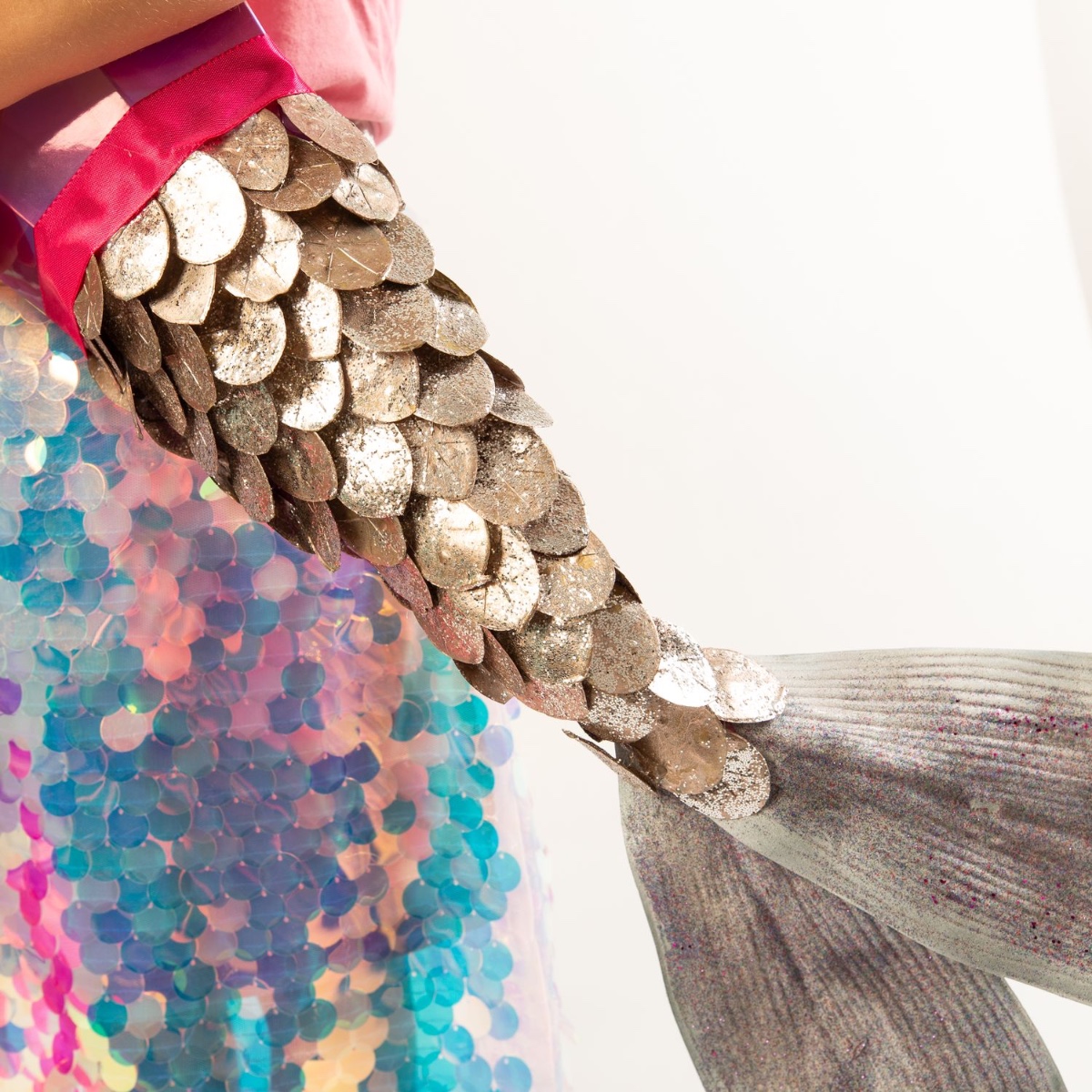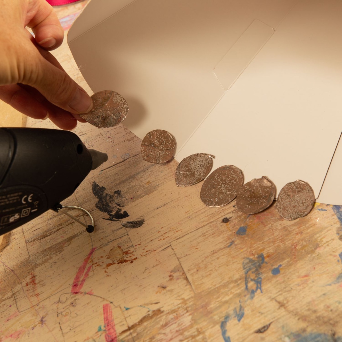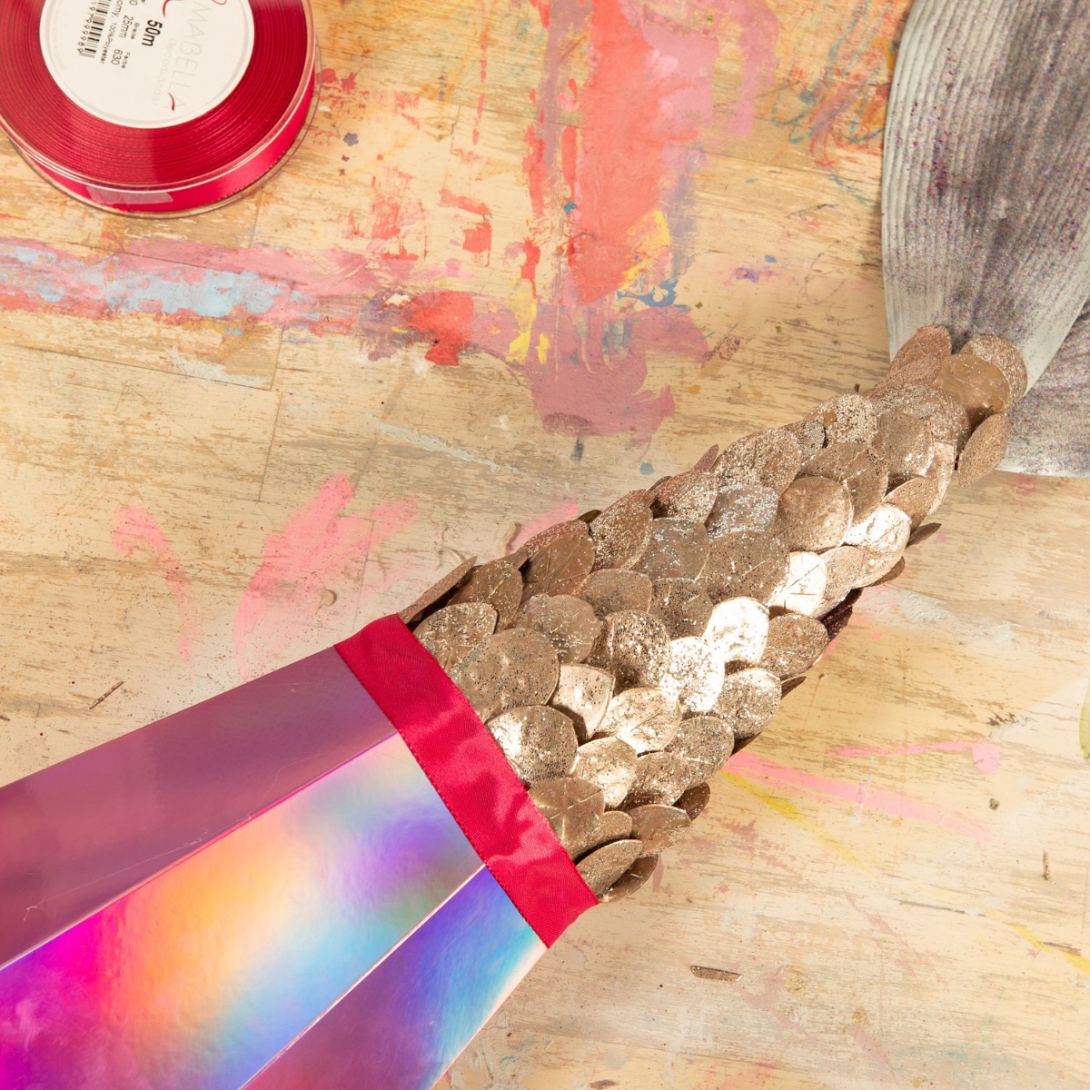 6. Na závěr jsme horkým lepidlem připevnili saténovou stuhu k hornímu okraji rybích šupin.