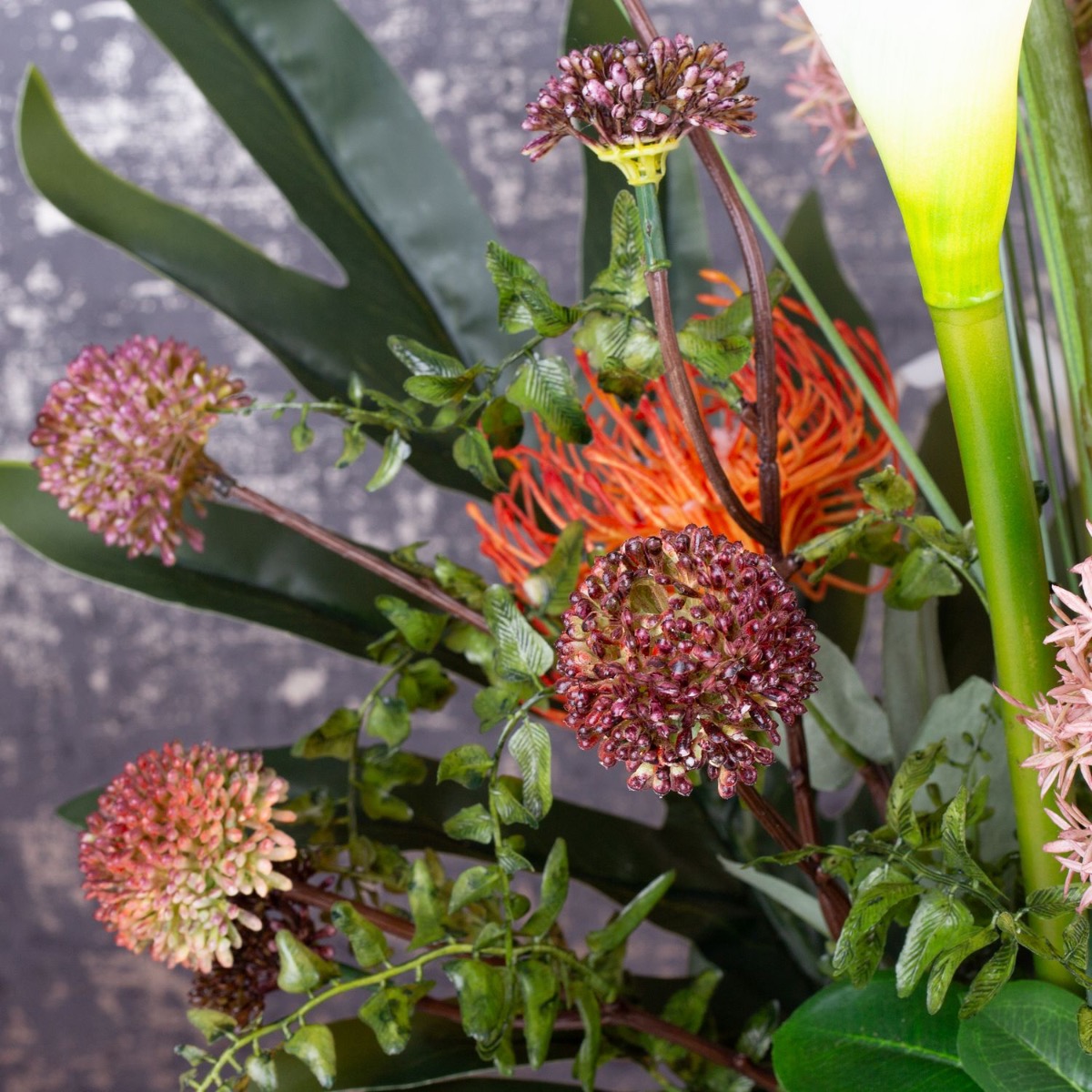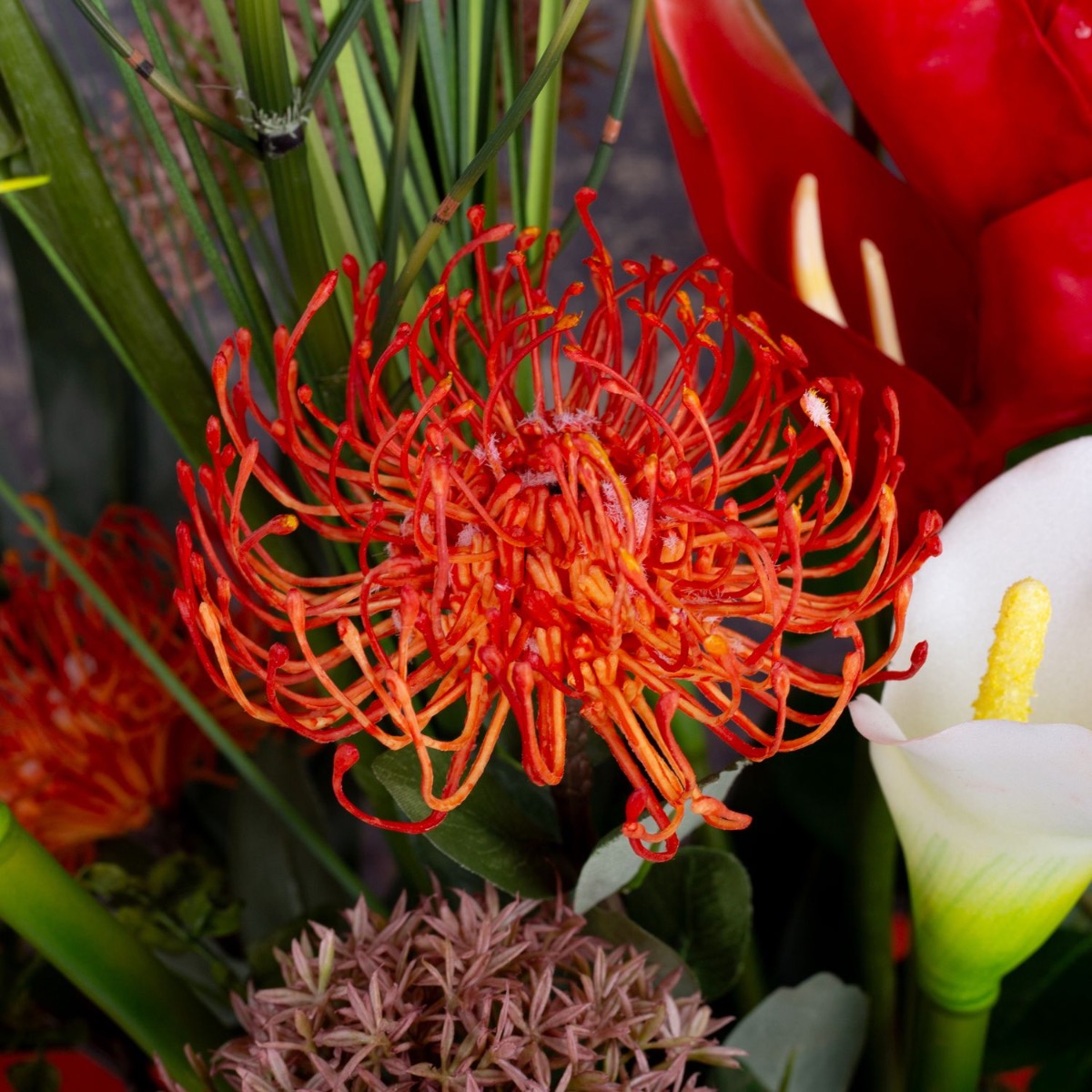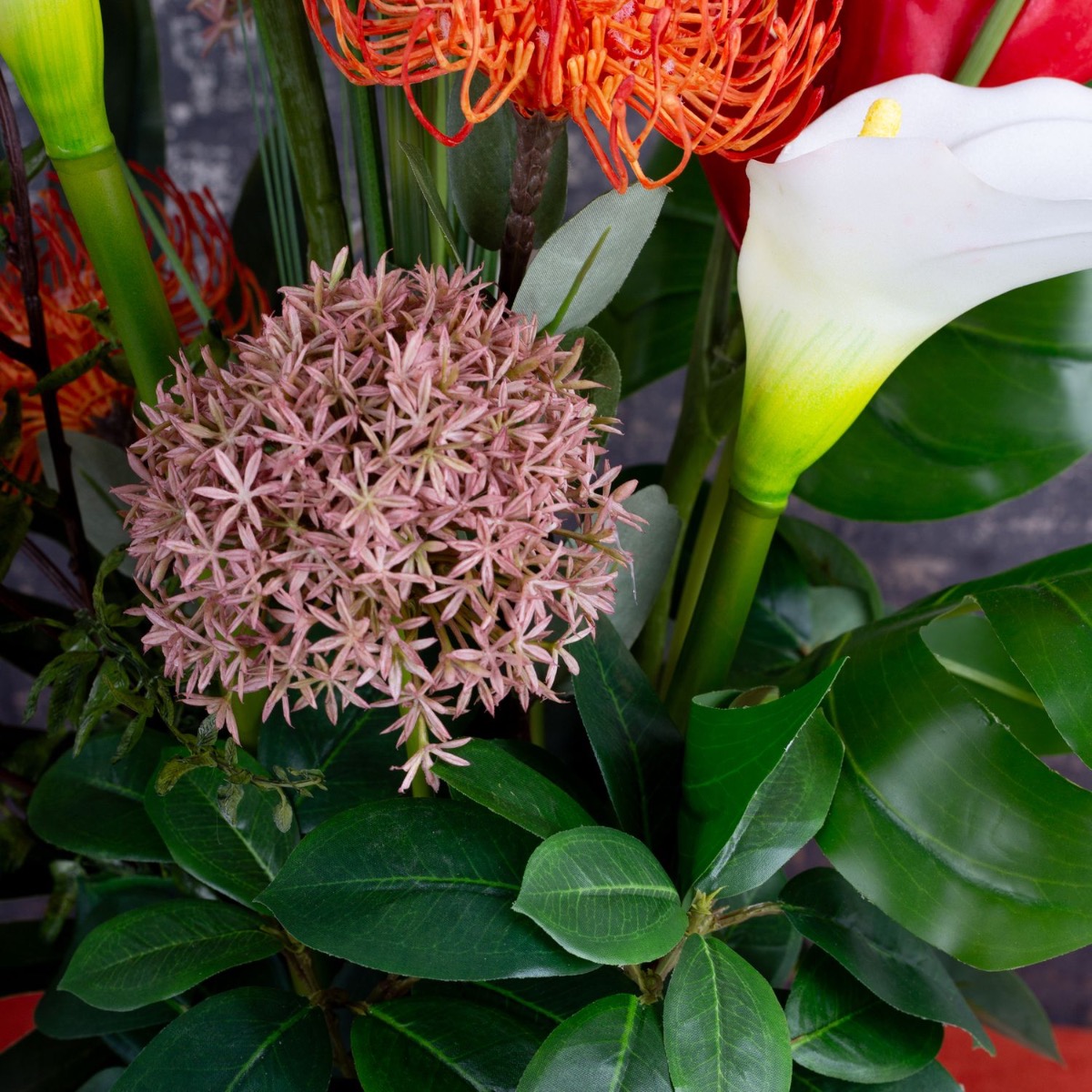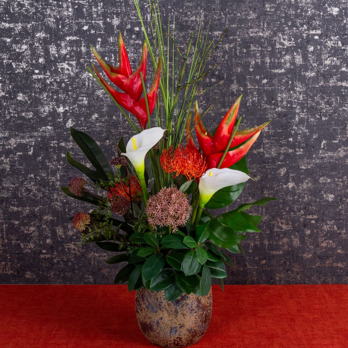 Červené helikónie a bílé kaly! Nadčasová krása, toto aranžmá ozdobí váš obývací prostor. Před tmavou stěnou se barvy obzvlášť dobře uplatní, ale toto umělecké květinové aranžmá je vhodné i jako dekorace, která stojí uprostřed místnosti, protože je navrženo tak, aby se na něj dalo dívat z jakékoli strany. Klasickou krásu podtrhuje zejména zlatý květináč. Skvěle se hodí do obývacích pokojů, vstupních hal a jídelen. Nakupujte vzhled!