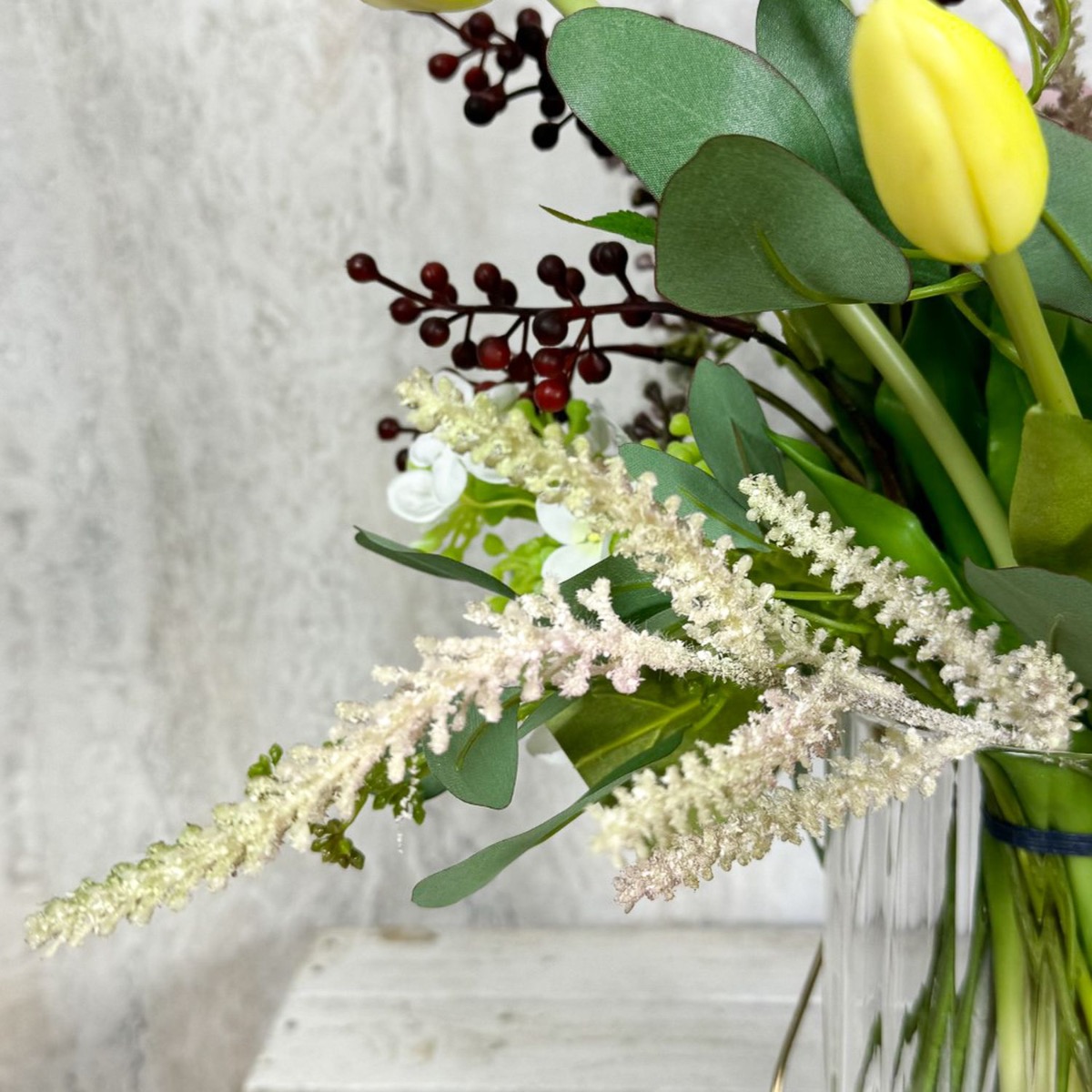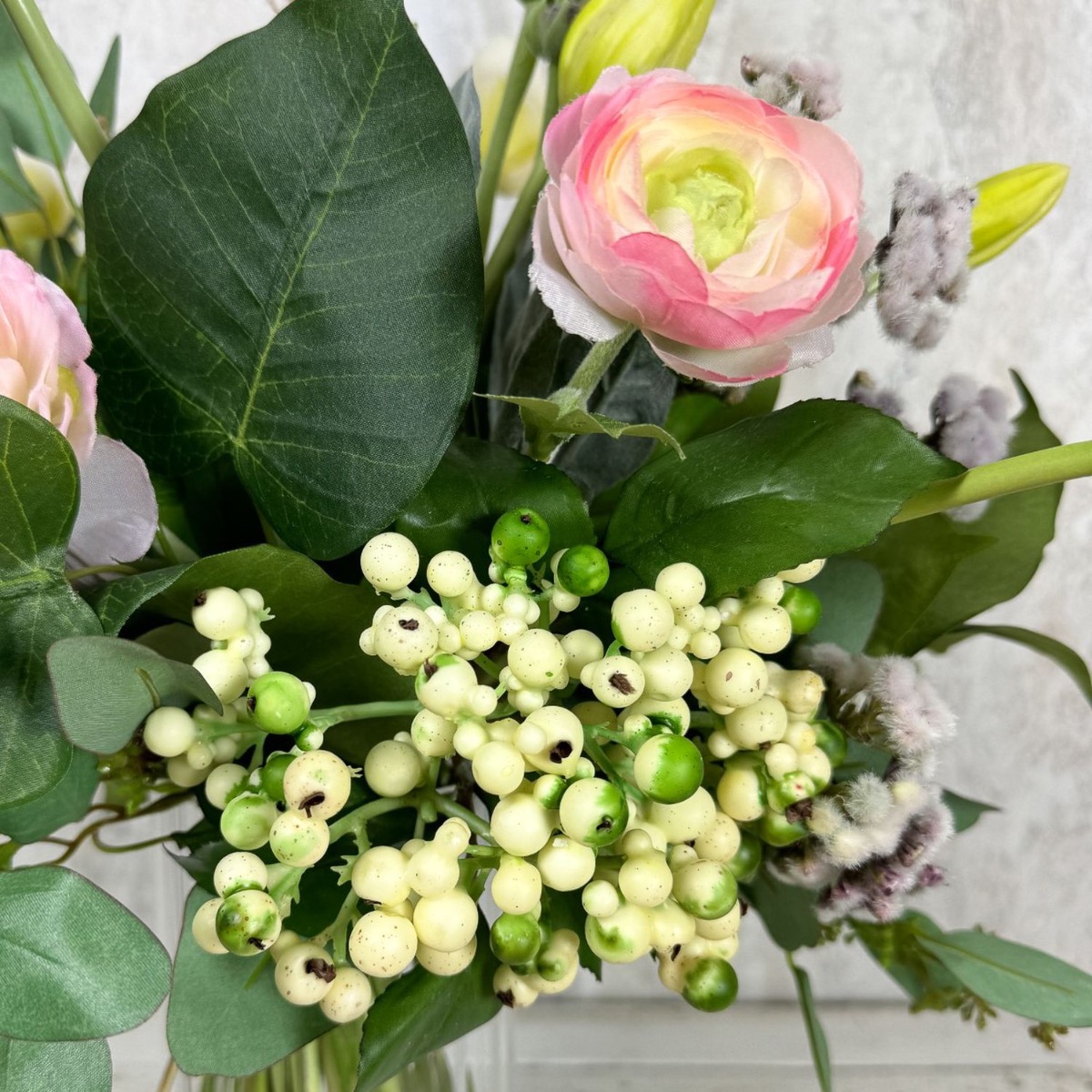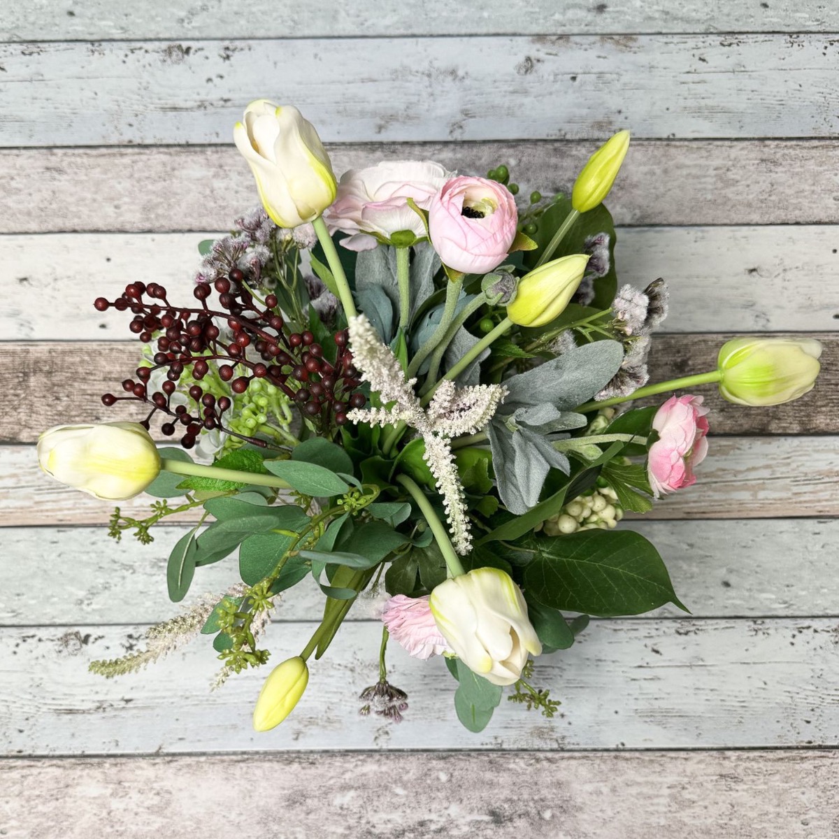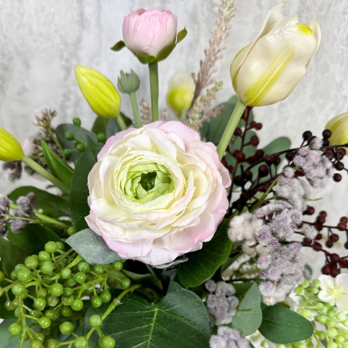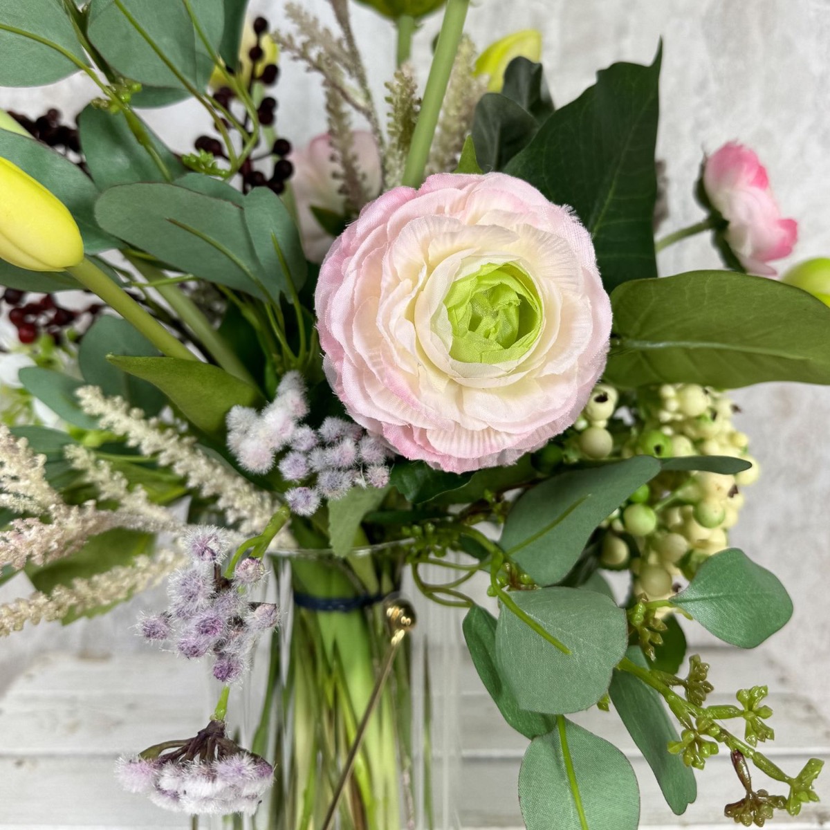 Romantické jaro! Christiane stále hledala vhodné květinové dekorace pro svůj ateliér, kde se konají pravidelné workshopy designu šperků. Důležitý pro ni byl zejména divoký a přirozený vzhled a harmonická barevnost v bílé, zelené a růžových odstínech. Kytici zdobily tulipány s dlouhými stonky, jemné ranunculusy a různé doplňky. Nepravidelná výška a volné uspořádání květin a listů dodaly aranžmá požadovanou živost a neformální vzhled. Ideální pro šperkařskou dílnu, která účastníky inspiruje a umožňuje rozvinout jejich kreativitu. Chcete dodat svému pokoji jemnou eleganci a nádech jara? Nakupte si tento vzhled!