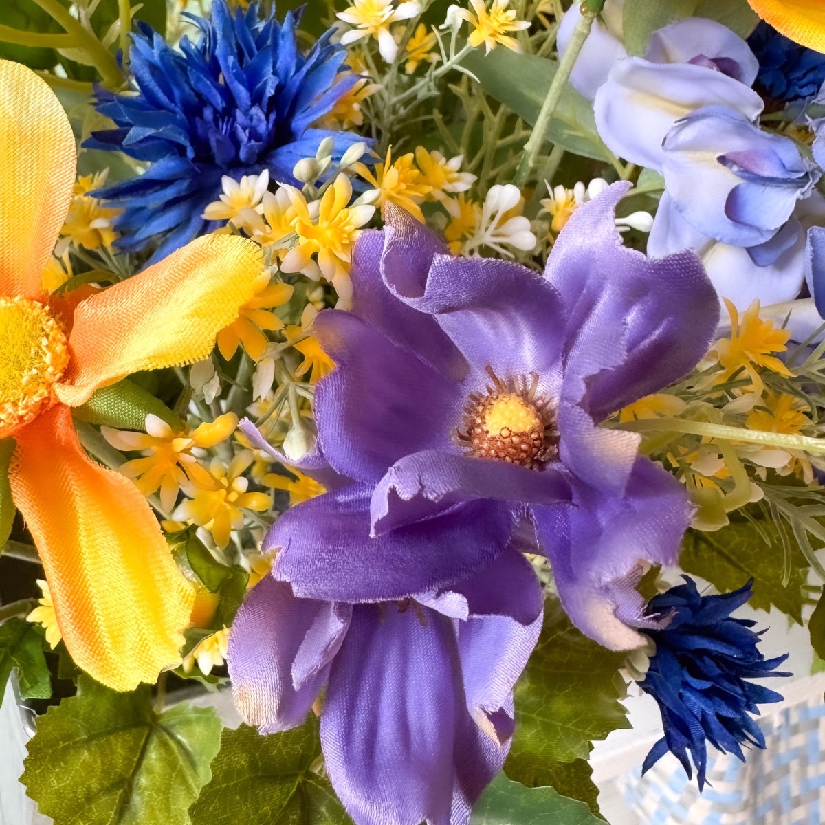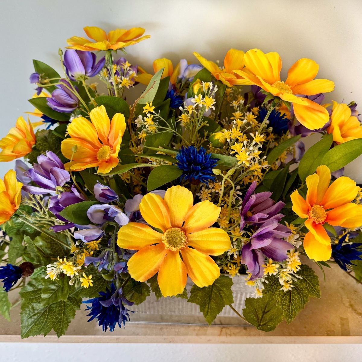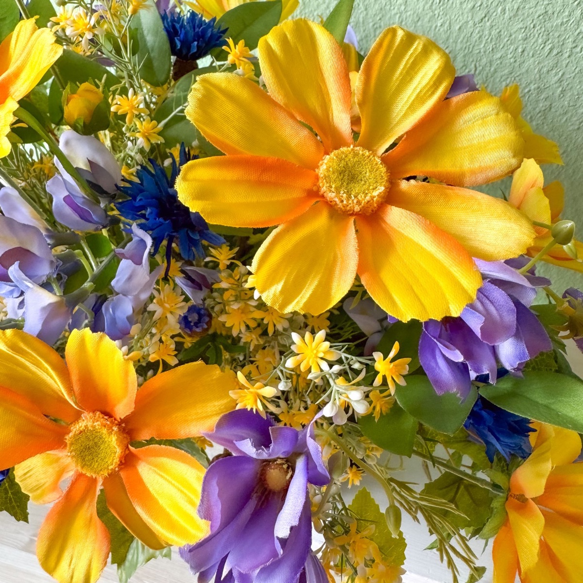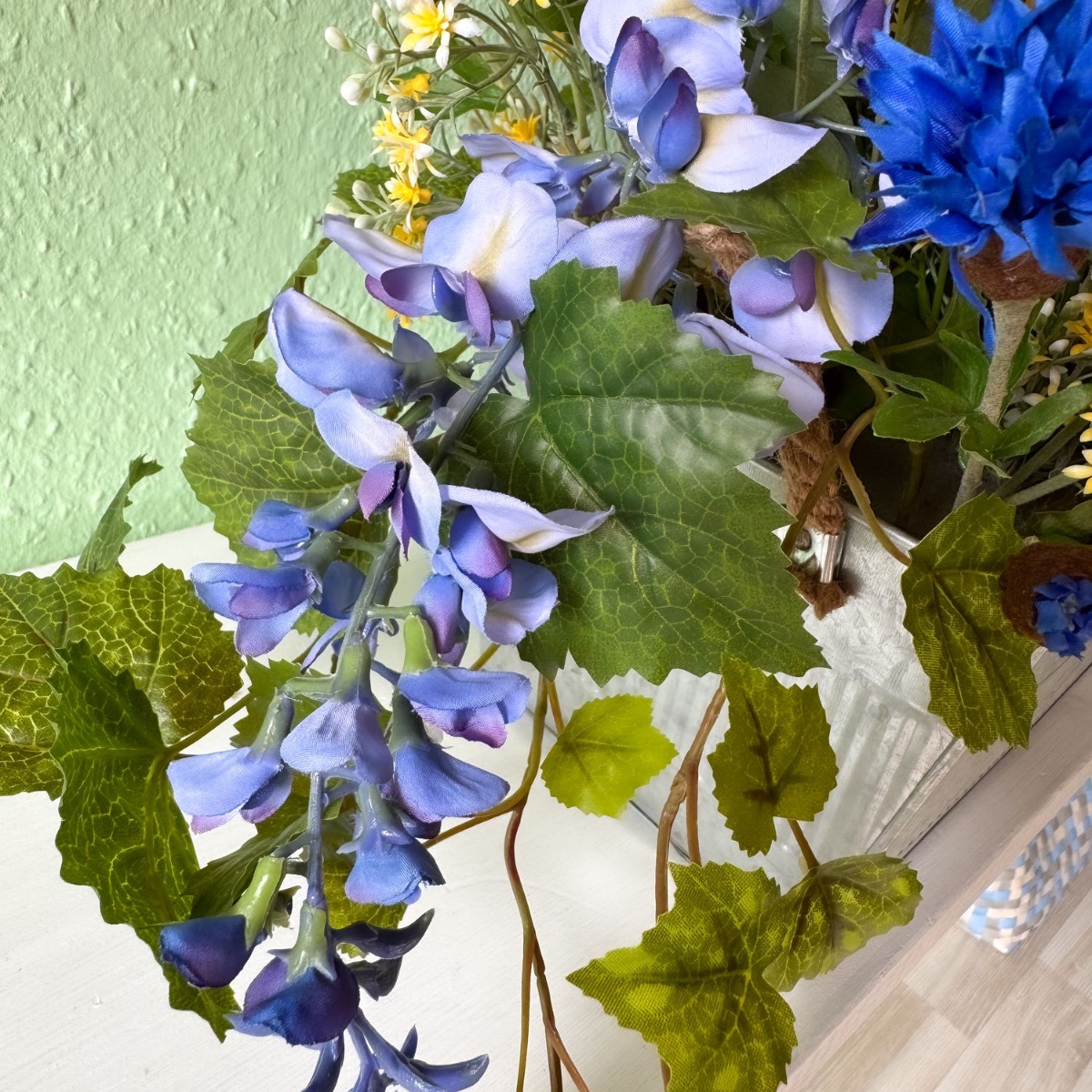 Láska k divokým květinám! Obdrželi jsme druhý dotaz od našeho zákazníka Hanse-Petera. Tentokrát potřeboval květinovou výzdobu pro barokní zlatý středový lustr se stylizovanými květinami. Chtěl modré chrpy a další zářivě žluté a fialové květy a také listy vinné révy, které by ladily se středovým dílem. Pro dokonalou realizaci nám opět poslal vložku nádoby, abychom do ní mohli řízky přesně ukotvit. Chrpy jsme doplnili ozdobnými košíčky, koprem a větvičkami modrého deště. Každou větvičku jsme zkrátili a rozdělili na několik květních stonků. Ty jsme synchronizovaně vložili zevnitř ven do řízků, aby byly rovnoměrně rozloženy. Vinná réva a modrý déšť byly zavěšeny na krátkých stranách nádoby. Zákazníkovi jsme poslali několik fotografií našeho prvního exempláře. Hans Peter byl nadšený a hned si ho objednal. Chtěli byste také extravagantní aranžmá z umělých květin? Nakupte si vzhled!
