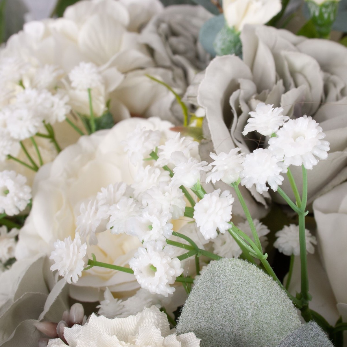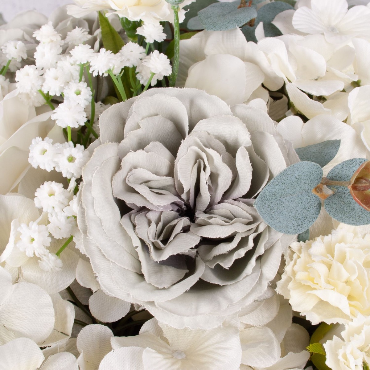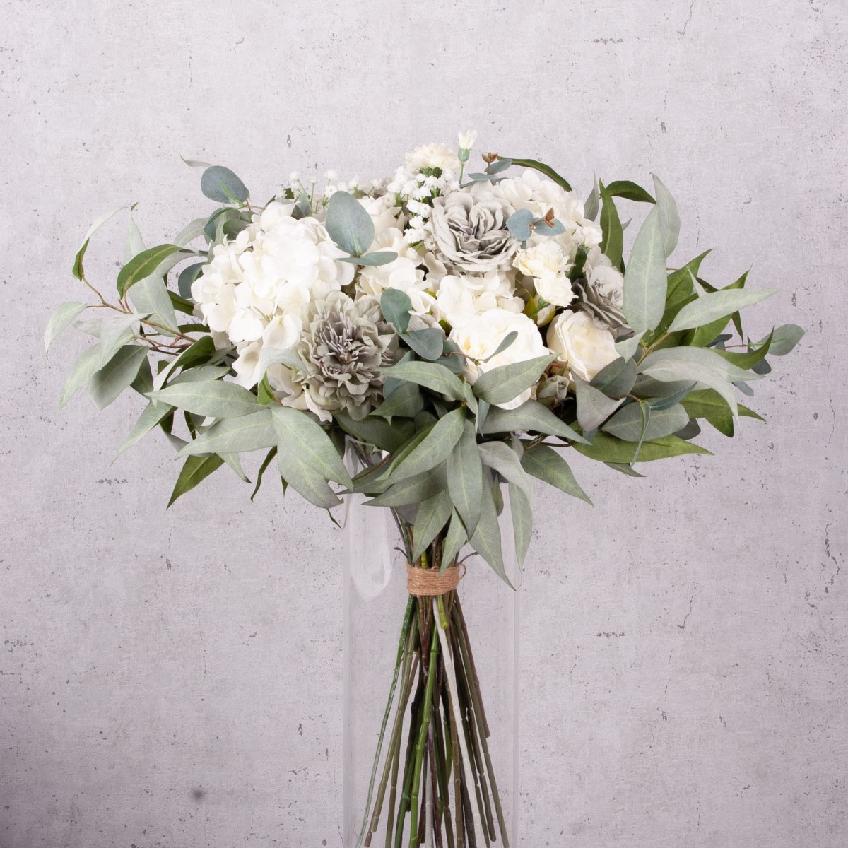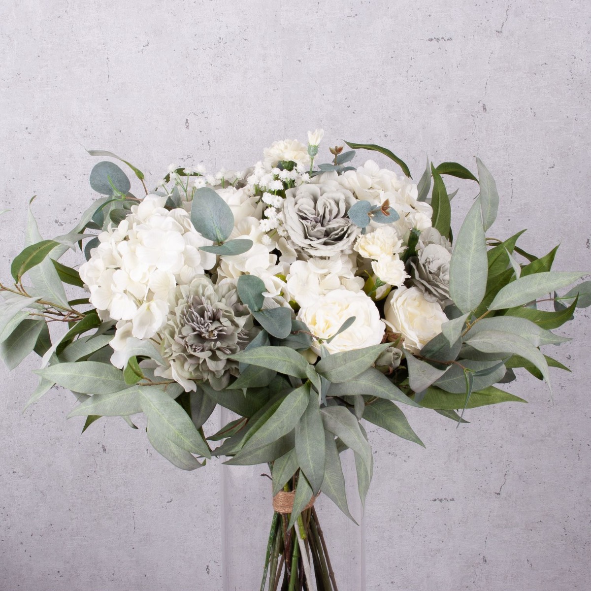 Delikátní a elegantní! Tato kytice je nenápadná a střídmá ve svých barvách. Přesně tak si tuto kytici představovala naše zákaznice z Francie, od které jsme obdrželi žádost o kytici na míru. Světle zelená barva eukalyptových listů v kombinaci s šedými kapustovými růžemi a bílými hortenziemi dodává kytici mlhavý a podzimní vzhled. Díky nenápadným barvám se tato kytice hodí téměř do každé místnosti. Chtěli byste také extravagantní umělou kytici? Nakupte si tento vzhled!