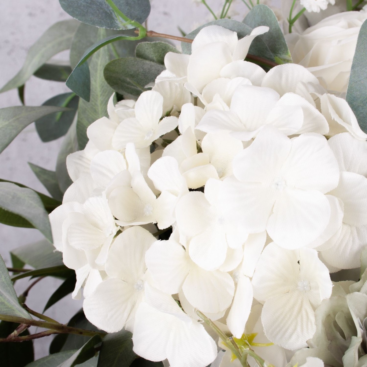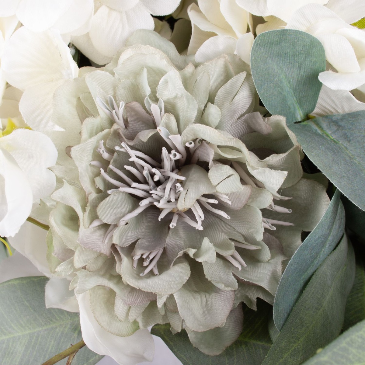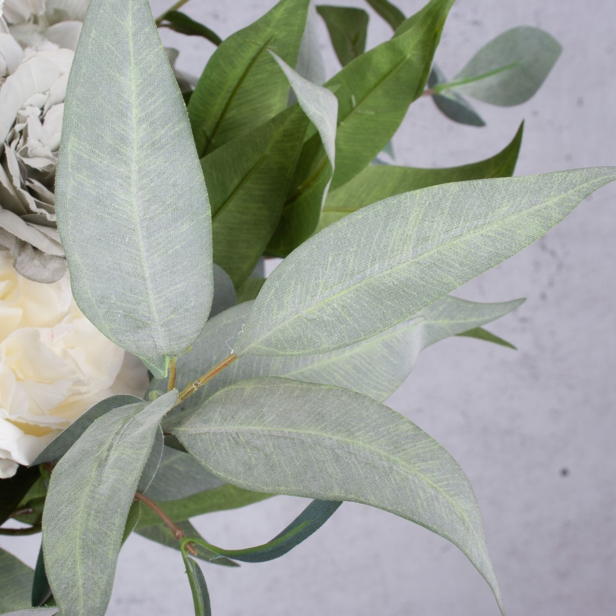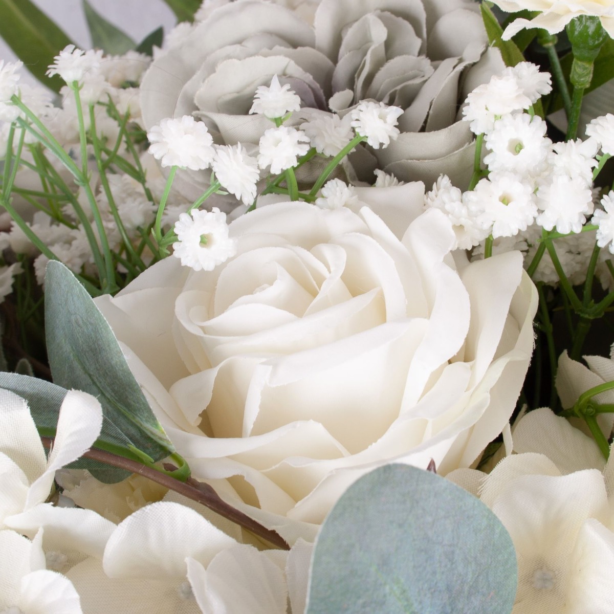 Delikátní a elegantní! Tato kytice je nenápadná a střídmá ve svých barvách. Přesně tak si tuto kytici představovala naše zákaznice z Francie, od které jsme obdrželi žádost o kytici na míru. Světle zelená barva eukalyptových listů v kombinaci s šedými kapustovými růžemi a bílými hortenziemi dodává kytici mlhavý a podzimní vzhled. Díky nenápadným barvám se tato kytice hodí téměř do každé místnosti. Chtěli byste také extravagantní umělou kytici? Nakupte si tento vzhled!