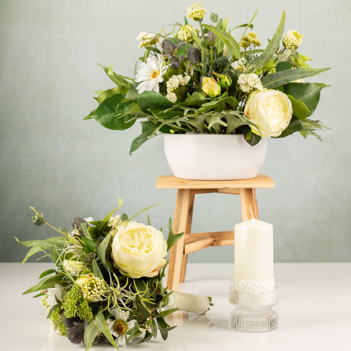 Svatba na výletní lodi! Kdo by se nechtěl vzít v prázdninovém ráji nebo na širém moři? Aby se tento zážitek stal skutečností, pověřila nás společnost provozující výletní lodě realizací umělé květinové výzdoby. Když cestují v oblastech bez přísunu čerstvých květin. Potřebovali dvě různě vypadající svatební kytice s odpovídajícím aranžmá na svatební stůl. Jako referenční bod nám zákazník sdělil, že se mu líbí dvě již realizovaná přání zákazníků: „Exkluzivní aranžmá z hortenzií - přání zákazníka Hanse Petera“ a „Exkluzivní svatební kytice a spona - přání zákazníka Elisabeth“. Tyto dva vzhledy jsme realizovali opět v růžové barvě jako malou svatební kytici a navrhli jsme také moderní bílou verzi. Rozhodli jsme se pro přání zákazníka „Exkluzivní aranžmá z hortenzií - přání zákazníka od Hanse Petera“ jako upravenou verzi svatební kytice a naši nově vytvořenou bílou svatební kytici. Pro růžovou verzi jsme vytvořili také dodatečné aranžmá v oválné misce s úplně stejnými květy a bílá kytice dostala také odpovídající aranžmá v kulaté misce. Obě svatební kytice byly zakončeny bílou stuhou kolem stonků, aby se nevěstám pohodlně držely v rukou. Protože bylo povoleno vybavit umělé květiny dvěma výletními loděmi, poslali jsme vše ve dvojitém balení přepravní společnosti, odkud naše květiny nyní putují po světě. Chtěli byste také takovou krásnou květinovou výbavu? Nakupte si tento vzhled!