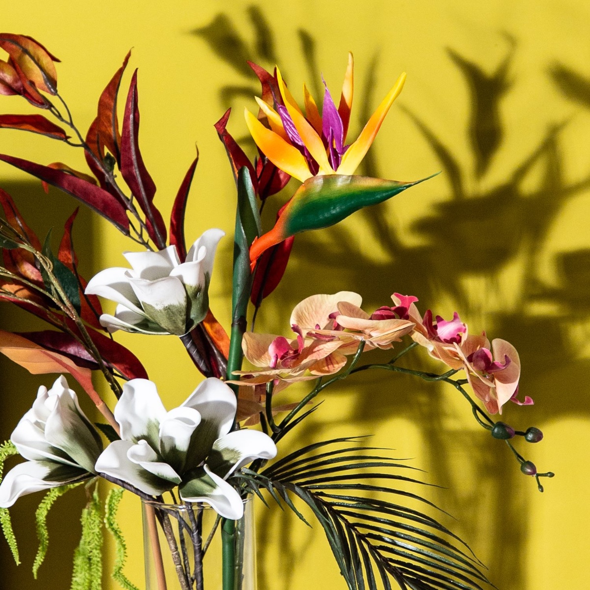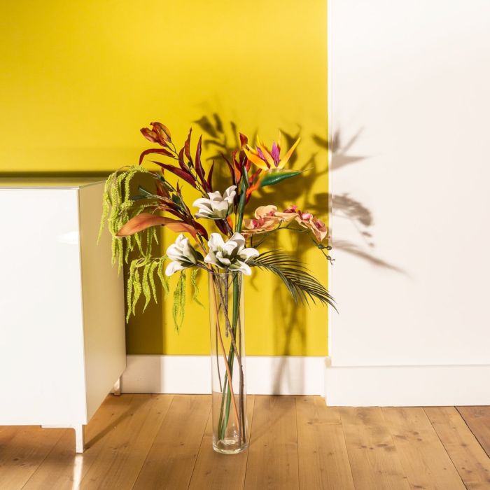 Tropicky barevný a kouzelně krásný! Tato kompozice několika základních květů vytváří okouzlující obraz, zejména když je umístěna na místě, kde sluneční světlo vrhá stíny, které vyniknou na stěně. Středobodem kytice je strelície, která vyniká nad ostatními kráskami, jako je orchidej meruňkové barvy a bílá magnólie. Doplňky, jako je ohnivě červený eukalyptus, amarant a list strelície, si vlastně ani nezaslouží být nazývány doplňky, protože jsou stejně krásné jako kvetoucí prvky. Nakupte si tento vzhled!