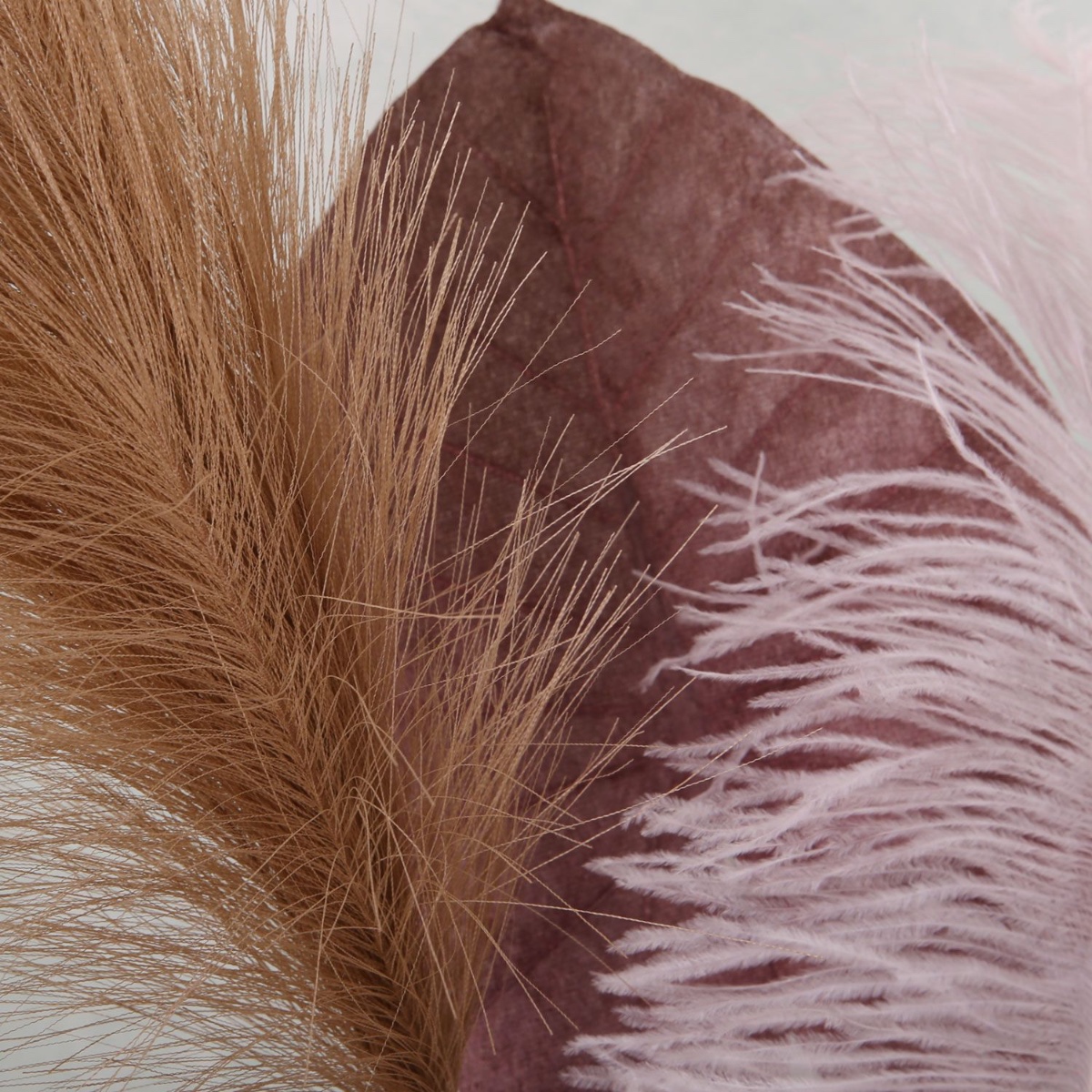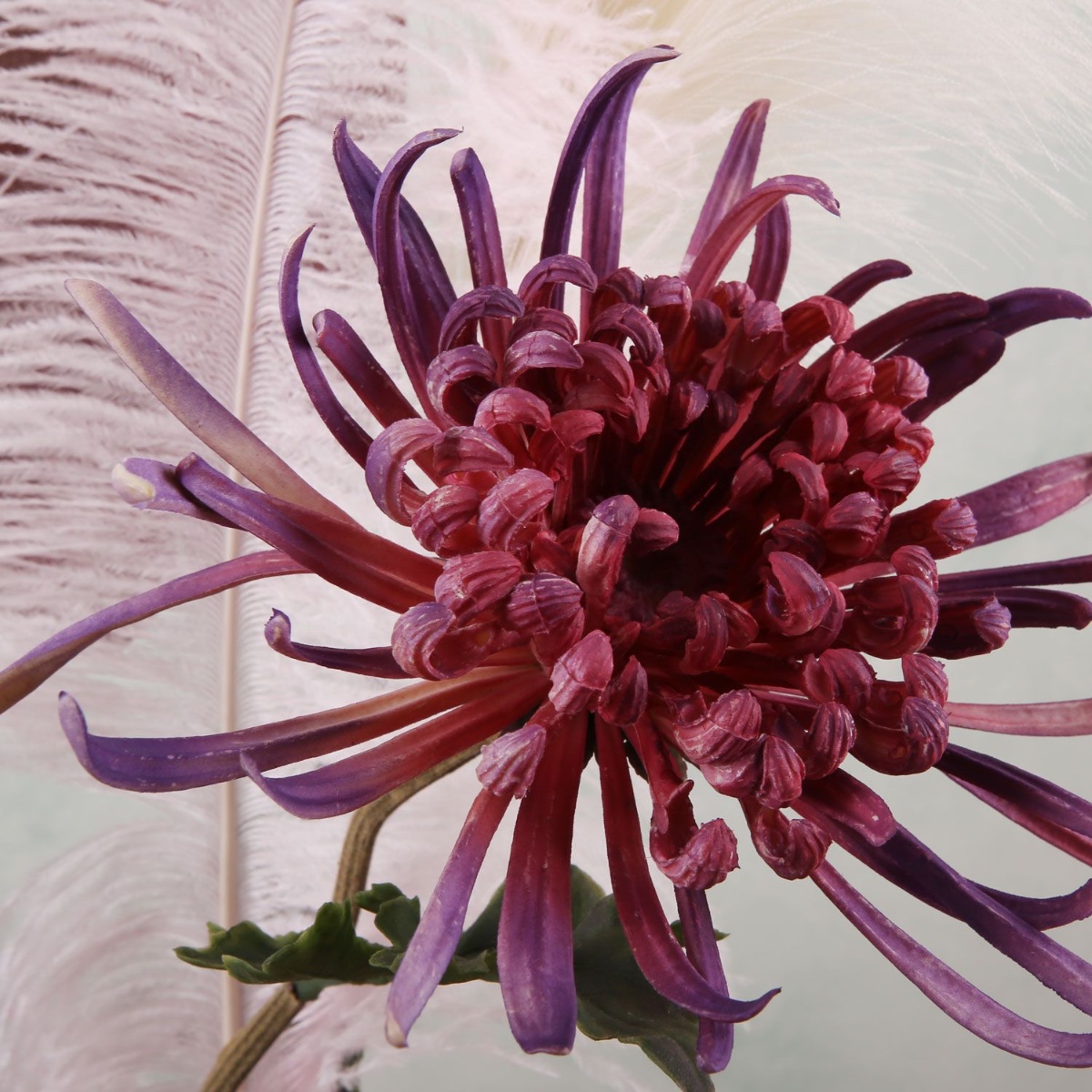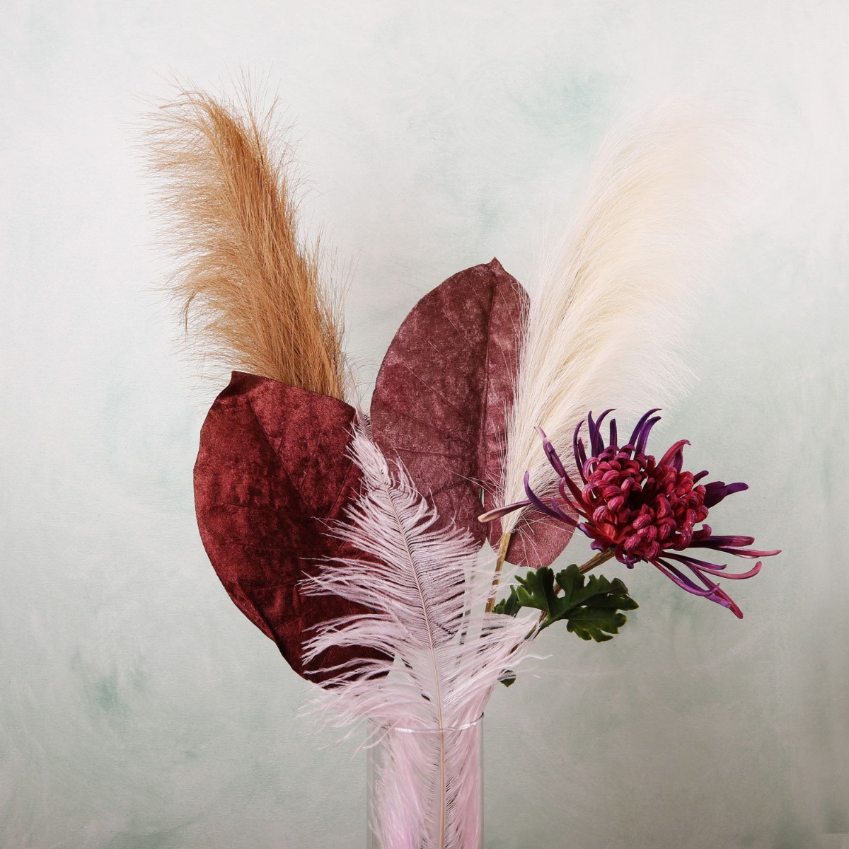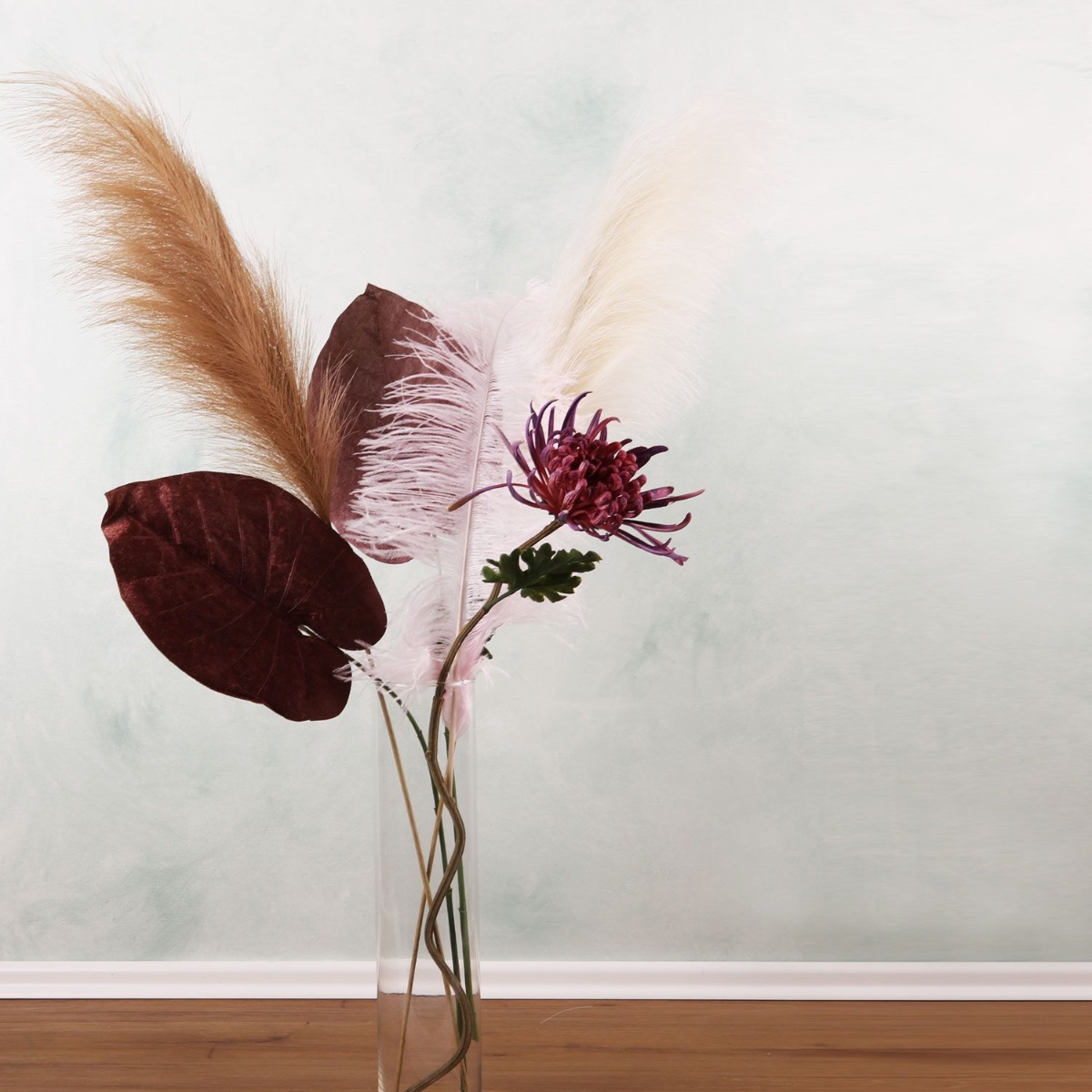 Peří a samet! Léto konečně skončilo a temné dny mění naši náladu. Večery doma si zpestříme šálkem čaje nebo teplého kakaa a můžeme pozorovat padající podzimní listí. Tento podzimní vzhled vytvoří ve vašem obývacím pokoji útulnou atmosféru. Sametové listy, péřové trávy a pravé pštrosí peří jsou tak měkké, že se k nim budete chtít přitulit. Ale fialová chryzantéma vám v tom zabrání. Nakupte si tento vzhled!