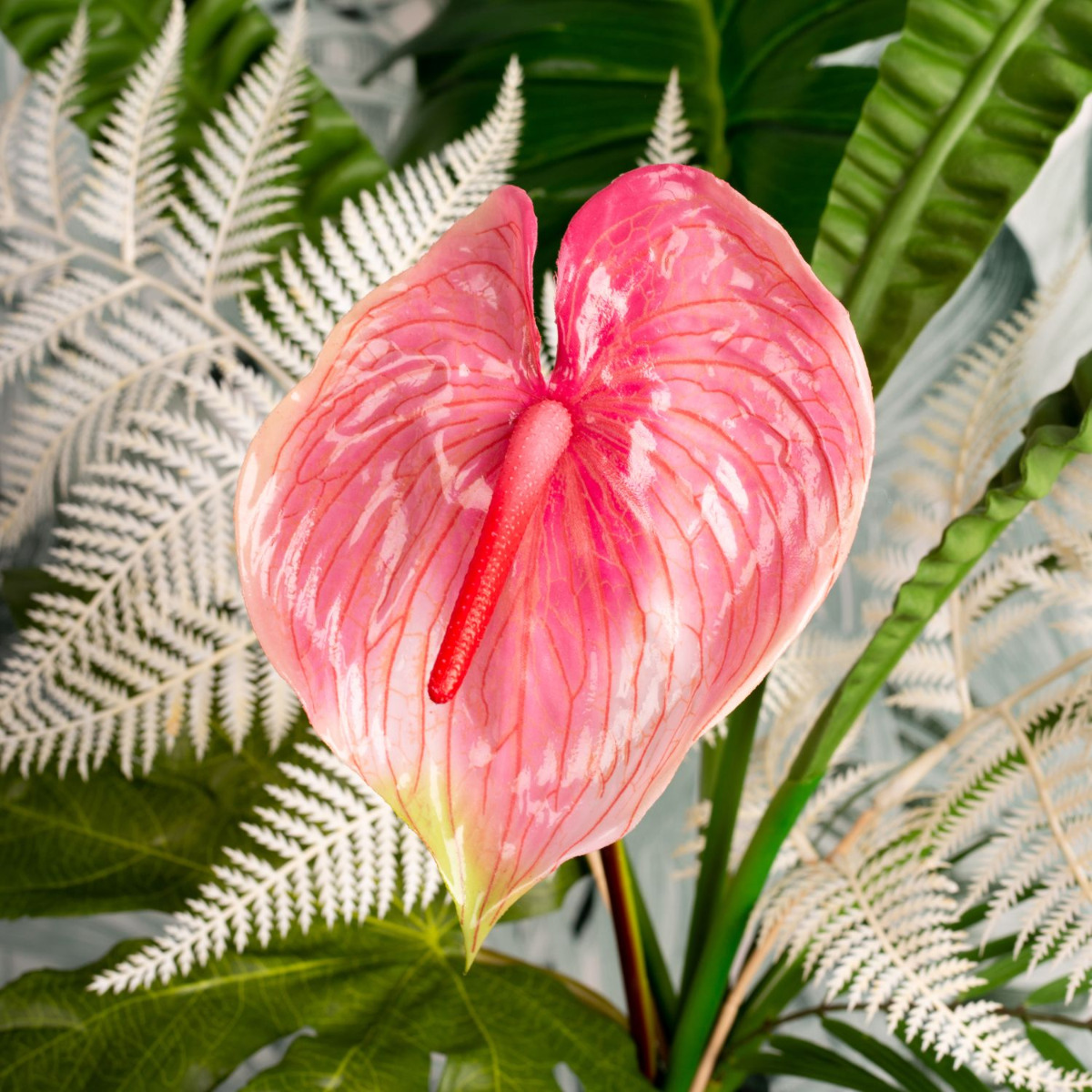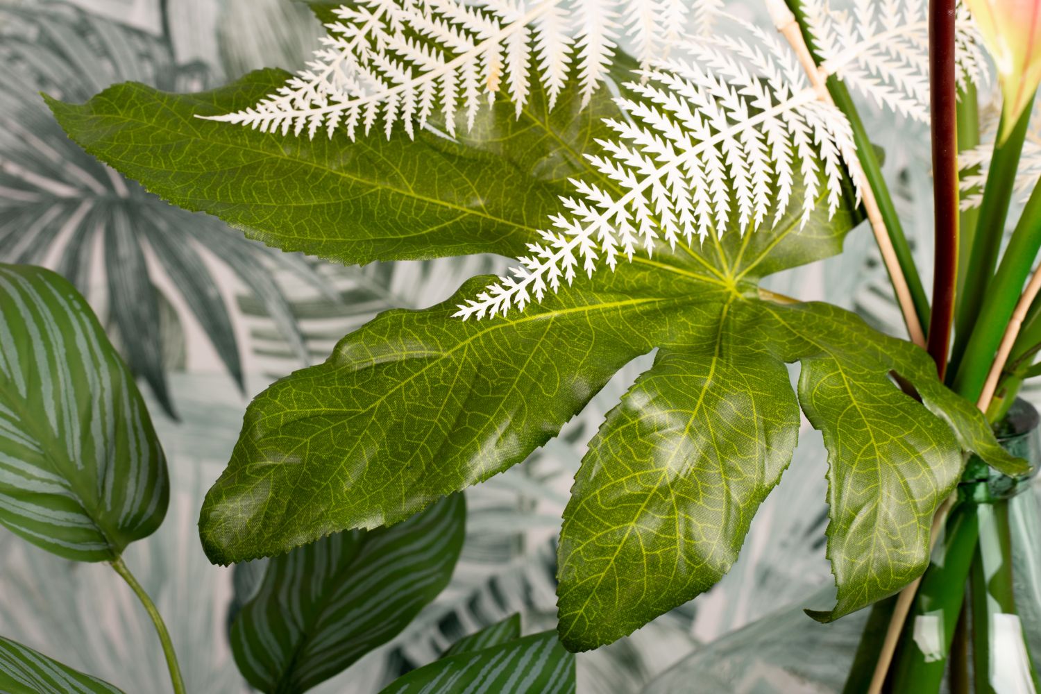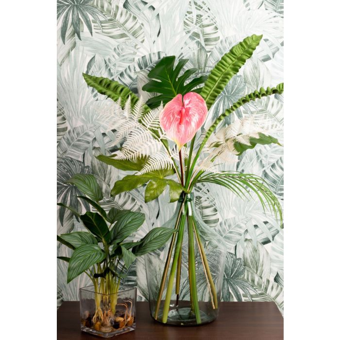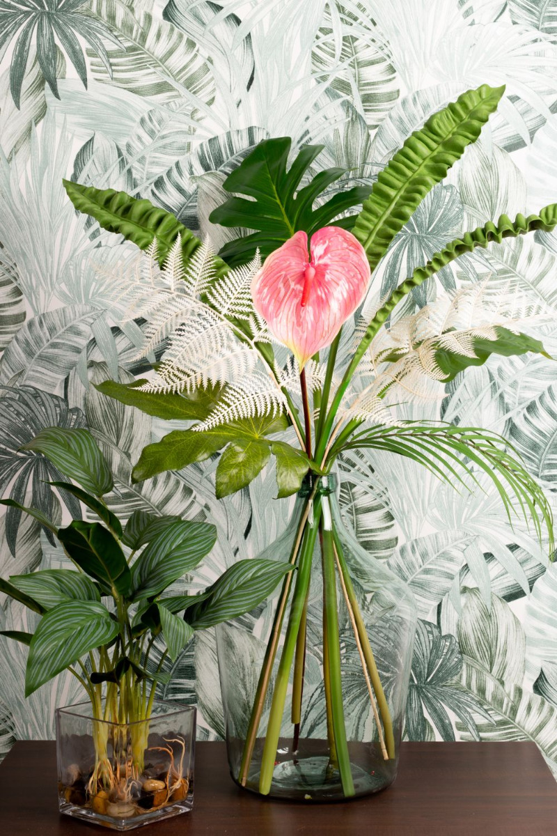Zelená, zelená a ještě jednou zelená! Tohle je džungle. A občas v ní zazáří barevný květ. My jsme si vybrali růžový květ plaménku. Ve velkém zeleném skleněném balonu jsou zapíchané různé listy kapradin, palmové listy, filodendron, zantedeschia a list arálie. Umělá Aglaonema ve skleněném květináči podporuje zeleň v kytici a dokonale zapadá do naší výzdoby. Zelená barva působí uklidňujícím a relaxačním dojmem. Proto se náš vzhled hodí zejména do místností, které vyžadují uvolněnou atmosféru. Například v kanceláři. Nakupte si vzhled!