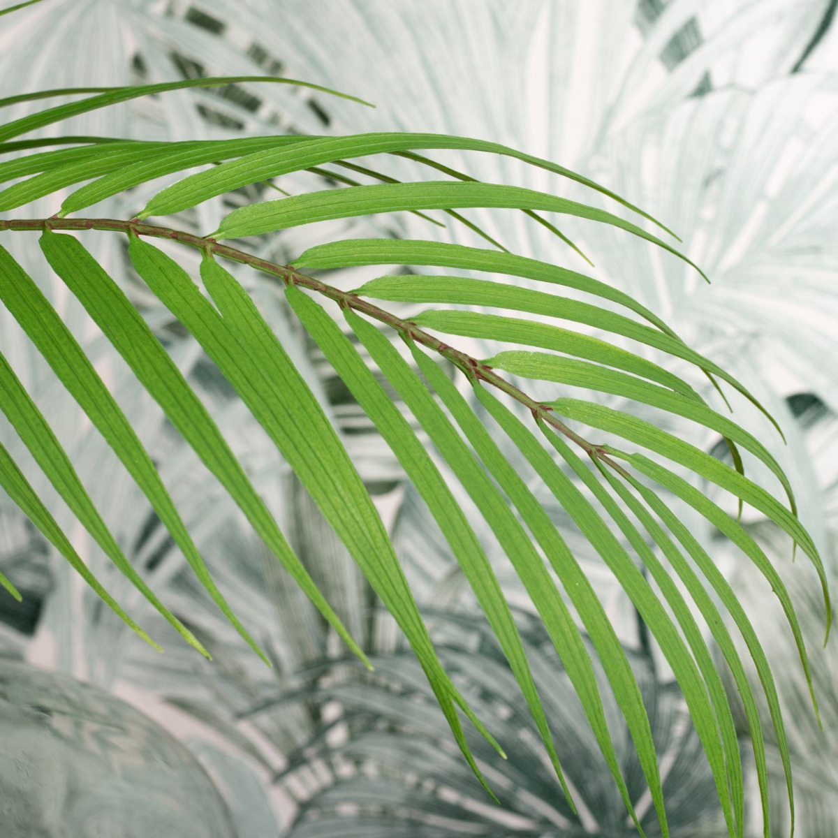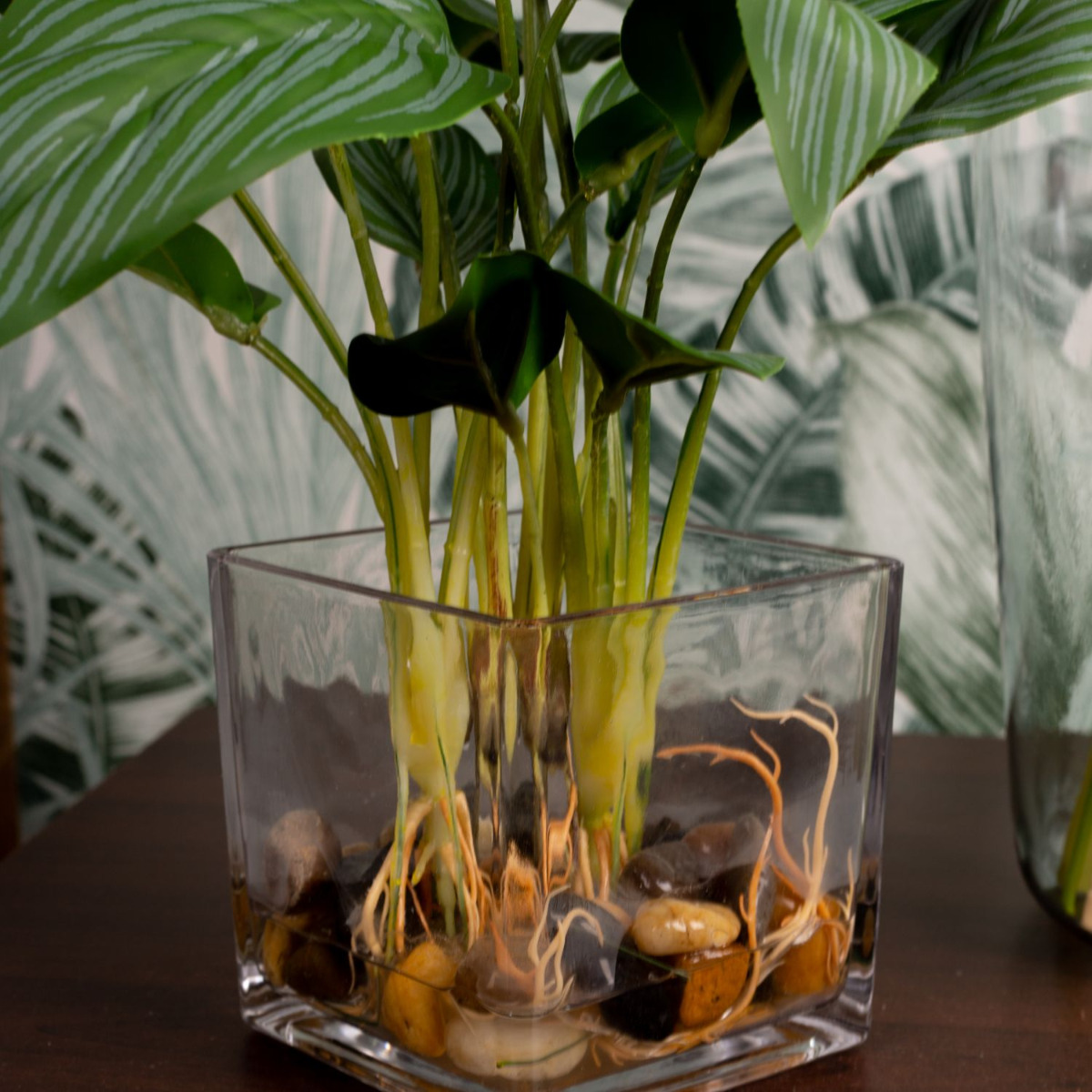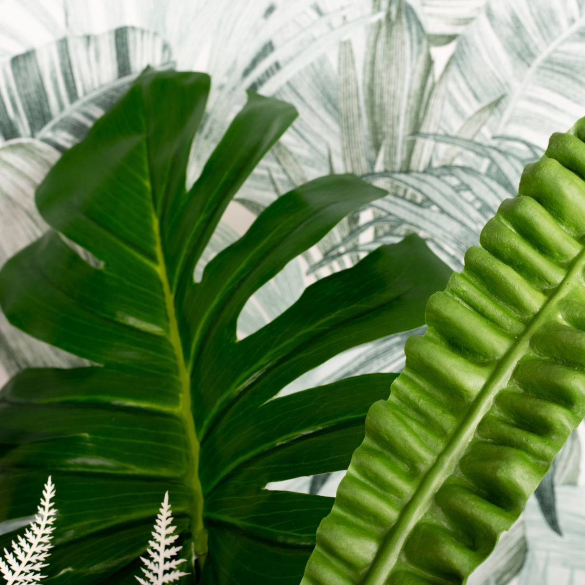 Zelená, zelená a ještě jednou zelená! Tohle je džungle. A občas v ní zazáří barevný květ. My jsme si vybrali růžový květ plaménku. Ve velkém zeleném skleněném balonu jsou zapíchané různé listy kapradin, palmové listy, filodendron, zantedeschia a list arálie. Umělá Aglaonema ve skleněném květináči podporuje zeleň v kytici a dokonale zapadá do naší výzdoby. Zelená barva působí uklidňujícím a relaxačním dojmem. Proto se náš vzhled hodí zejména do místností, které vyžadují uvolněnou atmosféru. Například v kanceláři. Nakupte si vzhled!
