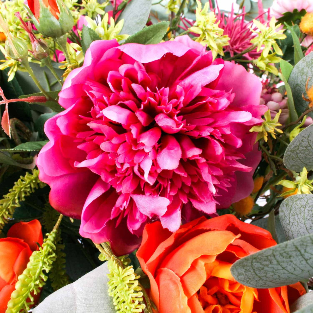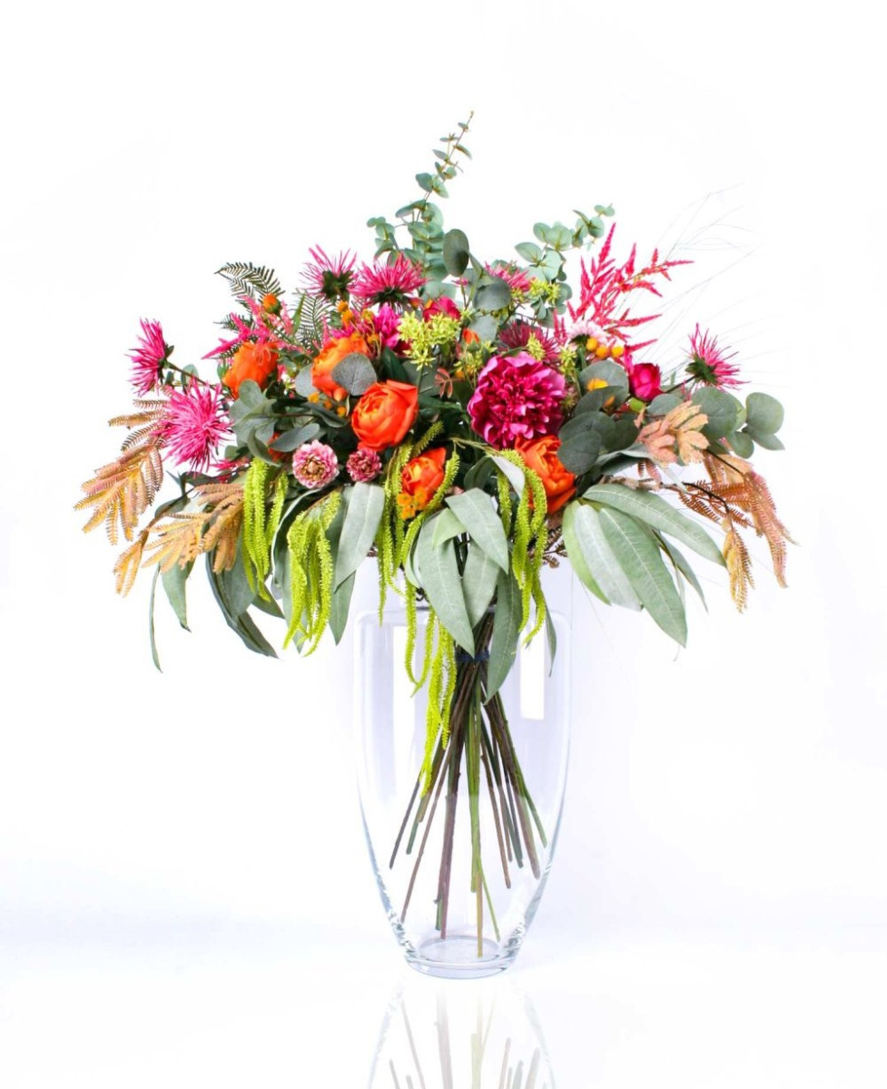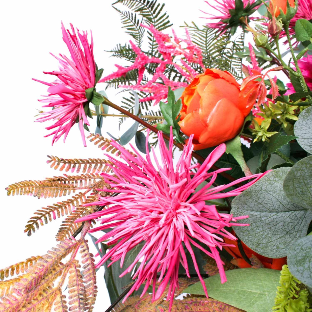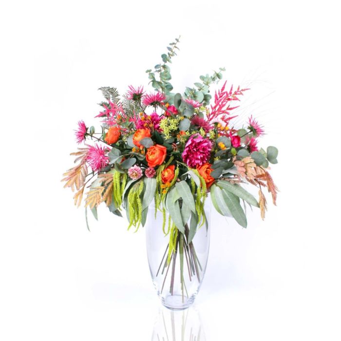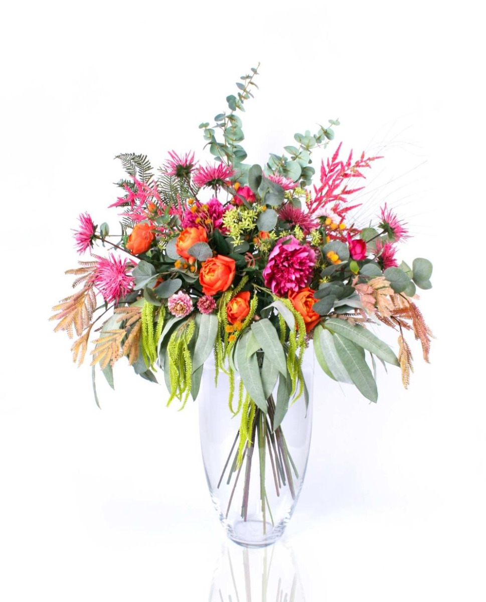 Barevná umělá kytice! Natali nám napsala e-mail a požádala nás, jestli bychom mohli znovu vytvořit také kytice květin, kdyby nám poslala jejich obrázek. Samozřejmě jsme odpověděli kladně. V další zprávě od Natali jsme obdrželi obrázek kytice, kterou si přála a kterou náhodou viděla v restauraci. Romantická, hravá kytice v odstínech růžové a žluté. Hojnost a styl kytice se jí velmi líbily, ale chtěla, aby její kytice, která by měla najít místo v jejím novém bytě, byla ve fuchsiové barvě s trochou oranžové, aby ladila s novým vybavením. Po dvou hodinách hledání v naší prodejně a ve skladu jsme našli ty správné květiny. První exemplář se na první pokus docela povedl, ale chybělo ještě trochu svěží zelené, aby kytice získala jasný letní nádech. Odpovídající větvičky se nám dostaly do rukou náhodou ve skladu. Přidali jsme větvičky do kytice a rozložili zeleň mezi barevné květiny a kytice měla naprostý úspěch. Naší zákaznici se kytice hned zalíbila, což nás velmi potěšilo. Samozřejmě jsme o tuto krásnou kytici nechtěli připravit další zákazníky, a tak jsme vybrali odpovídající vázu. Chcete také dodat svému obytnému prostoru nový lesk? Nakupte si vzhled!