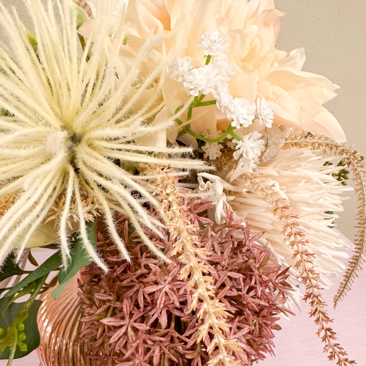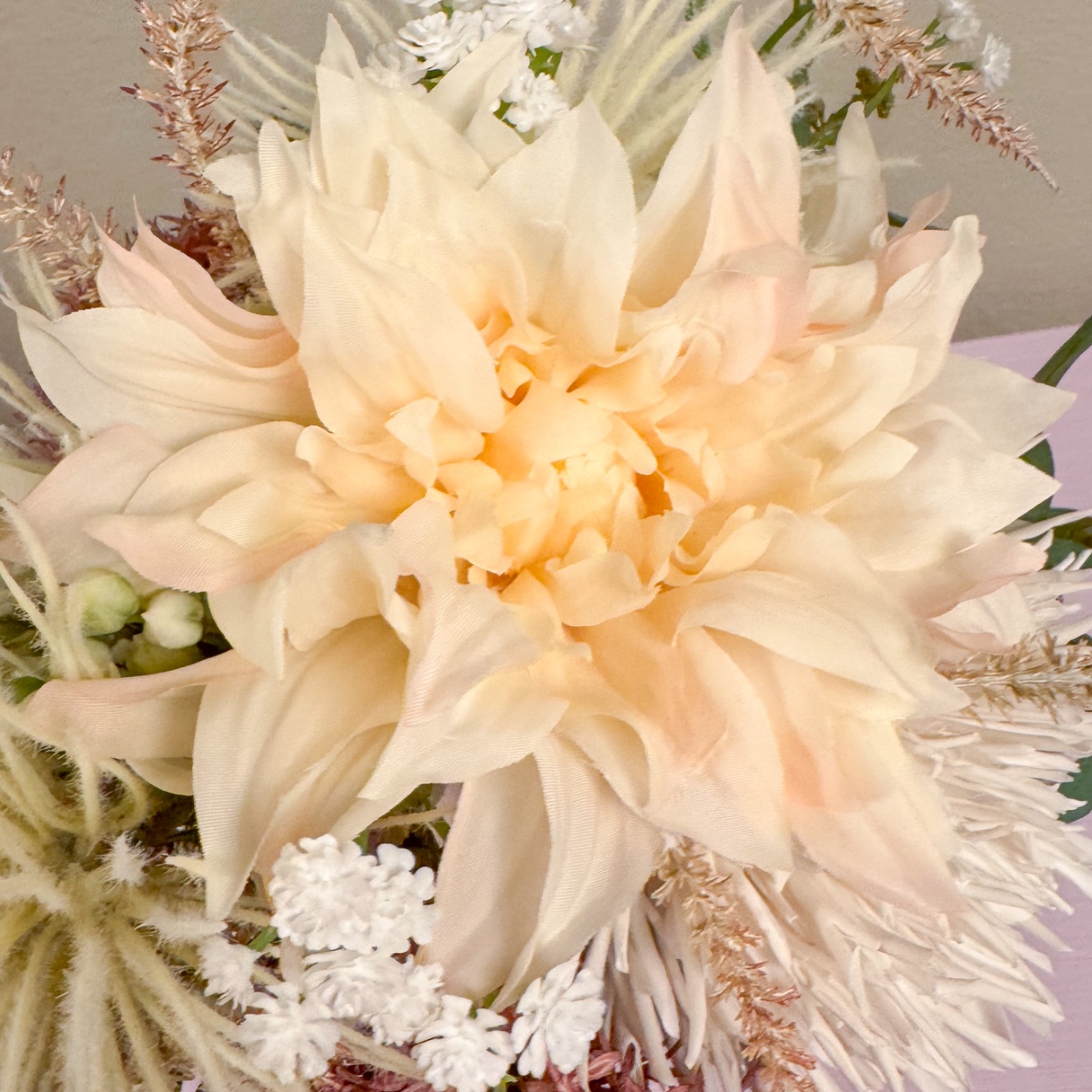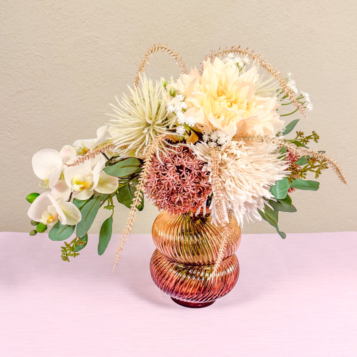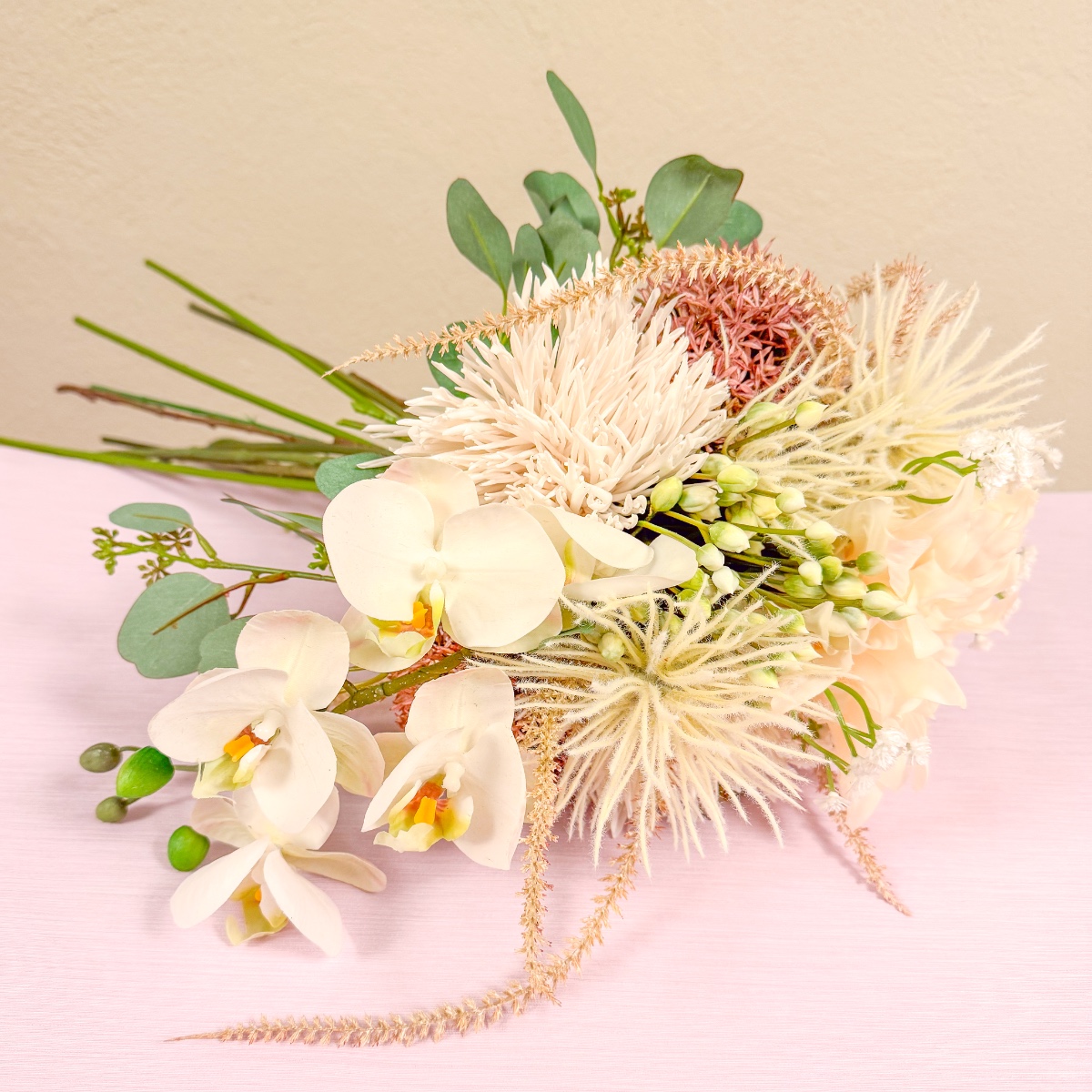 Divoká chryzantéma a elegantní orchidej! Ke svatebním šatům v jemné růžové barvě chyběla už jen odpovídající svatební kytice. Orchideje byly nutností - v kombinaci s květinami, které dokonale ladily s barvou šatů. Výsledkem byla elegantní kytice, která vyzvedla jemné tóny šatů a stylově doplnila Celinin vzhled. Nakupte si tento vzhled!