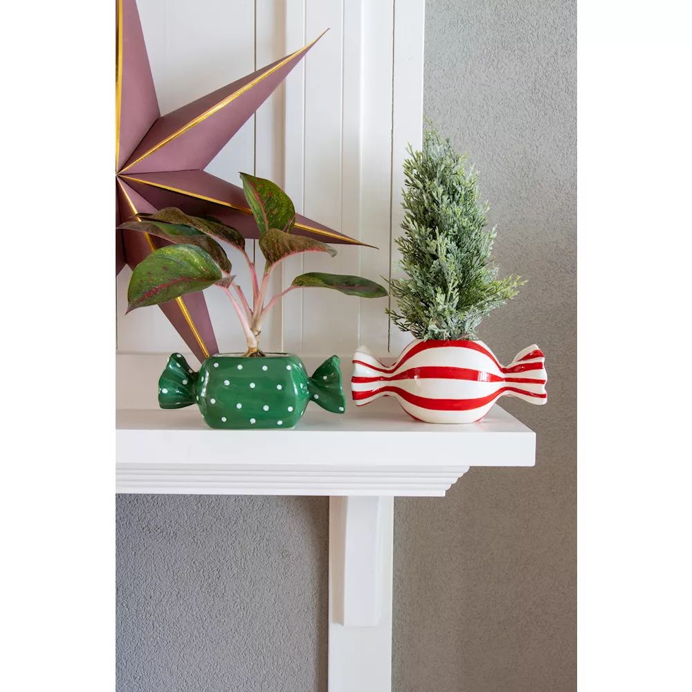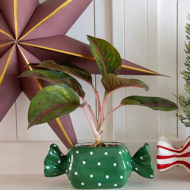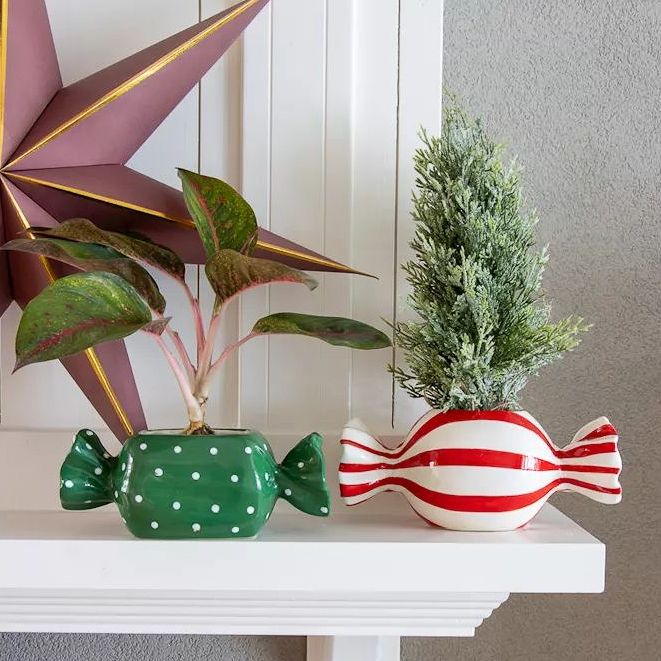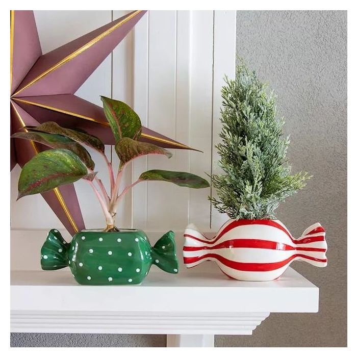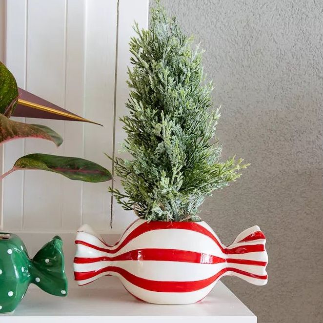 Jemný vánoční lesk v hravém obalu! Čistý, moderní vánoční vzhled, ve kterém dominují jasné tvary a decentní barvy. Malý, zasněžený mini jedlička vnáší do aranžmá klasické zimní kouzlo. Vedle ní stojí Calathea ornata, jejíž jemné růžové žilky listů dodávají elegantní, moderní akcent. Obě rostliny jsou zasazeny v keramických květináčích ve tvaru bonbónů – jediném záměrně hravém prvku v jinak zdrženlivém stylu. Lesklé květináče ve tvaru bonbónů spojují sváteční sladkost s moderní jednoduchostí a vytvářejí tak jemný, okouzlující kontrast. V pozadí visí vánoční hvězda, která svou lehkou grafickou přítomností doplňuje celek, aniž by scénu přeplňovala. Celkový dojem: minimalistický, moderní, zimní – s nádechem hravé slavnostnosti. Kupte si tento look!