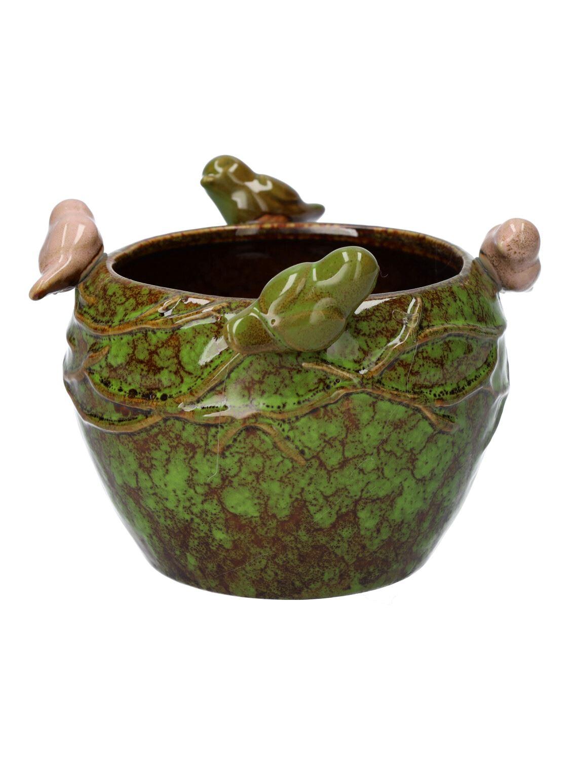 Keramický květináč SARINO, s 3D ptáčky, zeleno-hnědo-béžový, 10,5cm, Ø14cm