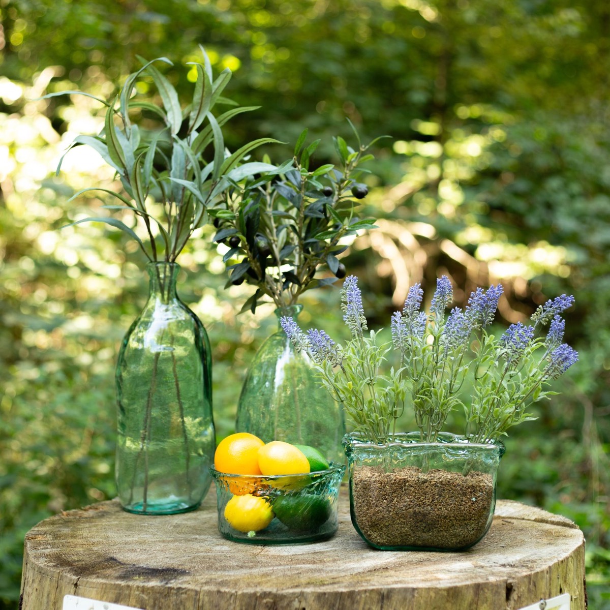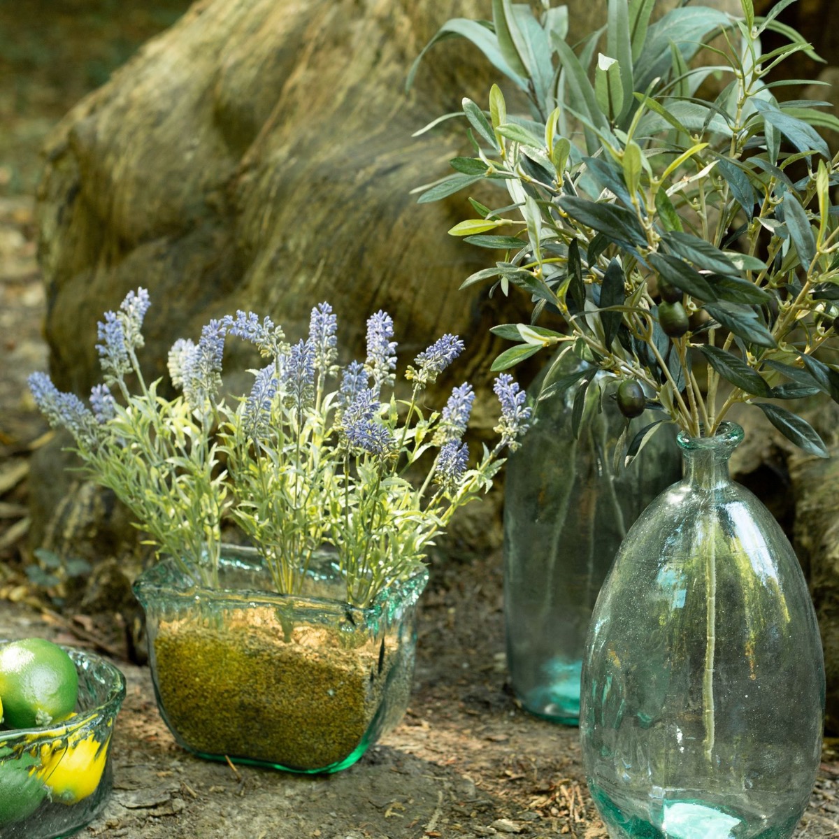 Lavender, olivy a limetka! Okamžitě se vám vybaví příjemná letní noc v Itálii nebo ve Španělsku. Třpytivě modré láhve a skleněné misky jsou ideální pro středomořskou dekoraci. Jejich nerovný lomený okraj je opravdu neobvyklý a obzvlášť dobře zvýrazňuje namodralý efekt skla. Cibulovité lahve zdobí olivové a eukalyptové větvičky, zatímco do vyšší skleněné misky byla umístěna levandule. Tentokrát jsme použili speciální korkový granulát, který je obzvlášť jemný a vypadá opravdu krásně a přirozeně. Tato dekorace je velmi vhodná i pro venkovní použití, protože sklenice mají velmi silné stěny. Nakupte si tento vzhled!