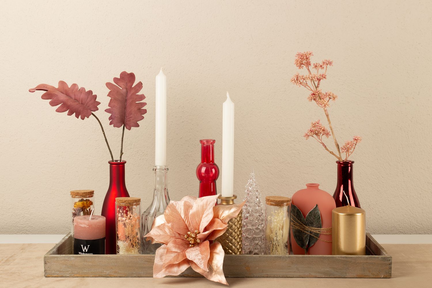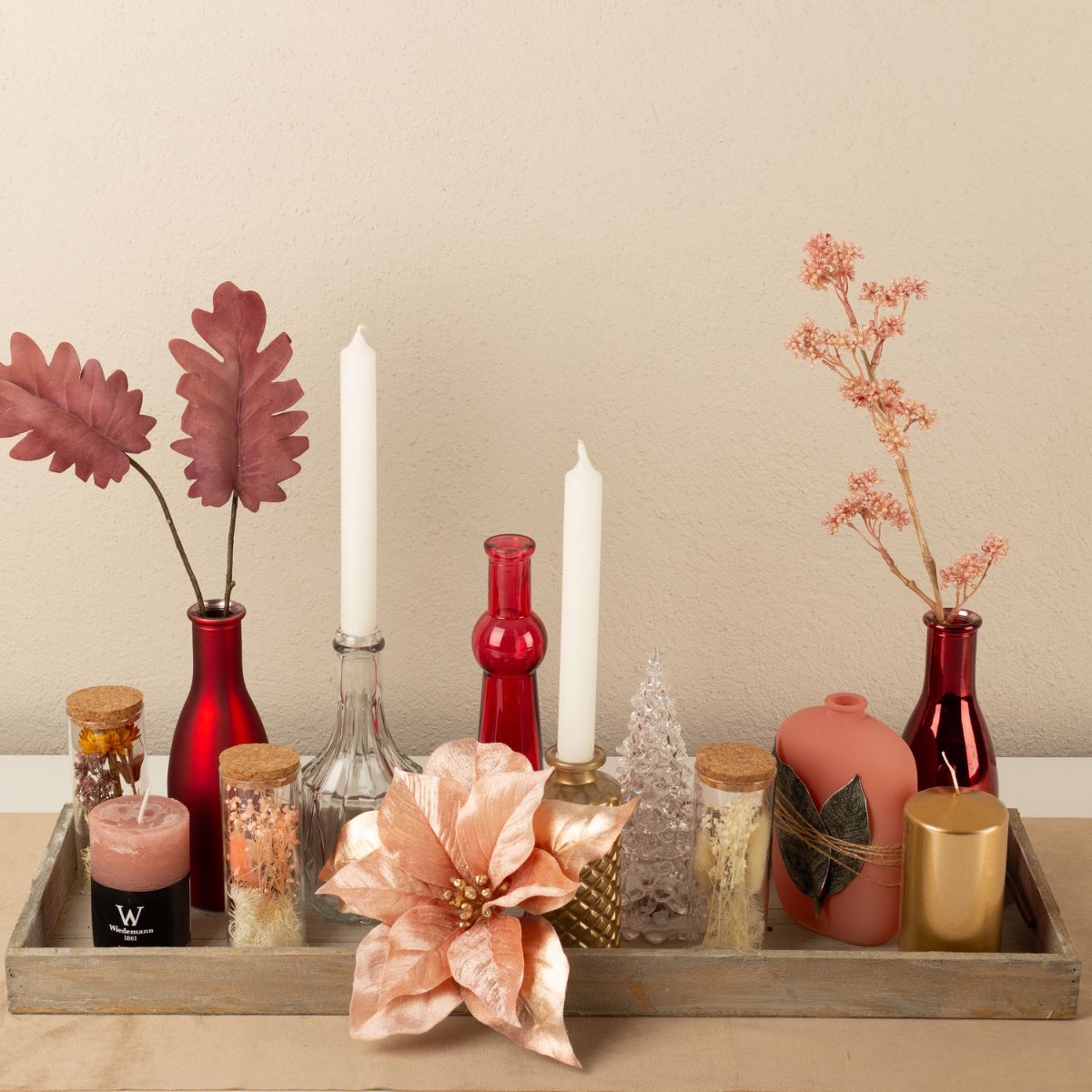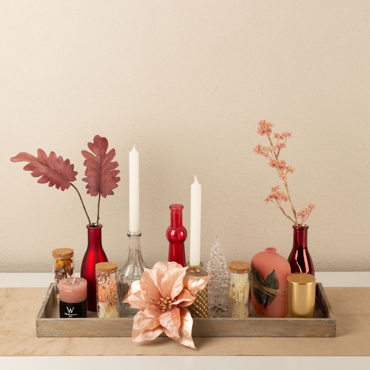 Designový tip: Jednotlivé prvky, jako jsou láhve a svíčky, rozmístěte na podnos a dbejte na to, aby svíčky byly v různých výškách. Větve ohněte a případně zkraťte na velikost vázy. Poinsettie by měla být v popředí. Růžovou láhev ovažte dvěma listy a provázkem na balíčky.