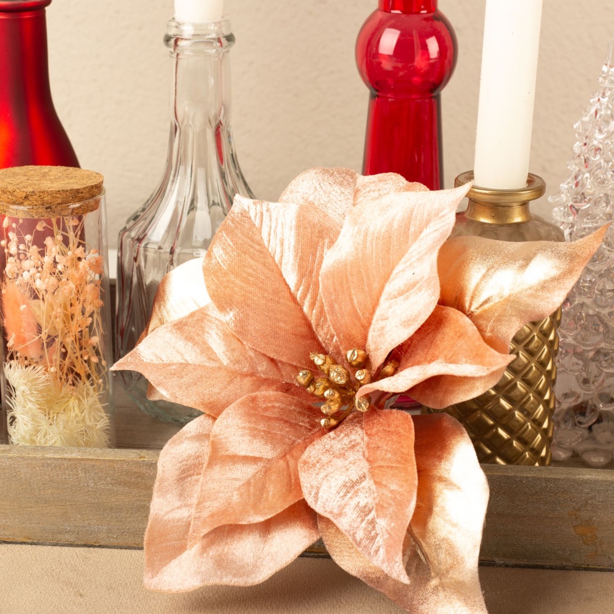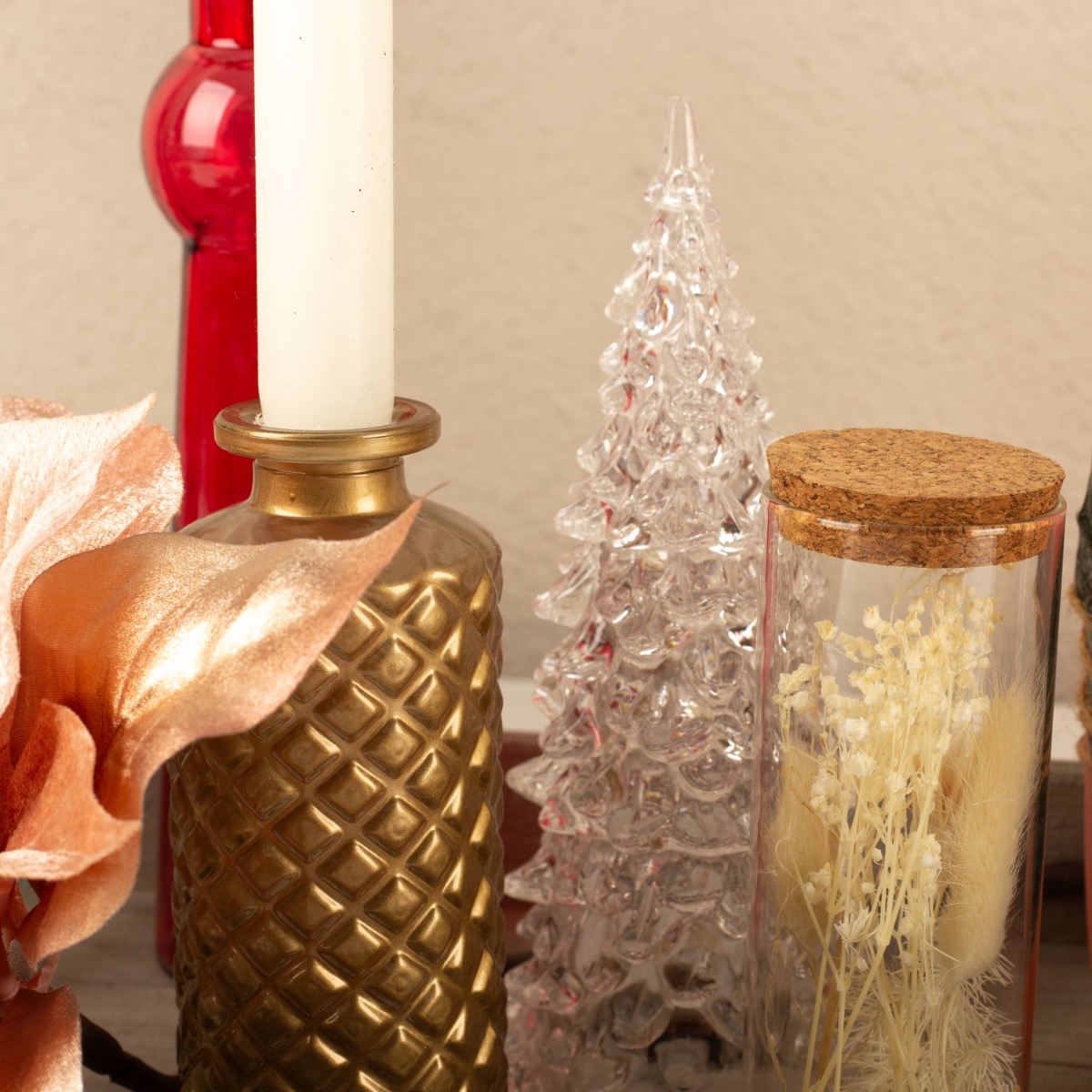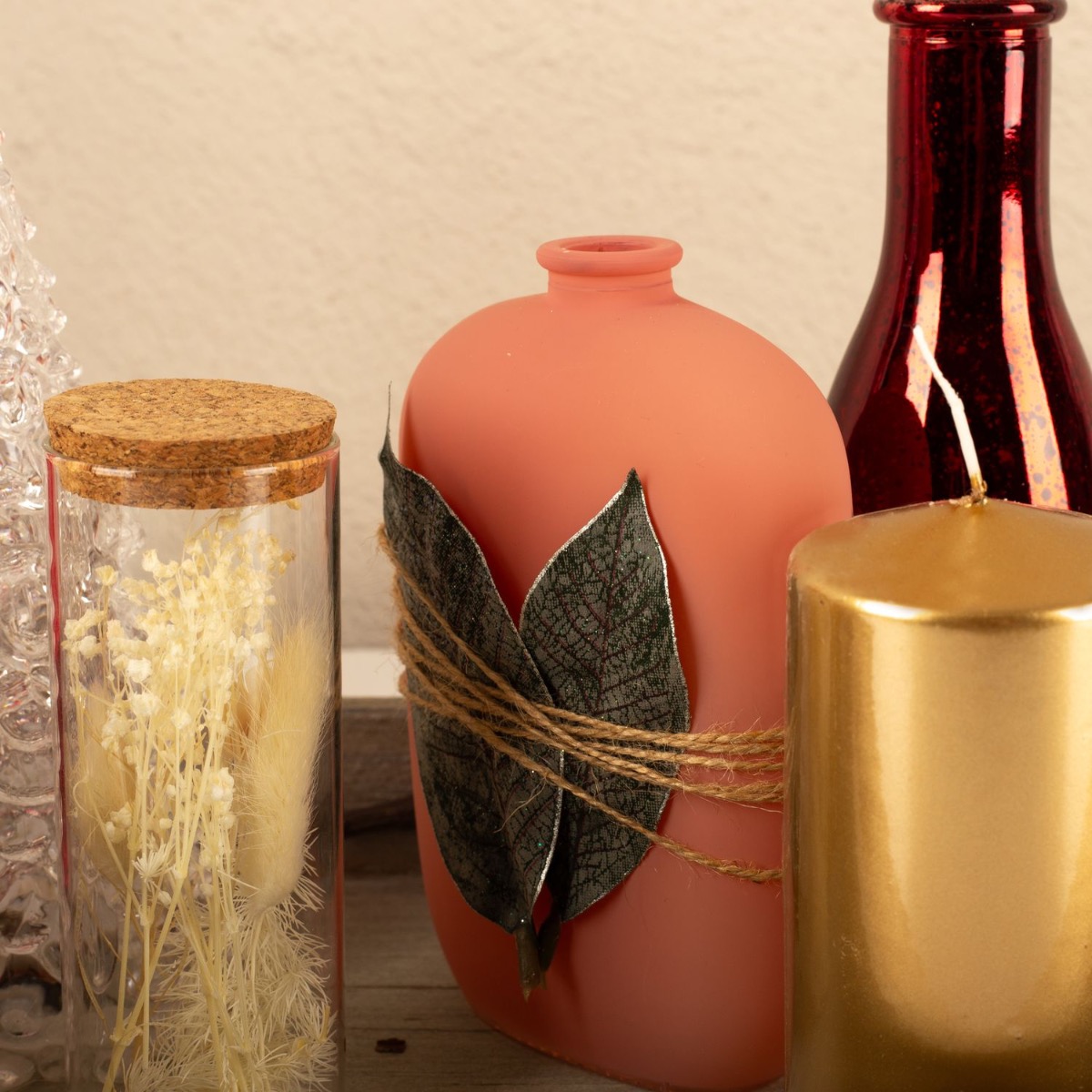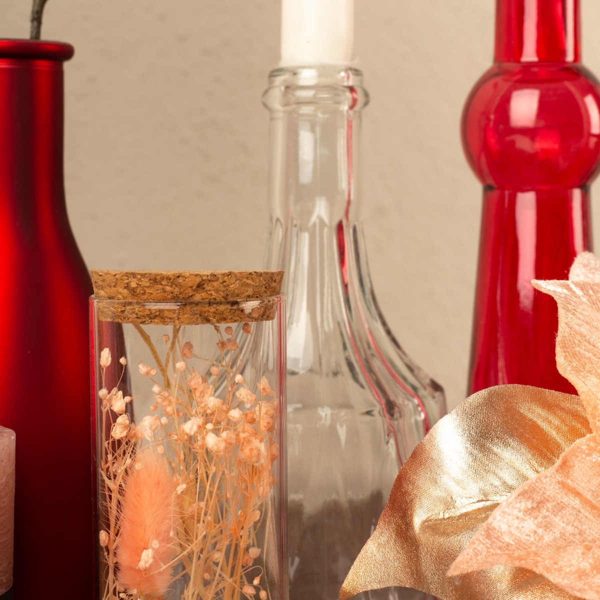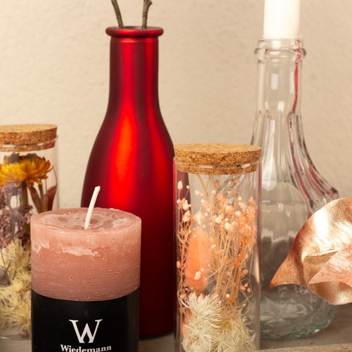 Rosé a zlato! Tento adventní look představuje zcela nový přístup k adventnímu období. Jediné, co připomíná klasický adventní věnec, jsou čtyři svíčky, které se zapalují každou adventní neděli, a sametové poinsettie, které jsou během vánočního období vidět všude. Množství malých lahviček lze naplnit různými větvičkami. My jsme se rozhodli pro netypické prvky, jako je soumračně růžový list filodendronu nebo růžově zbarvený plod krasavice. Protože tento vzhled prospívá změnám a během adventního období jej lze dále přizpůsobovat. Protože v některých lahvích je ještě prostor pro rozšíření výzdoby. Nakupte si tento vzhled!
