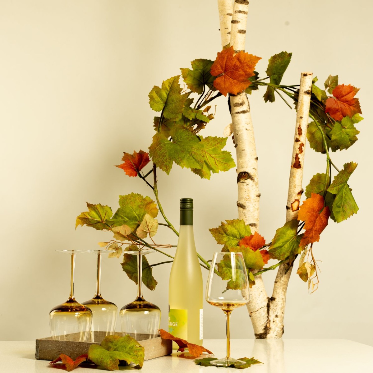 Designový tip: Zavěste vinné listy na vhodné místo jako kruh nebo rovnou. Sklenice naaranžujte na podnos. Několik vinných listů jsme použili jako podtácky. Měli byste však odstranit zelený plast ze zadní strany. Lze ho jednoduše odloupnout.