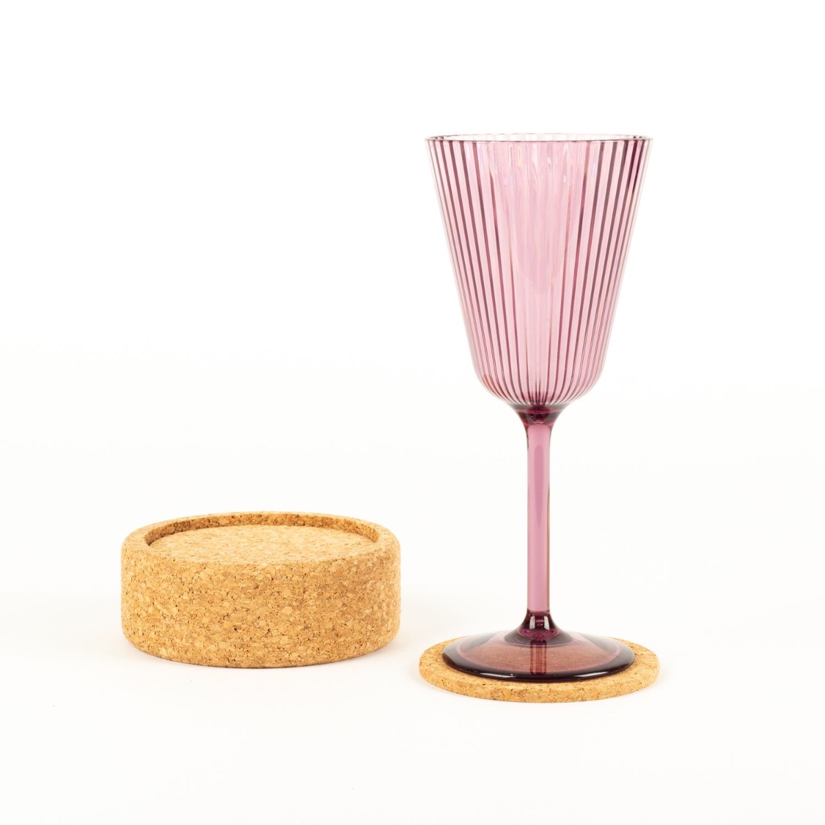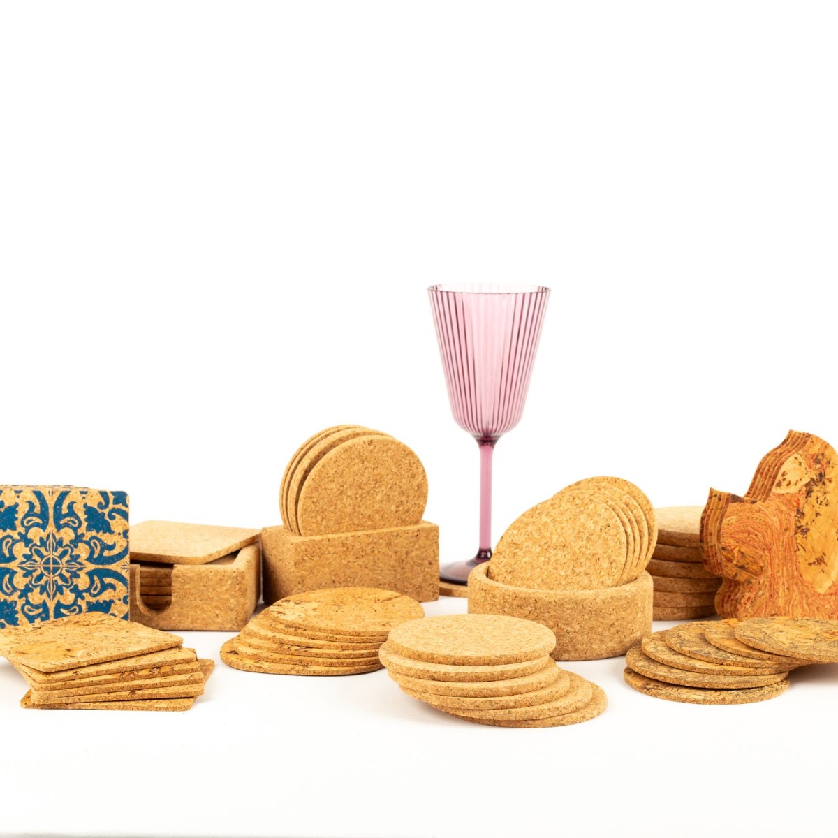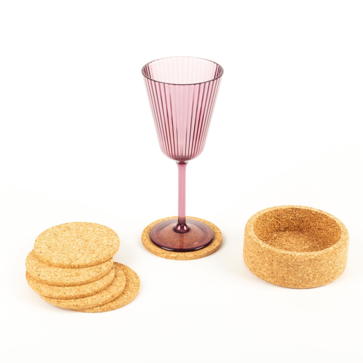 Kulatý korkový skleněný podtácek HALINA s držákem, 6 kusů, přírodní, Ø9cm, tloušťka 0,5cm