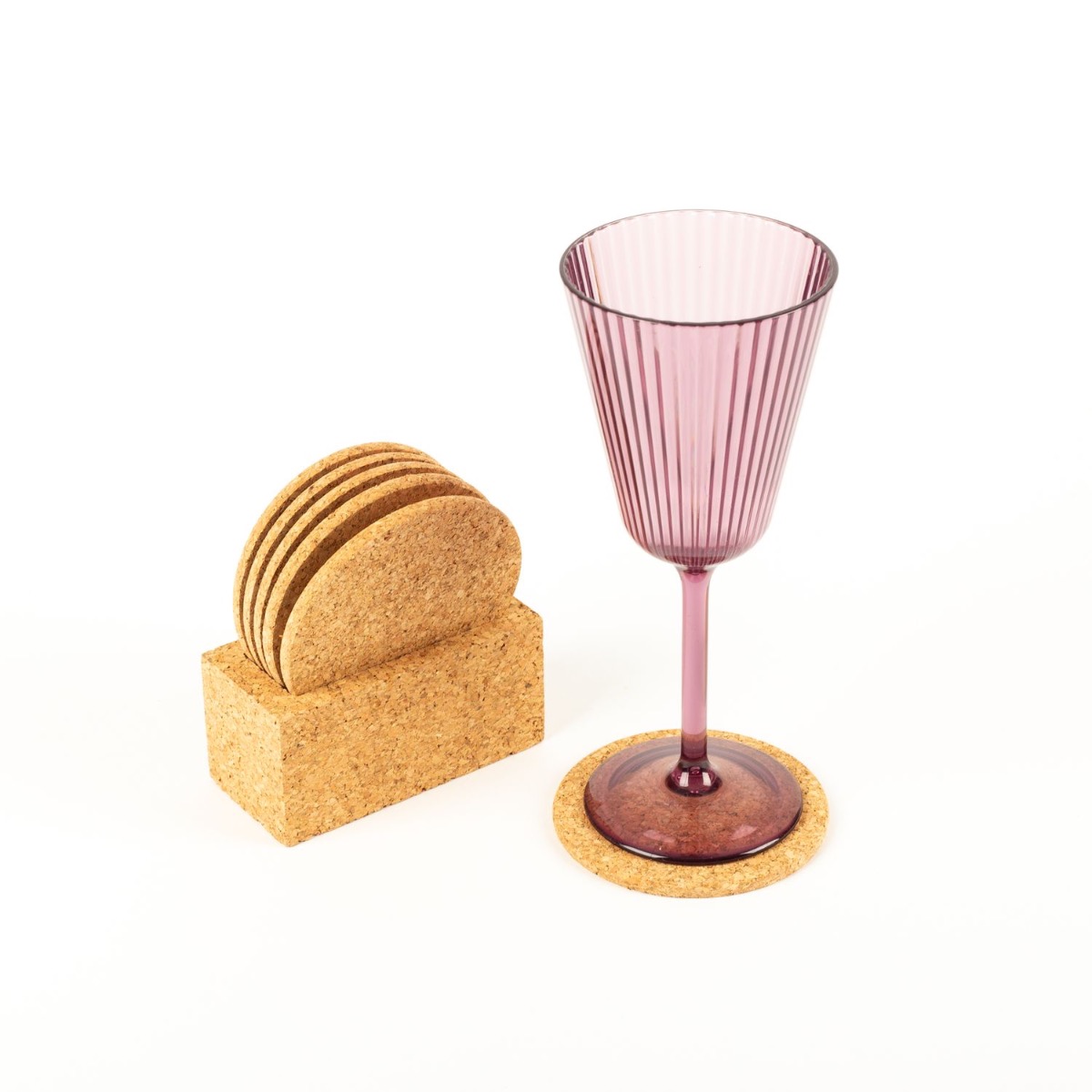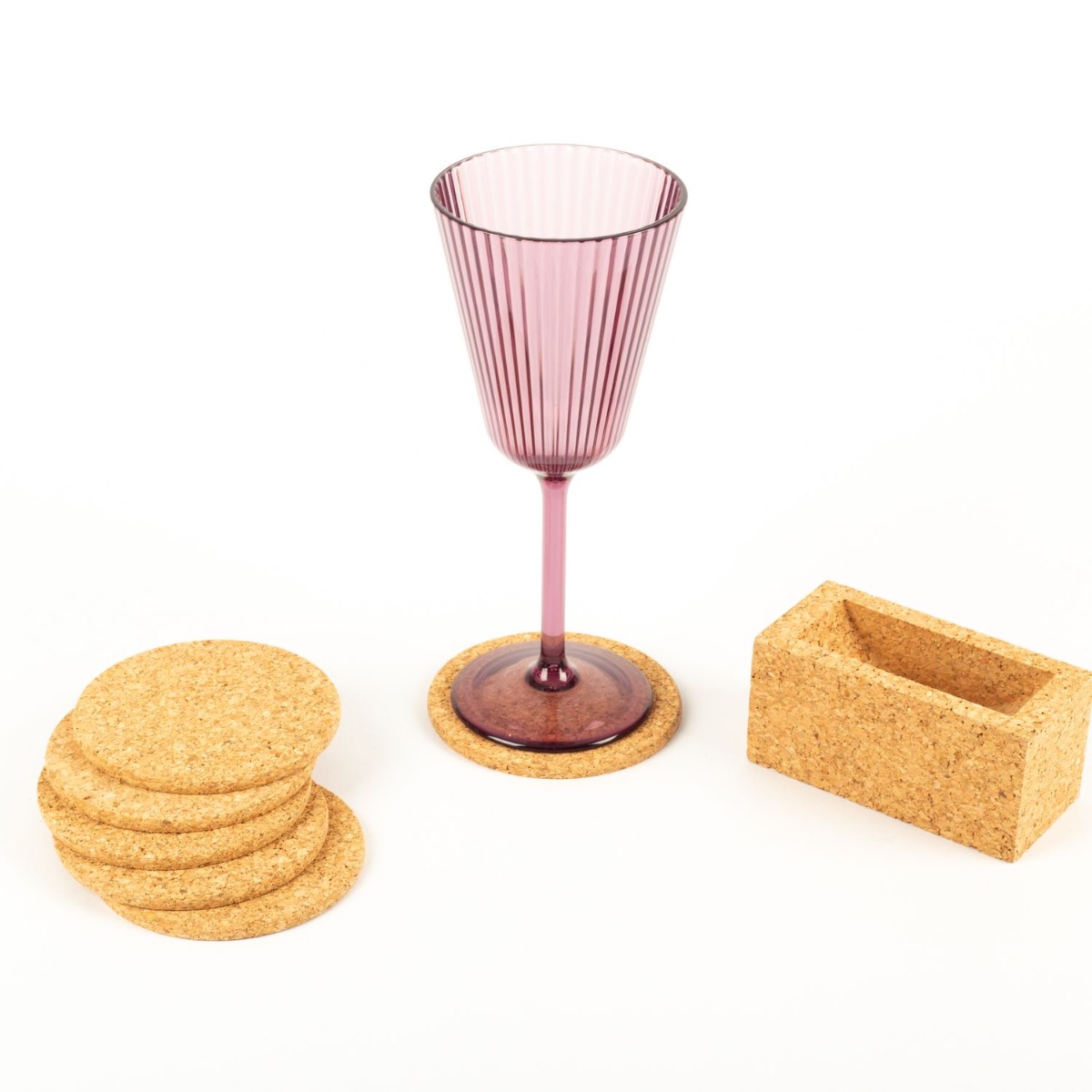 Kulatý korkový skleněný podtácek NANEA se stojánkem, 6 kusů, přírodní, Ø9cm, tloušťka 0,5cm