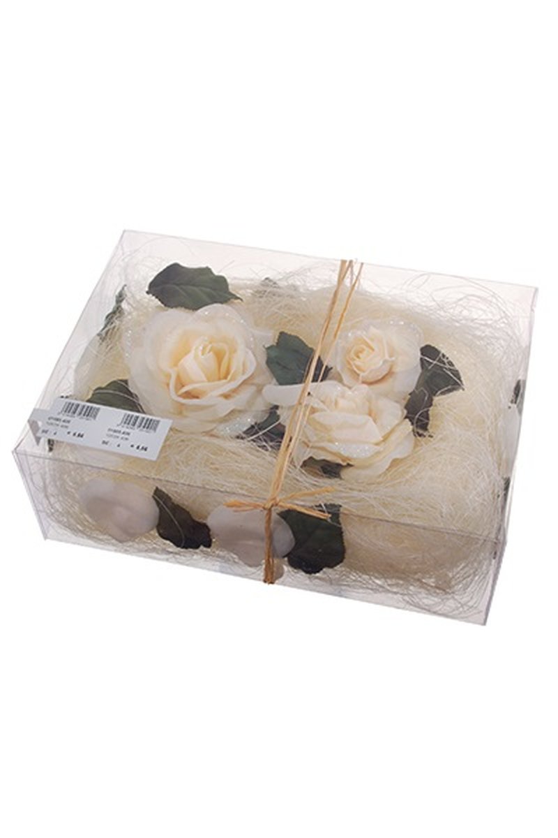 Květinová dekorace ZUMA s růžemi, listy, perly, sisal, krémová, 5cm