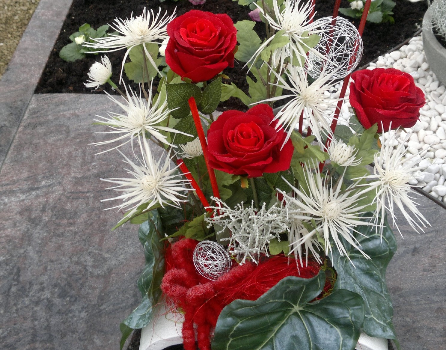 Květiny na počest zemřelých! Červená a bílá: oblíbené barvy pro svatební kytice, ale také pro hrob. To si myslela i naše zákaznice Kornelia, která si jako květiny pro své s láskou naaranžované hrobové aranžmá vybrala růže a chryzantémy v těchto barvách. Květinové aranžmá na hřbitov doplňují listy anturie, bylinky a další dekorační materiály. Nakupte si tento vzhled!