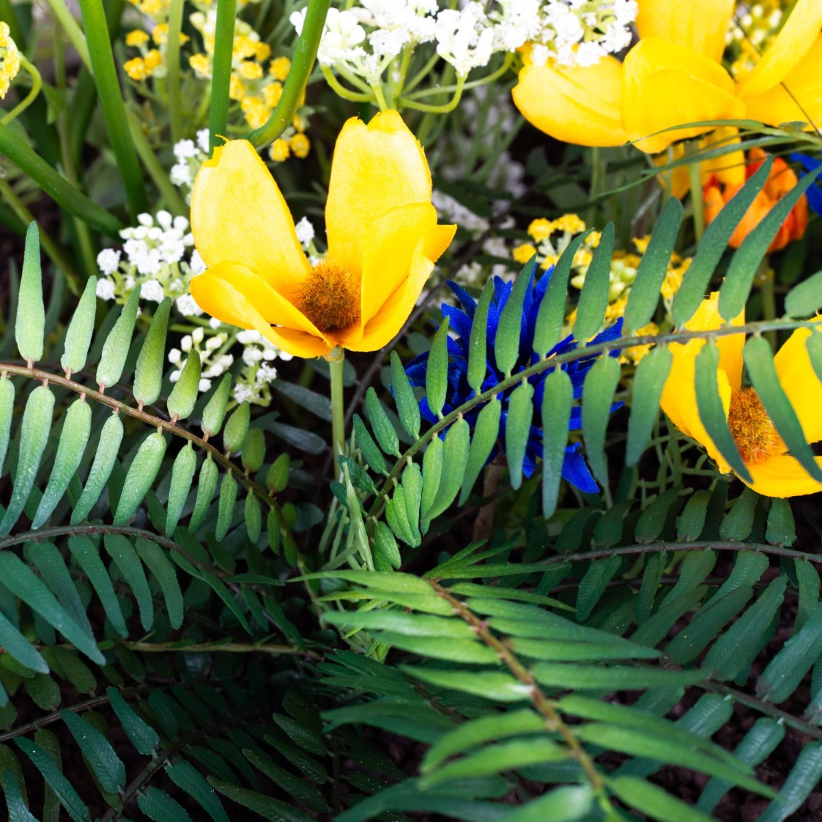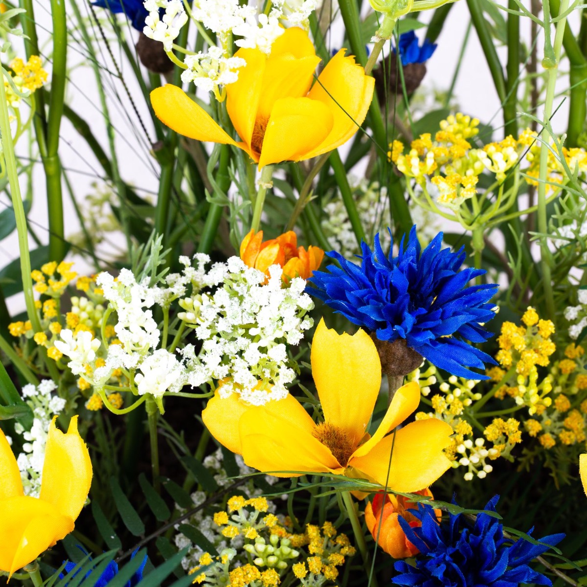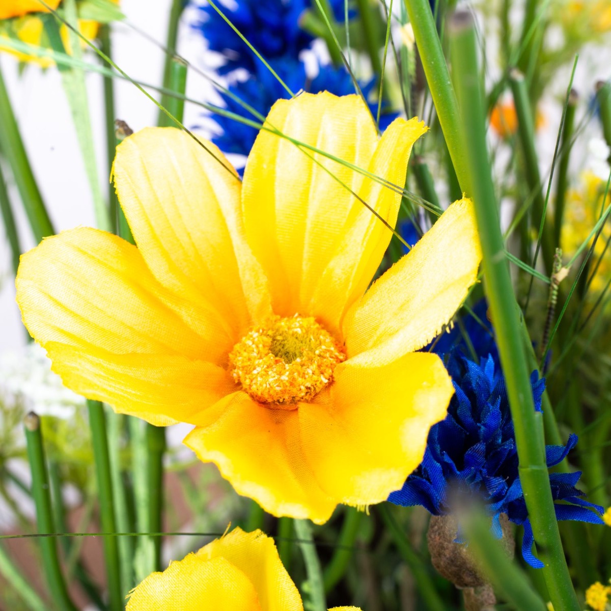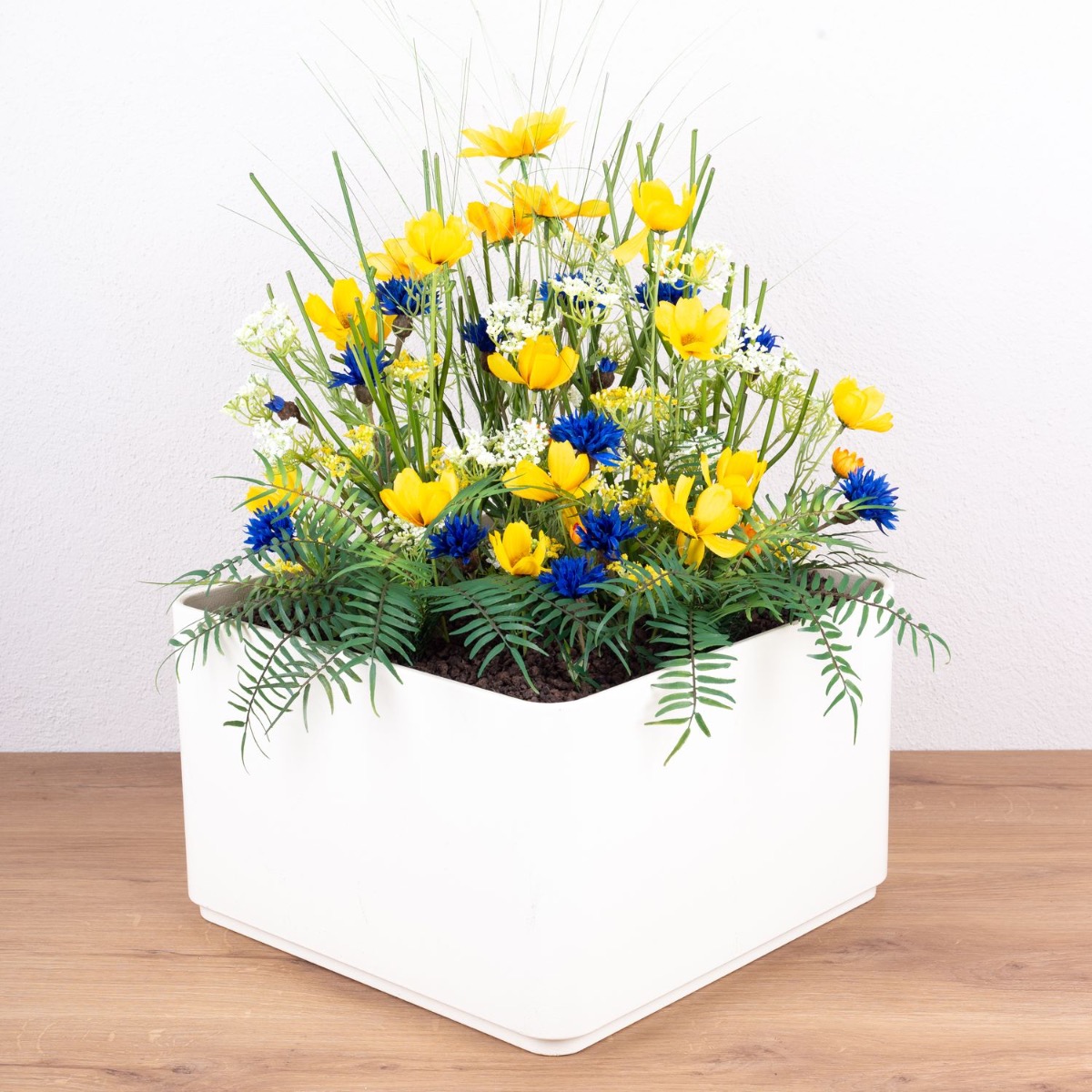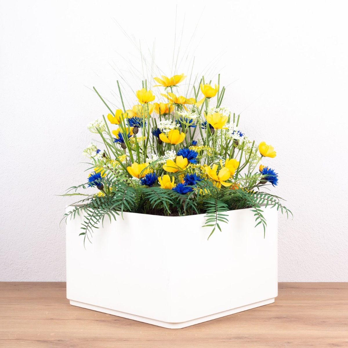 Váš projekt je pro nás výzvou, zvláště když zadání neklade kreativitě žádné meze. Jörg cestoval z daleka, aby nám přivezl květináče, které měly být naplněny našimi umělými rostlinami. Přivezl také několik fotografií svého domova, protože barvy musely ladit. Převládat měla signální žlutá a tmavě modrá. V tomto aranžmá se dokonale uplatnily Jörgovy oblíbené barvy, které spolu vytvořily harmonické uspořádání. Jasně žluté kosmeas, známé také jako košíky na šperky, nejenže vypadají hezky, ale mají také nádherný význam. Znamenají mír! Kdo by ho nechtěl mít doma? Modré chrpy mají také zvláštní symboliku. Symbolizují krásu a čistotu. To se k Jörgovi, který si dává tolik záležet na vytvoření krásného domova, opravdu hodí. Nakupte si tento vzhled!