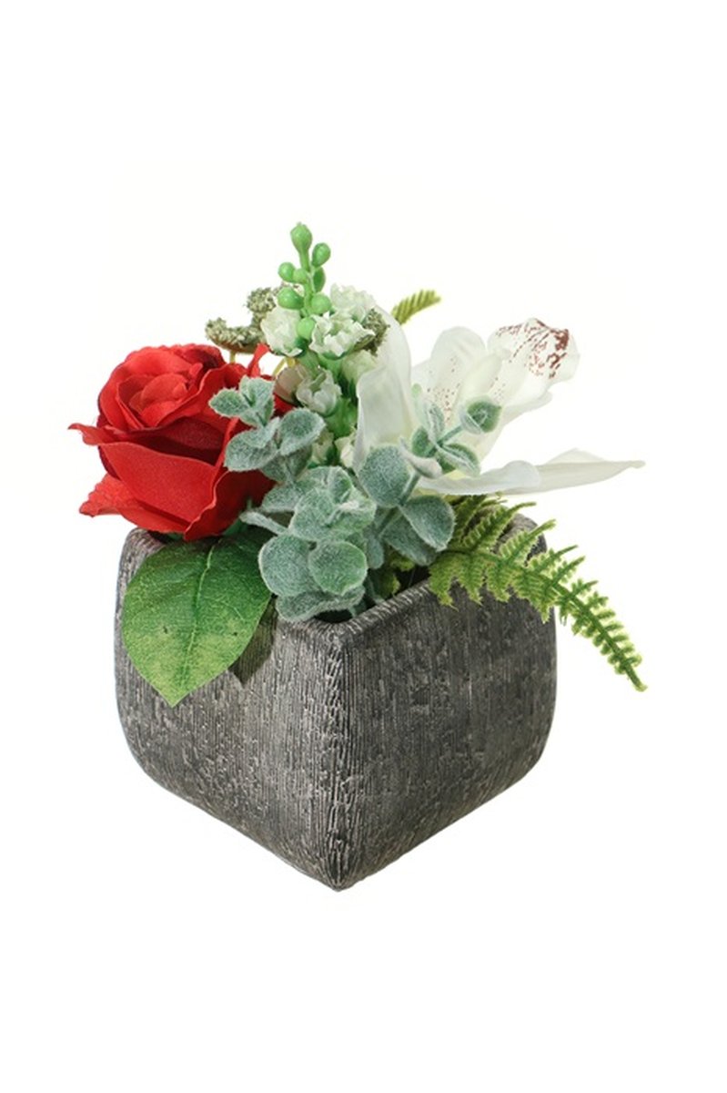 Květinové aranžmá umělá orchidej cymbidium, růže, flox KOVU, dekorativní květináč, červeno-bílá, 20cm, Ø18cm