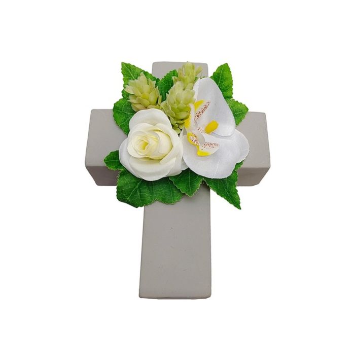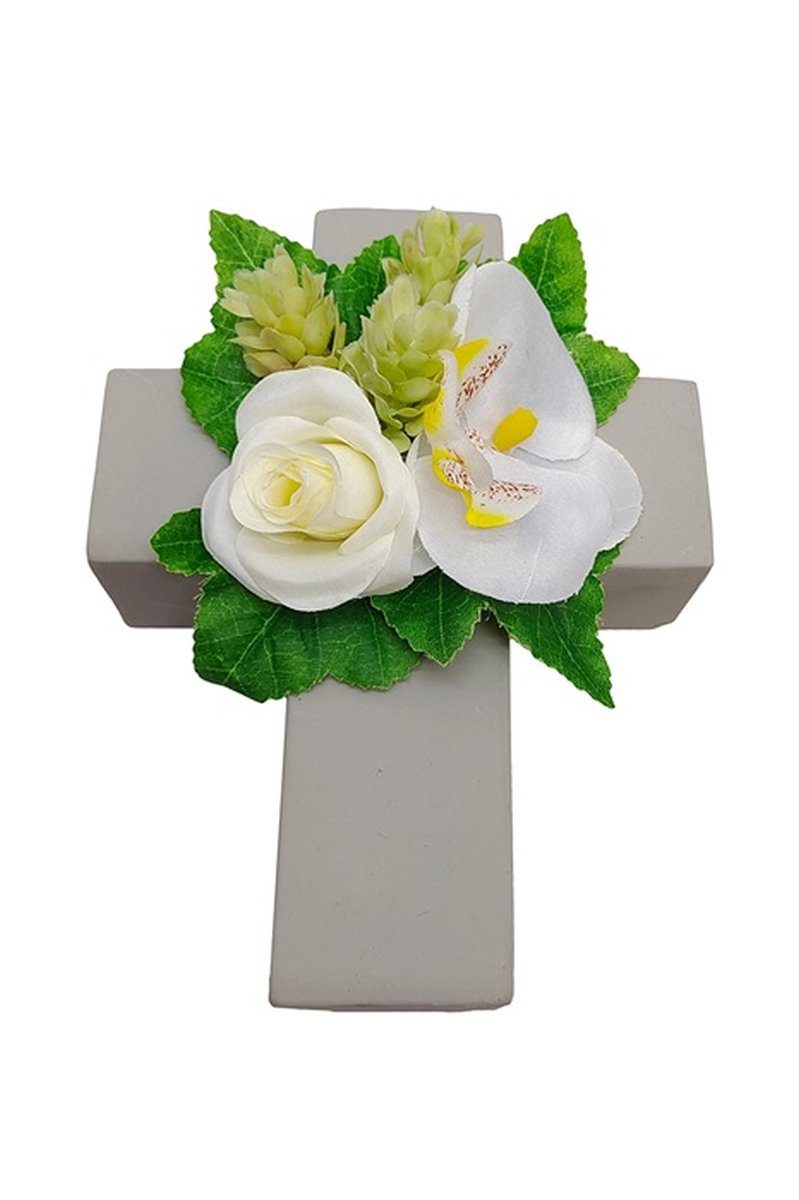 Květinové aranžmá umělá růže, orchidej, chmel ARIADNA, výsadbový kříž, bílá, 20x15x9cm