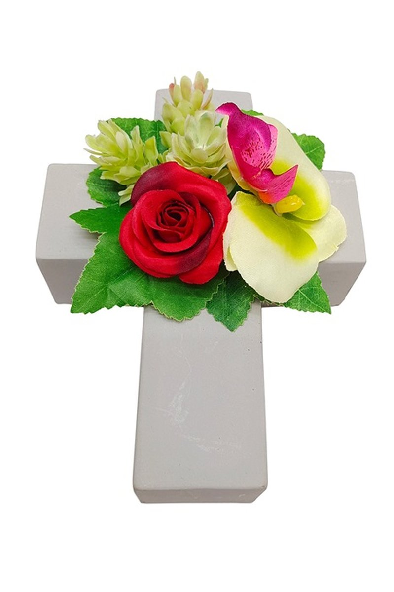 Květinové aranžmá umělá růže, orchidej, chmel ARIADNA, výsadbový kříž, červeno-zeleno-růžová, 20x15x9cm