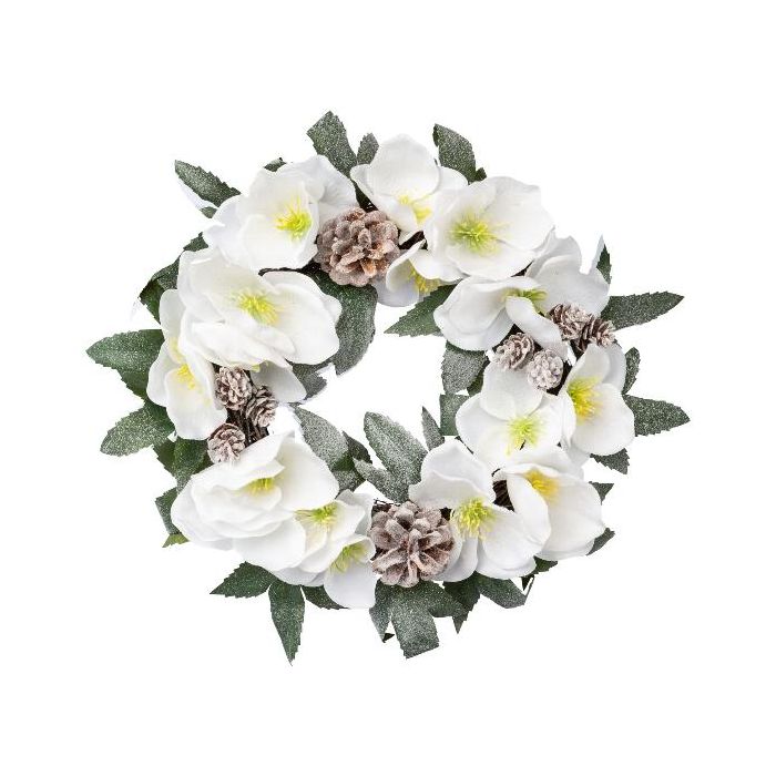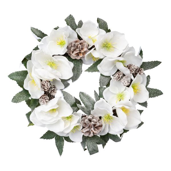 Květinový věnec dekorativní vánoční růže FOGRA, šišky, zmrzlé, bílé, Ø30cm