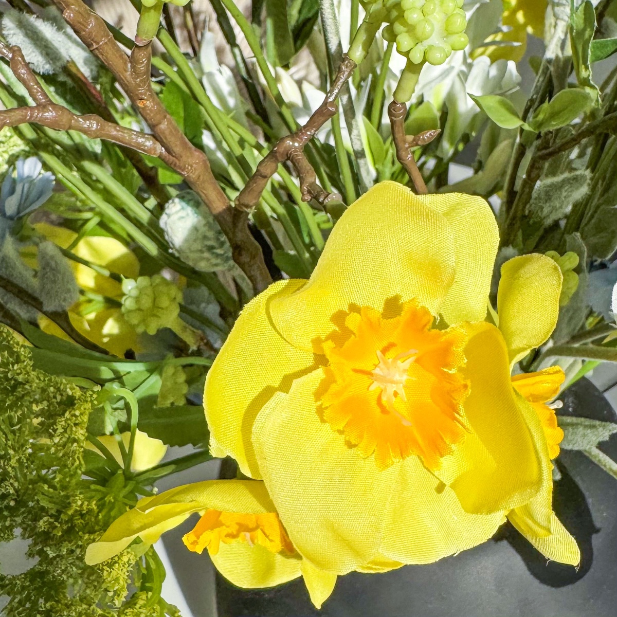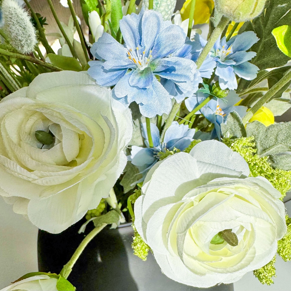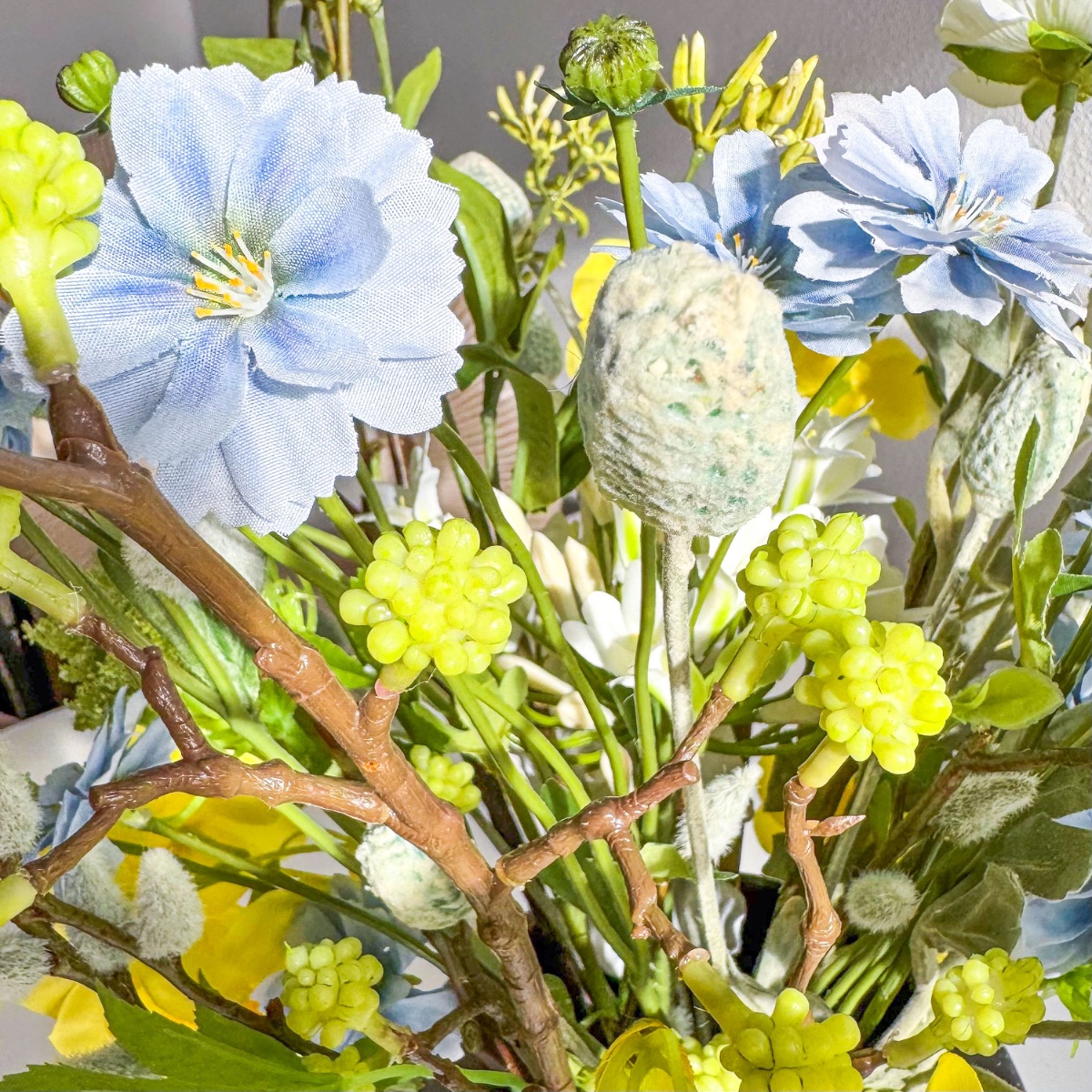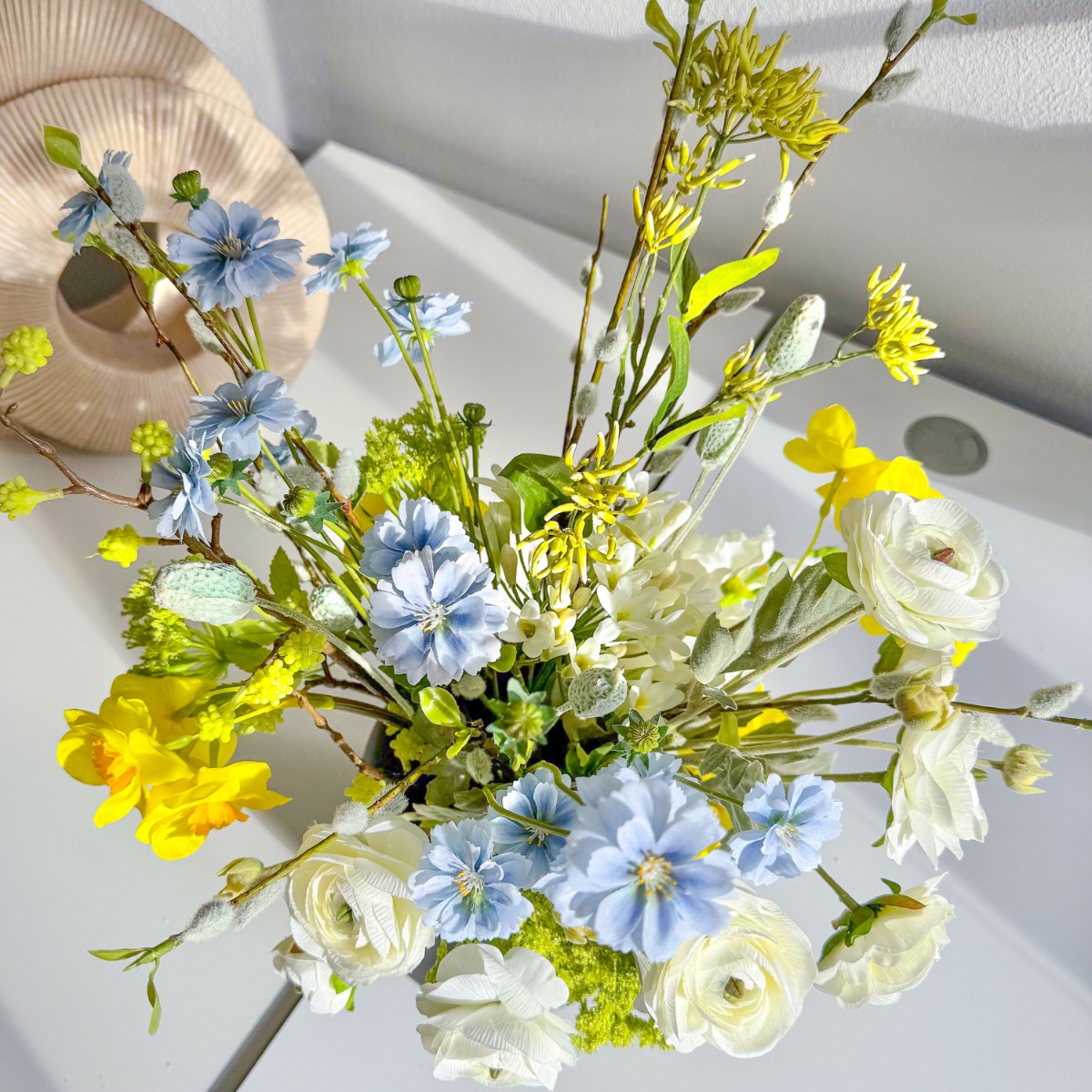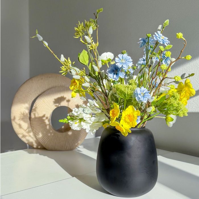 Když jaro nabývá tvaru! Tato kytice vznikla podle fotografie, do které se naše zákaznice okamžitě zamilovala. S velkou citlivostí jsme aranžmá ztvárnili co nejvěrněji – dokonale přizpůsobené uvedené váze. V duchu jara a Velikonoc spojuje svěží lehkost s hravými sezónními akcenty. Kytice žije ze své záměrně uvolněné kompozice: květiny jsou uspořádány v různých výškách a vytvářejí tak živý, téměř taneční celkový dojem. Zatímco bílé ranunky a slunečné žluté narcisy září v dolní až střední části, modré chrpy se hravě táhnou všemi úrovněmi a propojují jednotlivé části – jako barevný jarní pozdrav. Ve spodní části zajišťují bílé agapanthusy plnost a klid uprostřed, zatímco jemně převislá bílá lví tlama dodává aranžmá měkký, plynulý nádech. Divoká mrkev v svěží zelené barvě kompozici odlehčuje a vnáší do ní přirozenou, téměř divokou strukturu. Směrem nahoru se kytice stává stále vzdušnější: dřín, poupata chrpy a vrbové kočičky volně vyčnívají a vytvářejí jemné, grafické akcenty – typické pro probouzející se jarní přírodu. Uprostřed tančí poupata bodláku jako malá velikonoční vajíčka mezi květy a diskrétním, stylovým způsobem navazují na velikonoční atmosféru. Zvláště charakteristický je tvar kytice: není svázána klasicky do kruhu, ale má zajímavé linie – vlevo a vpravo je mírně vyvýšená, zatímco střed je záměrně poněkud nižší. Tato silueta dodává aranžmá moderní, přirozenou dynamiku a činí z něj skutečný unikát. Individuálně vyrobená jarní kytice, která zachycuje lehkost této roční doby. Přiveďte si jaro i k sobě domů. Kupte si tento look!