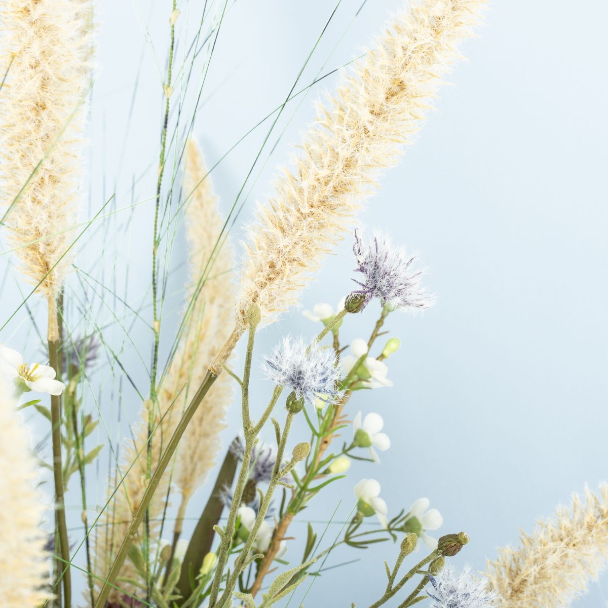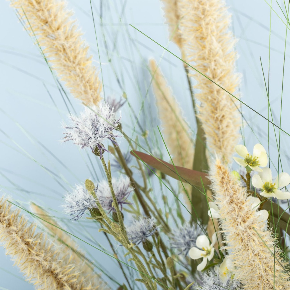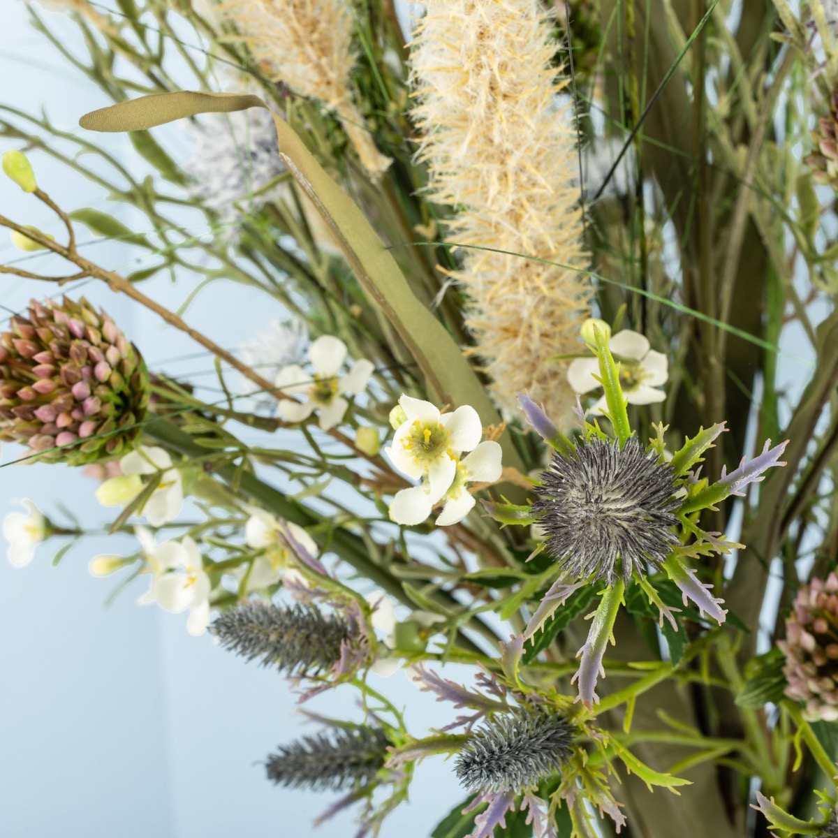 Kytice květin s plážovou atmosférou! Naše zákaznice hledala kytici květin, která by ladila s pobřežní atmosférou jejího pětihvězdičkového rekreačního domu u Baltského moře. Poté, co byla pampová tráva z naší nabídky již součástí výzdoby prázdninového domu, Jeannette znovu vyhledala v našem internetovém obchodě kytici s charakterem Baltského moře. Objevila kytici „FEME“. Docela se jí líbila, ale stále jí chybělo trochu baltského kouzla. Bez dalších okolků nám Jeannette napsala zprávu a požádala o kytici na míru podle svých představ. V prvním pokusu jsme se pokusili dodat kytici „FEME“ požadovaný plážový šmrnc individuálními úpravami. Tento první návrh však ještě nebyl přesvědčivý. Ani přidání dalších travin nepřineslo požadovaný přímořský pocit. Proto jsme všechny naše původní nápady hodili přes palubu a po další konzultaci jsme vytvořili její individuální kytici. Novou kytici jsme pak navrhli s velkými trsy lampového čistce a četnými snítkami divokých květin. Odkaz na pobřeží, jak si ho představovala naše zákaznice, jsme tak mohli naplnit ve všech ohledech. Chtěli byste také kytici s plážovým charakterem? Nakupte si tento vzhled!