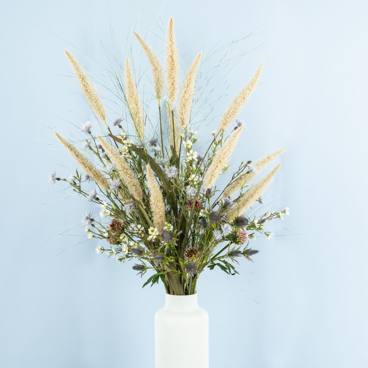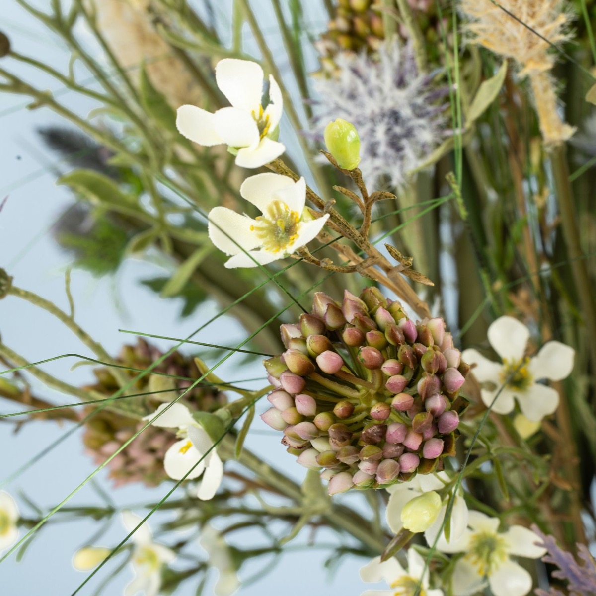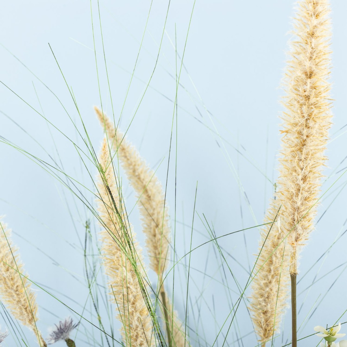 Kytice květin s plážovou atmosférou! Naše zákaznice hledala kytici květin, která by ladila s pobřežní atmosférou jejího pětihvězdičkového rekreačního domu u Baltského moře. Poté, co byla pampová tráva z naší nabídky již součástí výzdoby prázdninového domu, Jeannette znovu vyhledala v našem internetovém obchodě kytici s charakterem Baltského moře. Objevila kytici „FEME“. Docela se jí líbila, ale stále jí chybělo trochu baltského kouzla. Bez dalších okolků nám Jeannette napsala zprávu a požádala o kytici na míru podle svých představ. V prvním pokusu jsme se pokusili dodat kytici „FEME“ požadovaný plážový šmrnc individuálními úpravami. Tento první návrh však ještě nebyl přesvědčivý. Ani přidání dalších travin nepřineslo požadovaný přímořský pocit. Proto jsme všechny naše původní nápady hodili přes palubu a po další konzultaci jsme vytvořili její individuální kytici. Novou kytici jsme pak navrhli s velkými trsy lampového čistce a četnými snítkami divokých květin. Odkaz na pobřeží, jak si ho představovala naše zákaznice, jsme tak mohli naplnit ve všech ohledech. Chtěli byste také kytici s plážovým charakterem? Nakupte si tento vzhled!