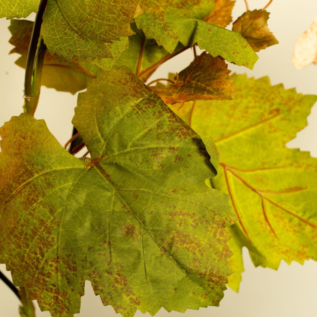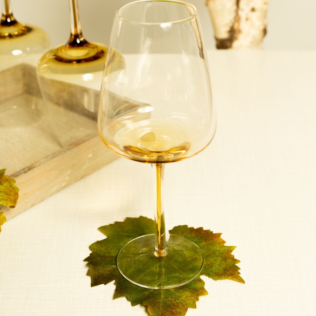 Designový tip: Květiny svažte do kytice a vložte do vázy. V případě potřeby je zkraťte. Vinné listy zavěste na vhodné místo jako kruh nebo rovnou. Sklenice naaranžujte na podnos. Několik vinných listů jsme použili jako podtácky. K tomu je třeba odstranit zelený plast ze zadní strany. Lze jej jednoduše odloupnout.