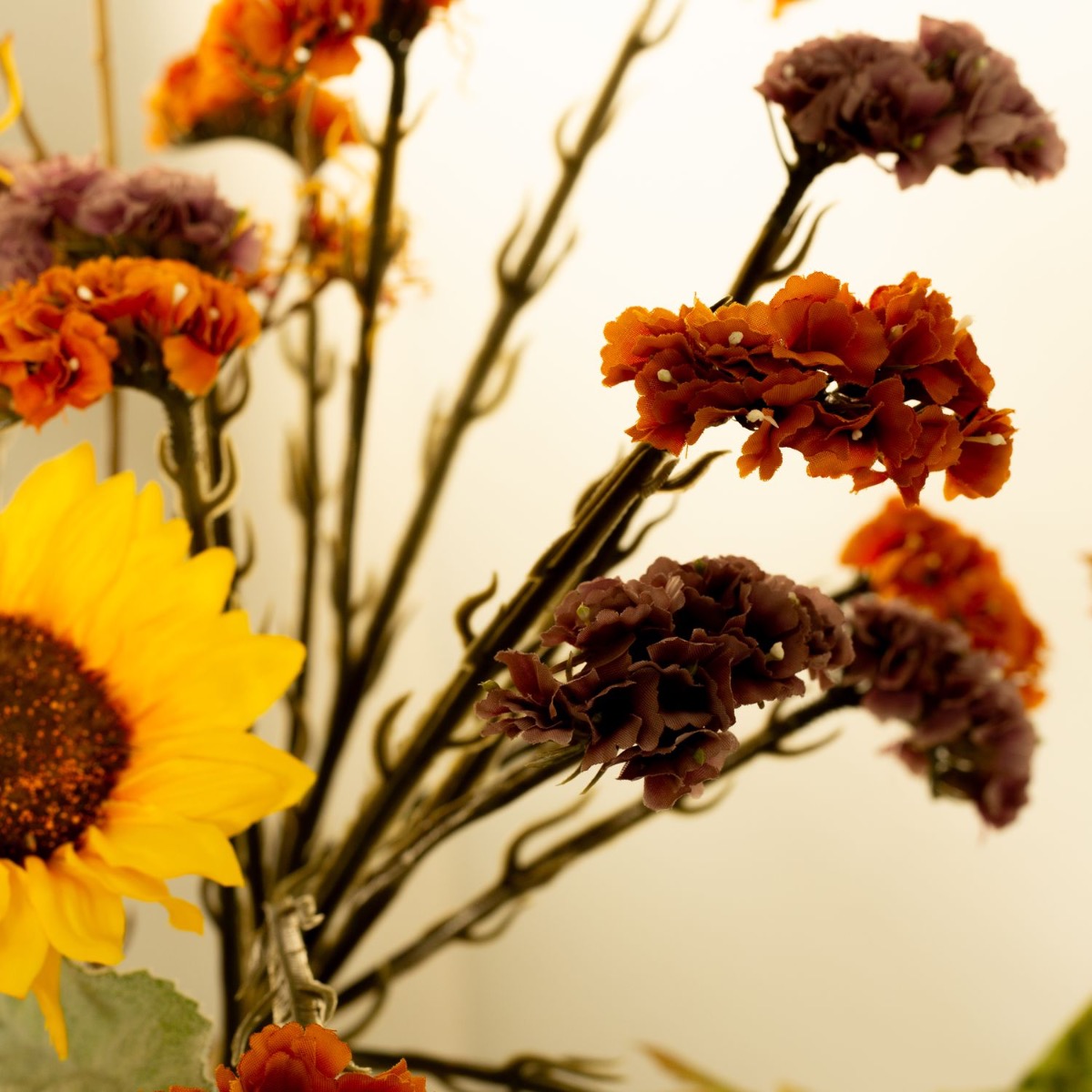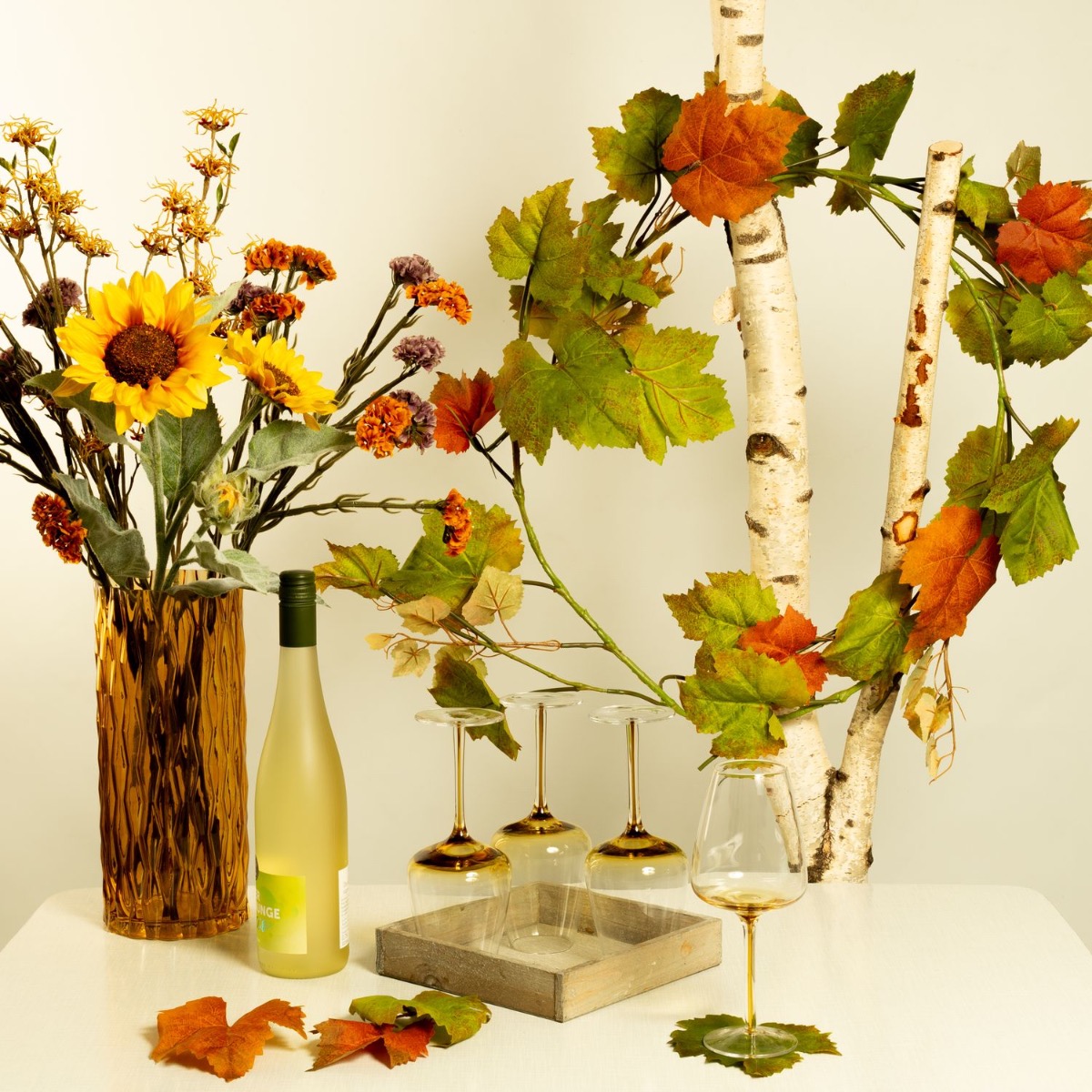 Víno a květiny! V létě je život jednodušší. Není nic lepšího než si večer vychutnat sklenku vína. Naše sklenice na víno s oranžovým barevným gradientem jsou skutečným poutačem na oči a skvěle se hodí k velké válcové váze se strukturou. Listy vinné révy a okouzlující kytice pozdně letních květů dotvářejí vzhled a vytvářejí hřejivou atmosféru pozdního léta. Nakupte si tento vzhled!