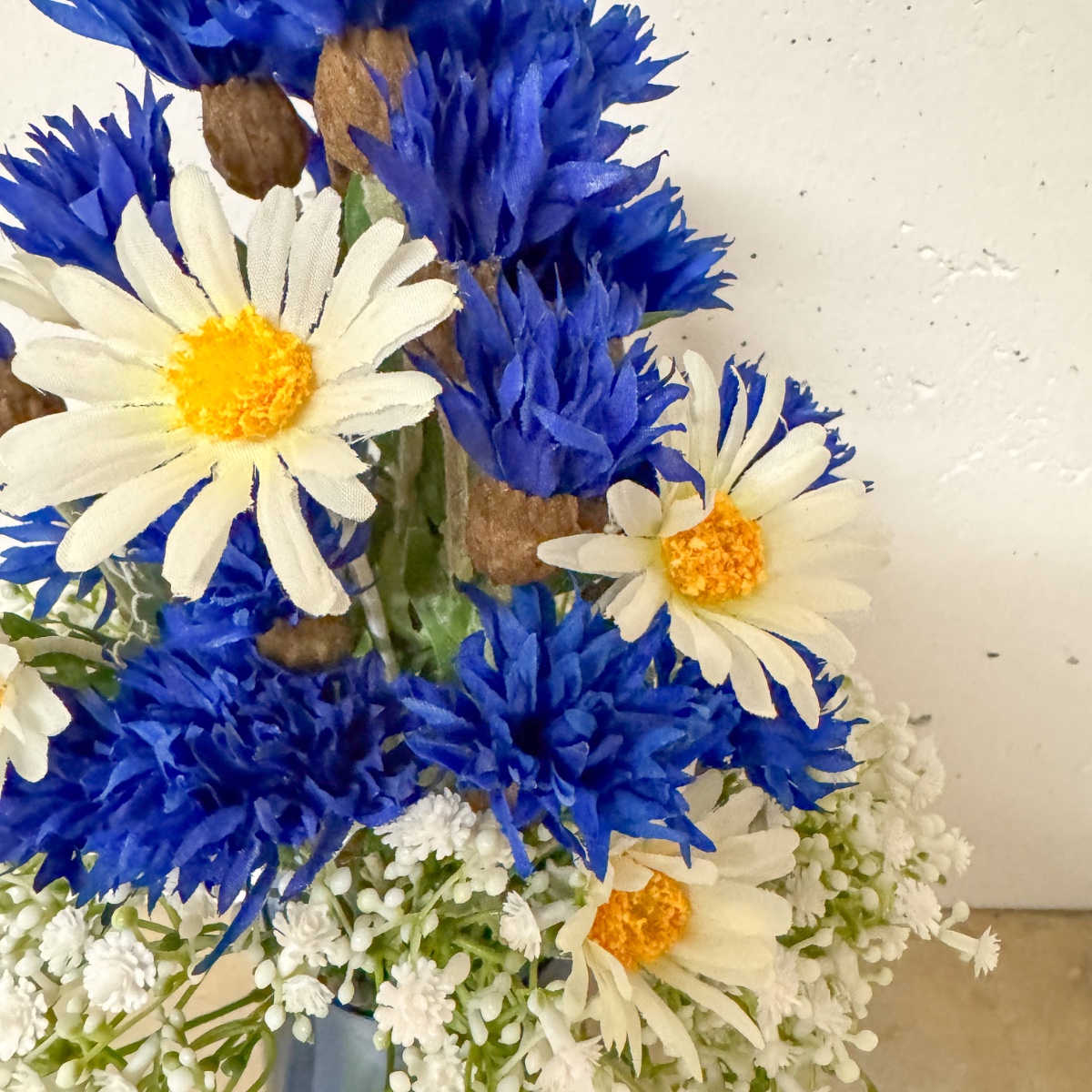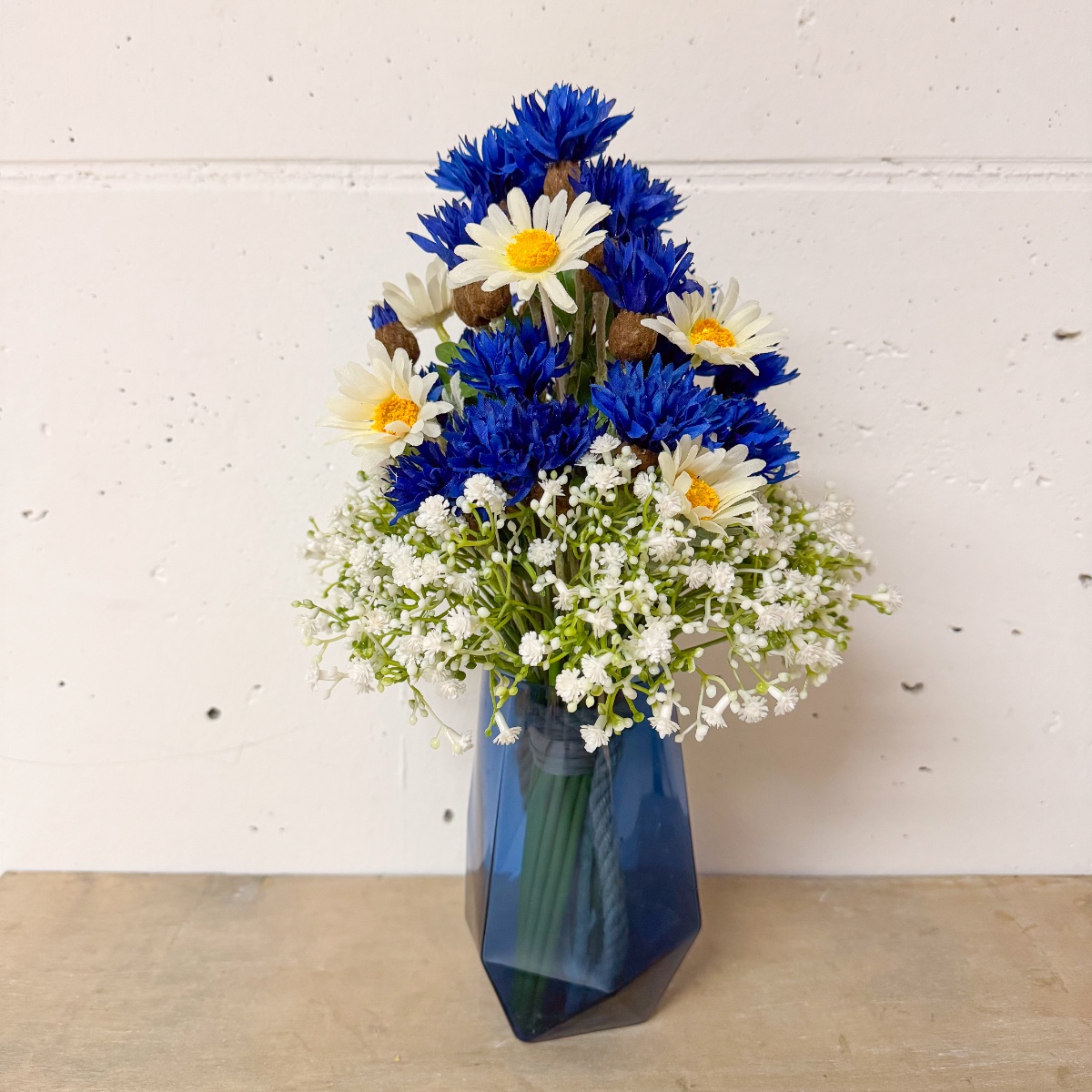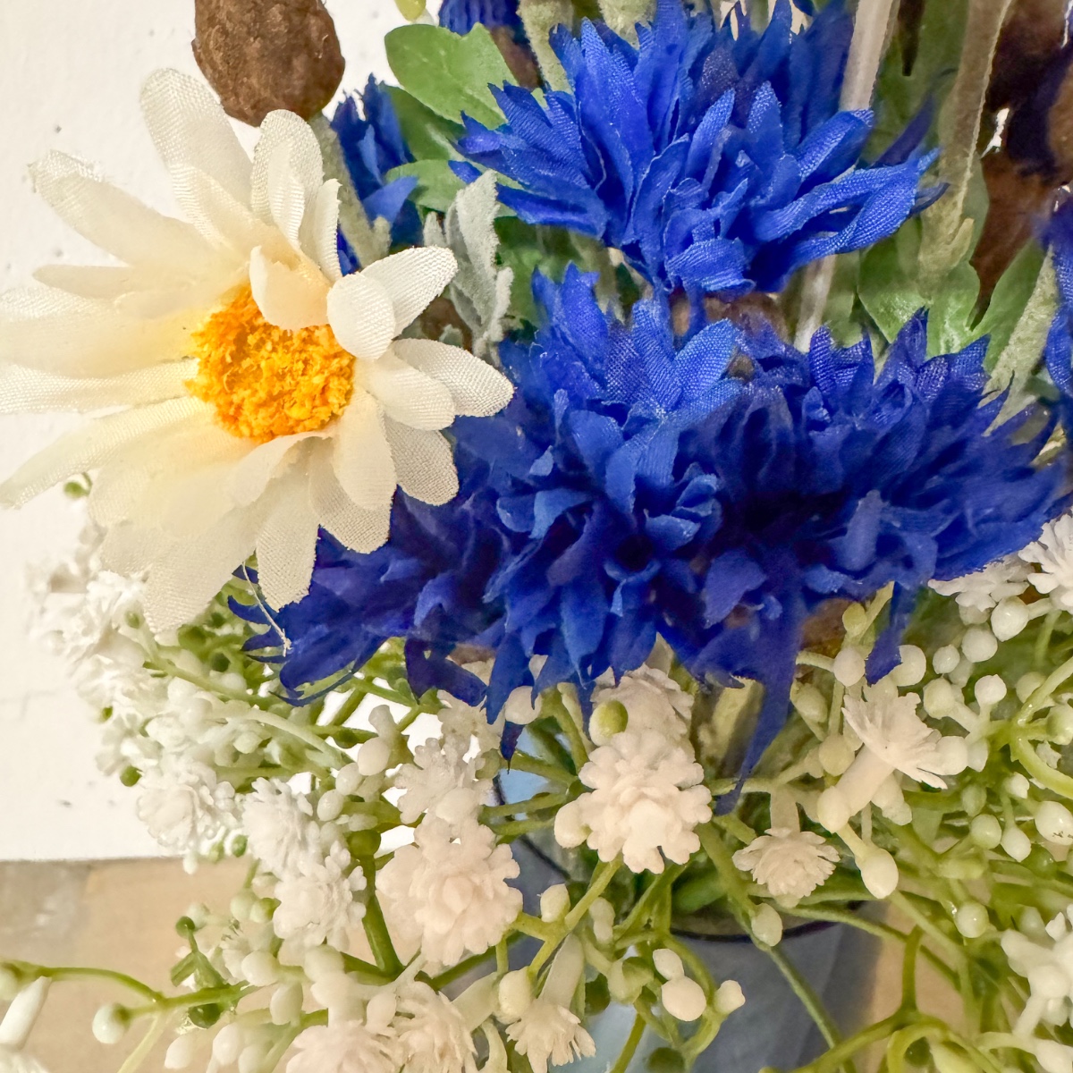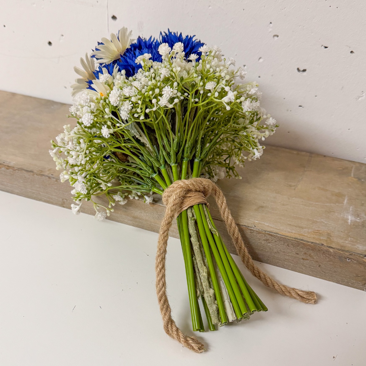 Svatební láska! Takto vypadá bavorský svatební kytice. Jako překvapení jsme dostali za úkol z umělých květin vytvořit svatební kytici, která bohužel již zvadla. Zářivě modré chrpy, jemné sedmikrásky a gypsophila zdobí tuto pyramidovou svatební kytici a vnášejí do oslavy nádech romantiky. Gypsophila symbolizuje upřímnou lásku. Sedmikrásky znamenají věrnost a chrpy naznačují pozitivní budoucnost. Hnědá jutová šňůrka podtrhuje venkovský vzhled. Kupte si tento look!