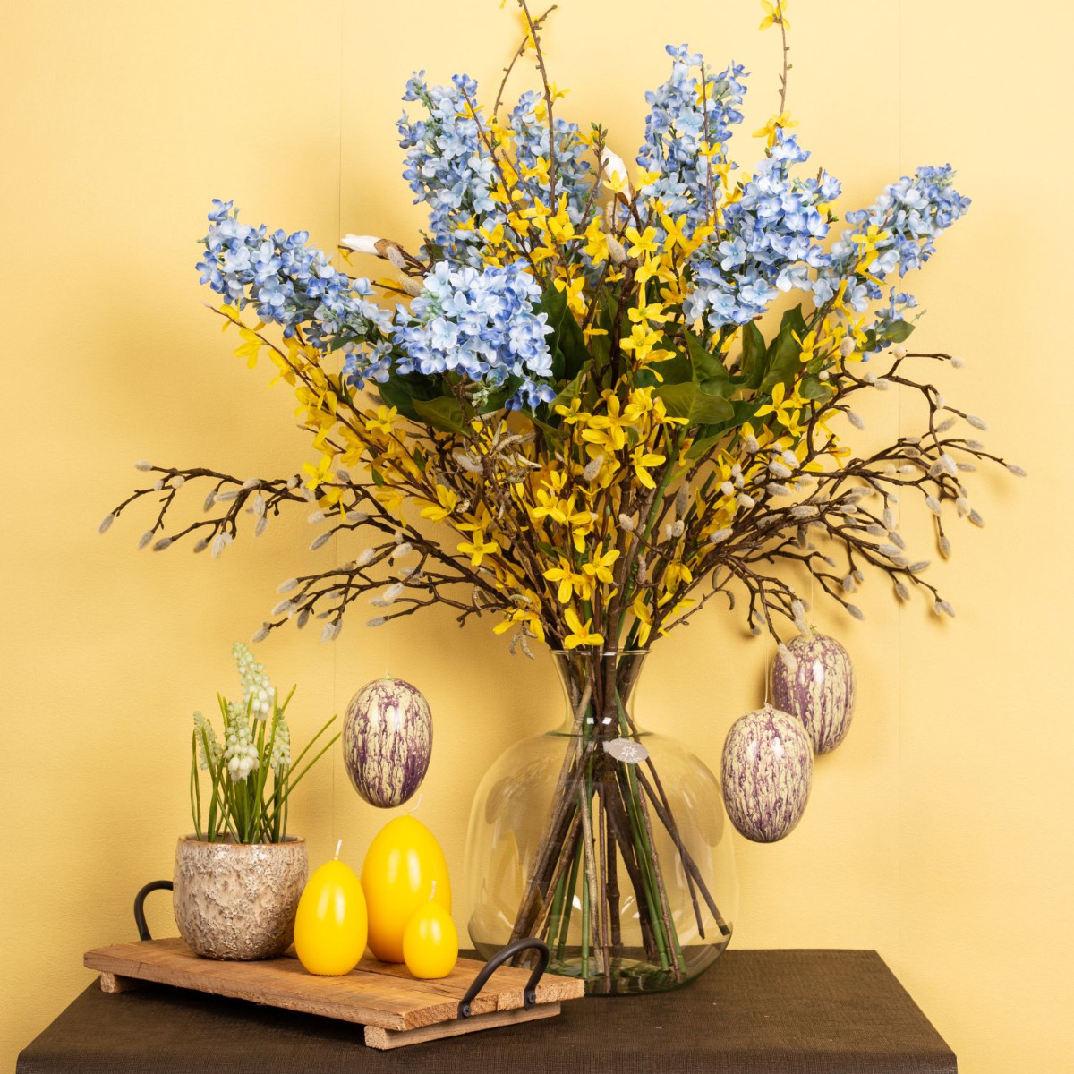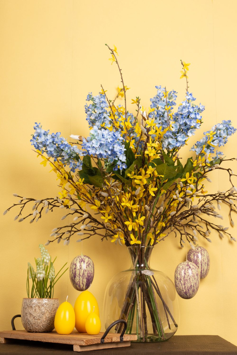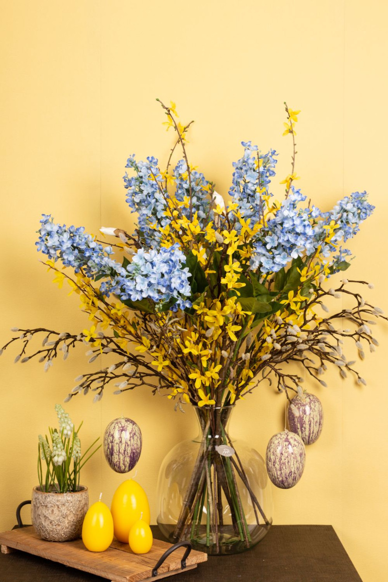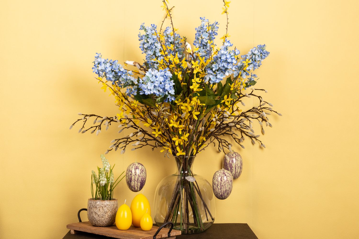 Jednoduché a přirozené! Dlouhá zima konečně skončila a první sluneční paprsky vykouzlily v přírodě první květy. Konečně se zase začíná oteplovat! Magnólie a březové větvičky vypadají, jako by byly ručně natrhané, a jsou ideální pro zavěšení několika velikonočních vajíček. Bílé hyacinty jsou v přírodě k vidění opravdu vzácně. Tady se obzvlášť dobře hodí k bílým nadýchaným poupatům magnólie. Tento vzhled jsme rozšířili o 5 žlutých větviček forzýtie a modrý šeřík. Ať hon na velikonoční vajíčka může začít! Nakupte si tento vzhled!