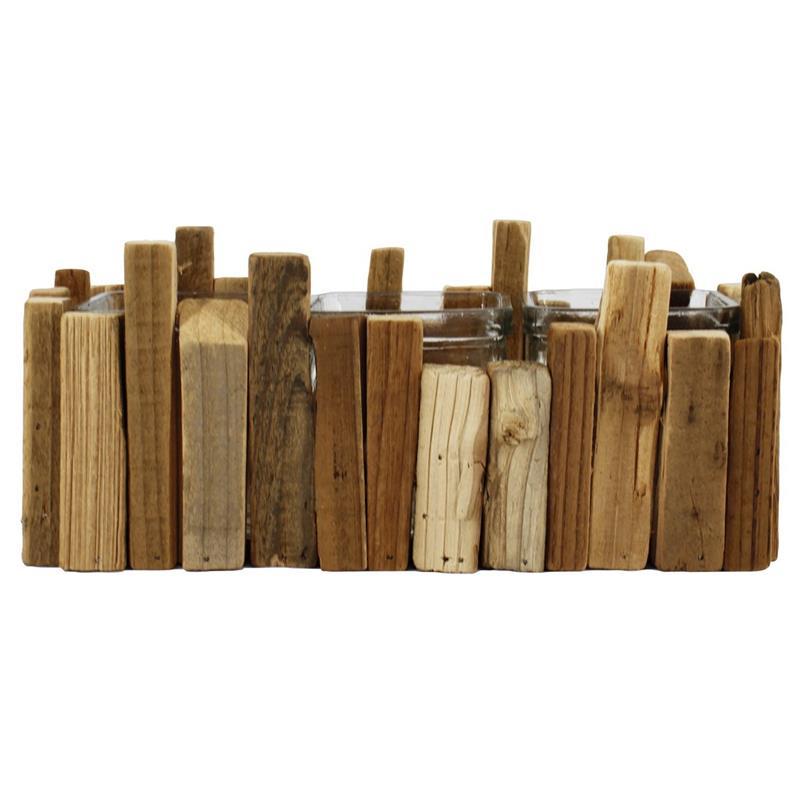 Maxi držák na čajovou svíčku SEAN, 3 skleničky, v dřevěném rámu, čirý-béžový, 28x10,5x11cm