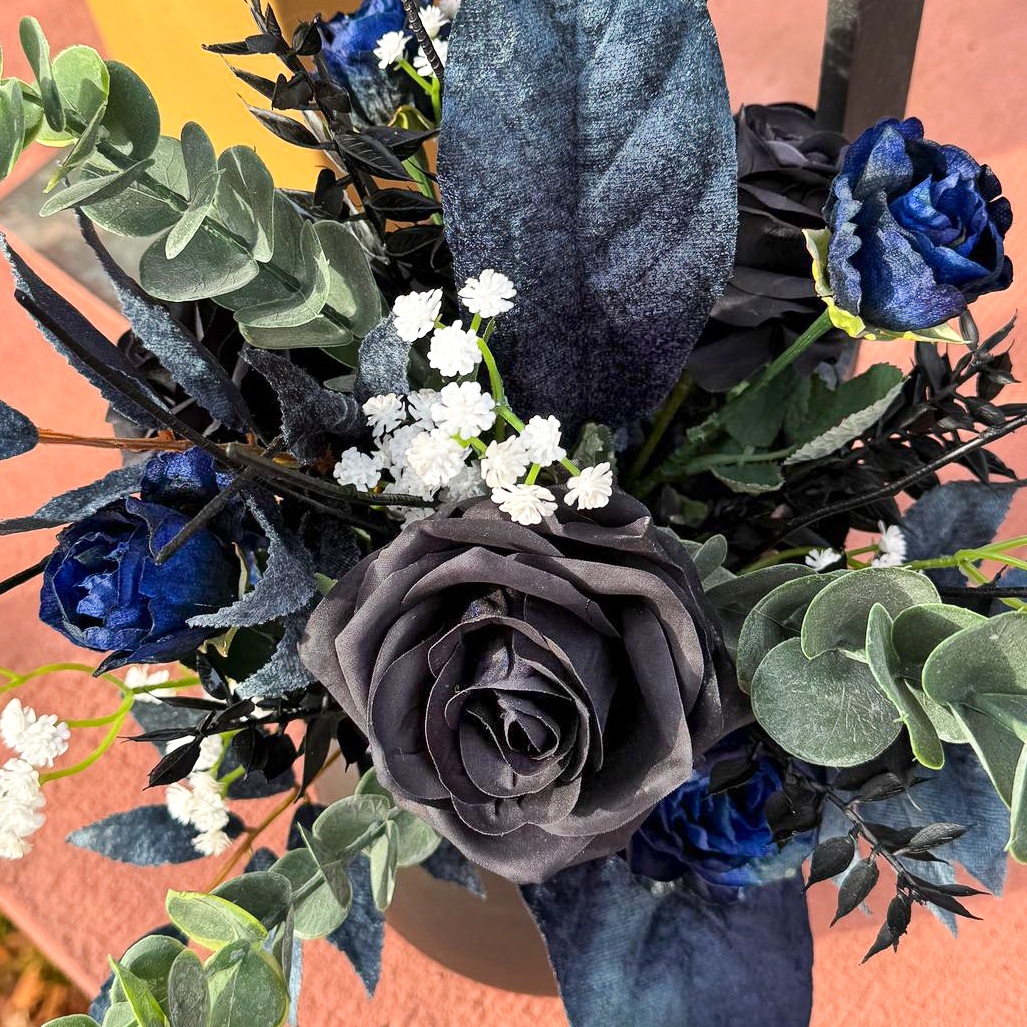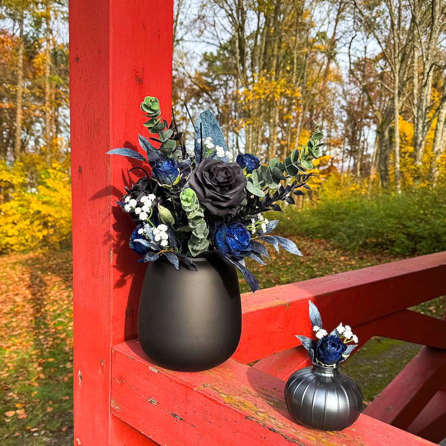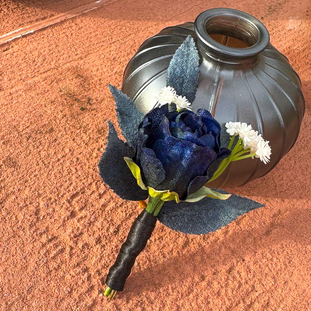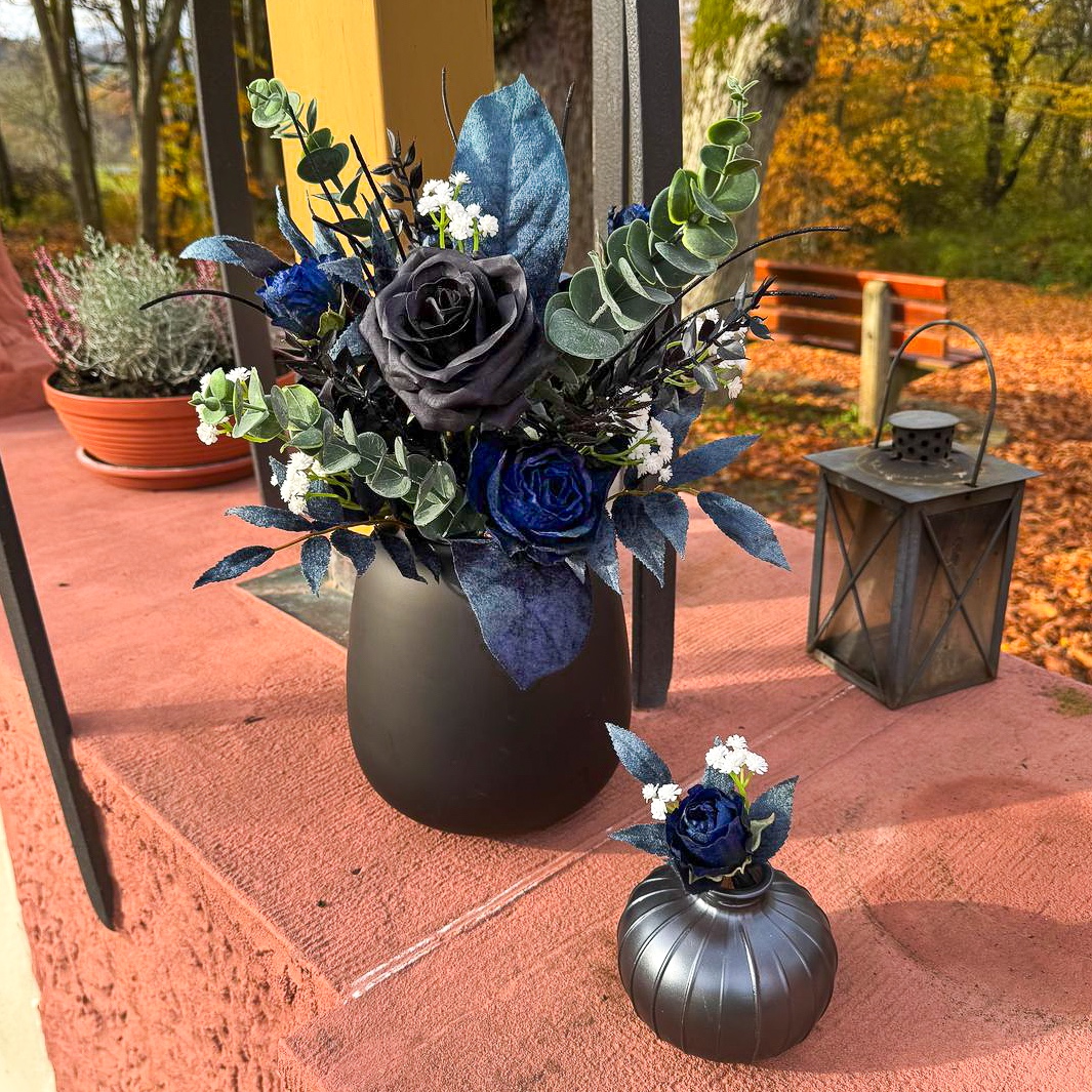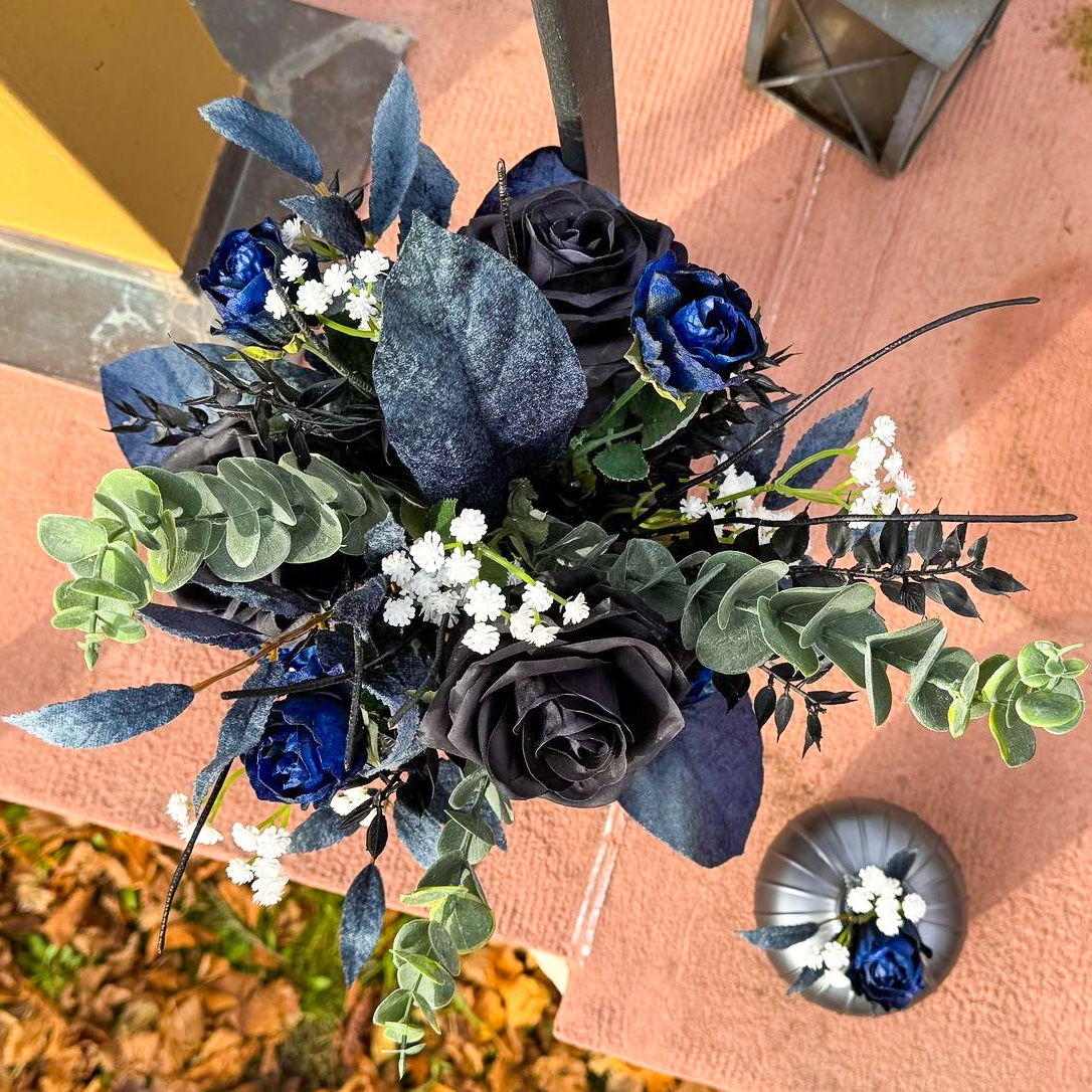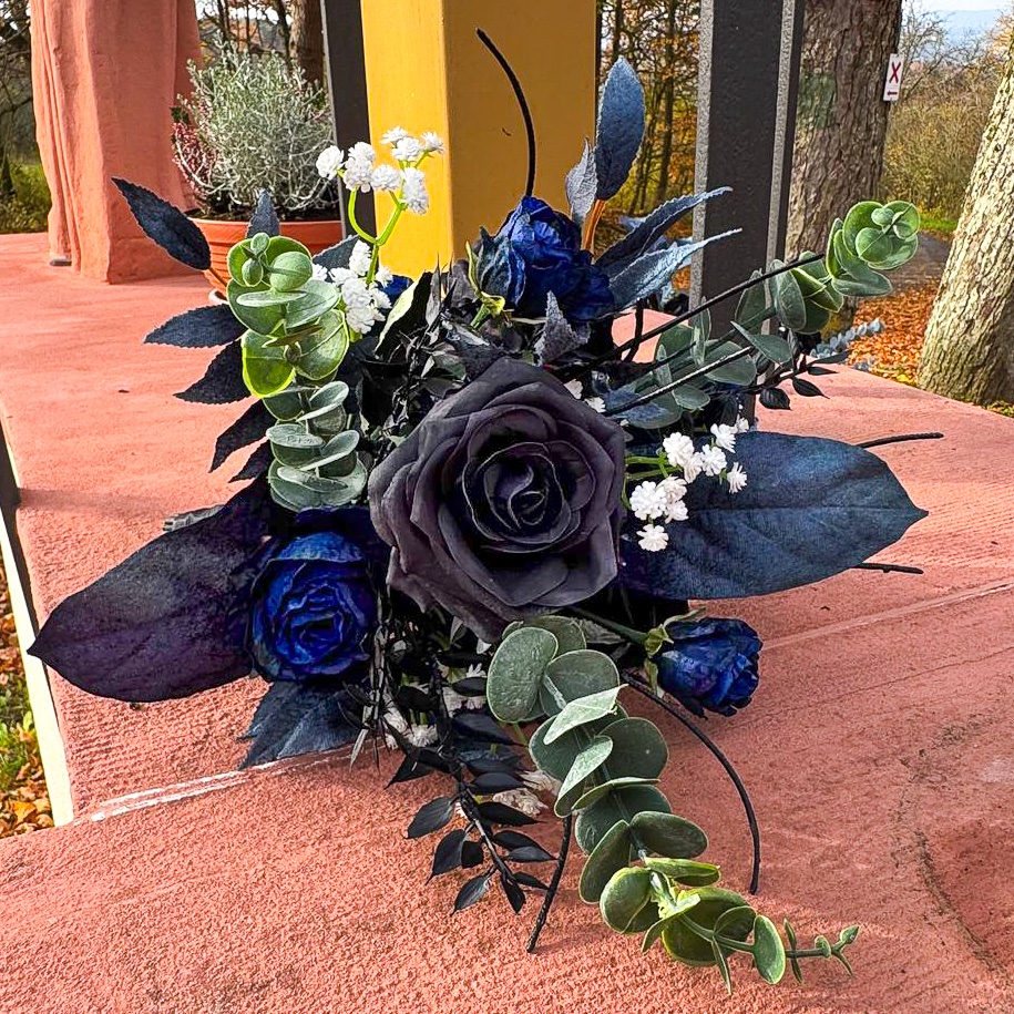 Když se květinové umění setká s nadčasovou elegancí! Pro pohádkovou svatbu na idylickém poloostrově v jižní Francii jsme měli tu čest navrhnout kompletní květinovou výzdobu. Oslava se konala v polovině listopadu – v období, kdy se elegance a hloubka barevného ladění projeví obzvláště účinně. Zákaznice si přála moderní, elegantní koncept v černé a tmavě modré barvě, doplněný jemnými bílými akcenty pro klasický svatební dojem. Všechny tmavě modré prvky dostaly sametový povrch, který zejména v chladnějším ročním období působí elegantně a teple. Svatební kytice a odpovídající klopová květina pro ženicha tvoří jádro celého floristického konceptu – harmonicky sladěné a stylově určující pro všechny další aranžmá. Chcete také oslavit svou svatbu s umělými květinami? Shop the Look!